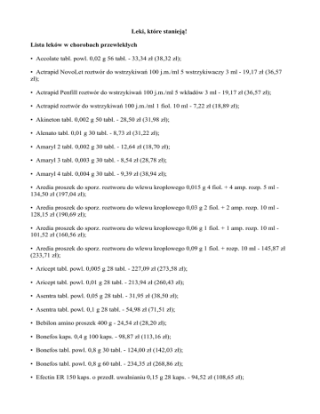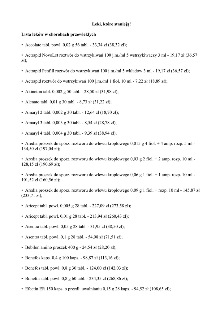 Leki, które stanieją! Lista leków w chorobach przewlekłych • Accolate tabl. powl. 0,02 g 56 tabl. - 33,34 zł (38,32 zł); • Actrapid NovoLet roztwór do wstrzykiwań 100 j.m./ml 5 wstrzykiwaczy 3 ml - 19,17 zł (36,57 zł); • Actrapid Penfill roztwór do wstrzykiwań 100 j.m./ml 5 wkładów 3 ml - 19,17 zł (36,57 zł); • Actrapid roztwór do wstrzykiwań 100 j.m./ml 1 fiol. 10 ml - 7,22 zł (18,89 zł); • Akineton tabl. 0,002 g 50 tabl. - 28,50 zł (31,98 zł); • Alenato tabl. 0,01 g 30 tabl. - 8,73 zł (31,22 zł); • Amaryl 2 tabl. 0,002 g 30 tabl. - 12,64 zł (18,70 zł); • Amaryl 3 tabl. 0,003 g 30 tabl. - 8,54 zł (28,78 zł); • Amaryl 4 tabl. 0,004 g 30 tabl. - 9,39 zł (38,94 zł); • Aredia proszek do sporz. roztworu do wlewu kroplowego 0,015 g 4 fiol. + 4 amp. rozp. 5 ml 134,50 zł (197,04 zł); • Aredia proszek do sporz. roztworu do wlewu kroplowego 0,03 g 2 fiol. + 2 amp. rozp. 10 ml 128,15 zł (190,69 zł); • Aredia proszek do sporz. roztworu do wlewu kroplowego 0,06 g 1 fiol. + 1 amp. rozp. 10 ml 101,52 zł (160,56 zł); • Aredia proszek do sporz. roztworu do wlewu kroplowego 0,09 g 1 fiol. + rozp. 10 ml - 145,87 zł (233,71 zł); • Aricept tabl. powl. 0,005 g 28 tabl. - 227,09 zł (273,58 zł); • Aricept tabl. powl. 0,01 g 28 tabl. - 213,94 zł (260,43 zł); • Asentra tabl. powl. 0,05 g 28 tabl. - 31,95 zł (38,50 zł); • Asentra tabl. powl. 0,1 g 28 tabl. - 54,98 zł (71,51 zł); • Bebilon amino proszek 400 g - 24,54 zł (28,20 zł); • Bonefos kaps. 0,4 g 100 kaps. - 98,87 zł (113,16 zł); • Bonefos tabl. powl. 0,8 g 30 tabl. - 124,00 zł (142,03 zł); • Bonefos tabl. powl. 0,8 g 60 tabl. - 234,35 zł (268,86 zł); • Efectin ER 150 kaps. o przedł. uwalnianiu 0,15 g 28 kaps. - 94,52 zł (108,65 zł); • Efectin ER 75 kaps. o przedł. uwalnianiu 0,075 g 28 kaps. - 53,93 zł (61,99 zł); • Emetron tabl. powl. 0,008 g 10 tabl. - 3,20 zł (12,63 zł); • Exelon kaps. 0,0015 g 28 kaps. - 43,35 zł (49,83 zł); • Exelon kaps. 0,003 g 28 kaps. - 48,58 zł (55,84 zł); • Exelon kaps. 0,003 g 56 kaps. - 86,70 zł (99,66 zł); • Exelon kaps. 0,0045 g 28 kaps. - 48,58 zł (55,85 zł); • Exelon kaps. 0,0045 g 56 kaps. - 86,70 zł (99,66 zł); • Exelon kaps. 0,006 g 28 kaps. - 48,58 zł (55,84 zł); • Exelon kaps. 0,006 g 56 kaps. - 86,70 zł (99,66 zł); • Exelon płyn 0,002 g/ml 120 ml - 132,29 zł (152,06 zł); • Femara tabl. 0,0025 g 30 tabl. - 30,04 zł (90,27 zł); • Fevarin tabl. powl. 0,05 g 60 tabl. - 51,75 zł (58,83 zł); • Fevarin tabl. powl. 0,1 g 30 tabl. - 51,75 zł (61,38 zł); • Foradil proszek do inhalacji w kaps. 0,012 mg 30 kaps. + inhalator - 13,27 zł (19,89 zł); • Foradil proszek do inhalacji w kaps. 0,012 mg 60 kaps. + inhalator - 18,97 zł (31,55 zł); • Glibenese GITS tabl. o przedł. uwalnianiu 0,01 g 30 tabl. - 35,20 zł (40,05 zł); • Humaject M3 (30/70) zaw. do wstrzykiwań i.m. i s.c. 100 j.m./ml 5 wstrzykiwaczy 3 ml - 18,98 zł (36,35 zł); • Humaject N zaw. do wstrzykiwań i.m. i s.c. 100 j.m./ml 5 wstrzykiwaczy 3 ml - 18,98 zł (36,35 zł); • Humaject R roztwór do wstrzykiwań 100 j.m./ml 5 wstrzykiwaczy 3 ml - 18,98 zł (36,35 zł); • Humalog Mix 25 zaw. do wstrzykiwań 100 j.m./ml 5 wkładów 3 ml - 41,35 zł (62,07 zł); • Humalog Mix 50 zaw. do wstrzykiwań 100 j.m./ml 5 wkładów 3 ml - 41,35 zł (62,07 zł); • Humalog roztwór do wstrzykiwań s.c. 100 j.m./ml 5 wkładów 3 ml - 41,35 zł (62,07 zł); • Humulin M3 (30/70) zaw. do wstrzykiwań 100 j.m./ml 5 wkładów 3 ml - 18,98 zł (36,35 zł); • Humulin N zaw. do wstrzykiwań 100 j.m./ml 5 wkładów 3 ml - 18,98 zł (36,35 zł); • Humulin R roztwór do wstrzykiwań 100 j.m./ml 5 wkładów 3 ml - 18,98 zł (36,35 zł); • Imuran tabl. powl. 0,025 g 100 tabl. - 1,89 zł (7,74 zł); • Imuran tabl. powl. 0,05 g 100 tabl. - 0,00 zł (9,03 zł); • Insulatard Innolet zaw. do wstrzykiwań 100 j.m./ml 5 wstrzykiwaczy 3 ml - 19,17 zł (36,57 zł); • Insulatard NovoLet zaw. do wstrzykiwań 100 j.m./ml 5 wstrzykiwaczy 3 ml - 19,17 zł (36,57 zł); • Insuman Basal zaw. do wstrzykiwań 100 j.m./ml 5 wkładów 3 ml - 8,06 zł (23,80 zł); • Insuman Comb 25 zaw. do wstrzykiwań 100 j.m./ml 5 wkładów 3 ml - 8,06 zł (23,80 zł); • Insuman Rapid roztwór do wstrzykiwań 100 j.m./ml 5 wkładów 3 ml - 8,06 zł (23,80 zł); • Kreon 25 000 kaps. dojelitowe NULL 50 kaps. - 10,28 zł (19,03 zł); • Megace 160 tabl. 0,16 g 100 tabl. - 81,54 zł (119,91 zł); • Megesin tabl. 0,16 g 100 tabl. - 3,20 zł (29,87 zł); • Mixtard 10 NovoLet zaw. do wstrzykiwań 100 j.m./ml 5 wstrzykiwaczy 3 ml - 19,17 zł (36,57 zł); • Mixtard 20 NovoLet zaw. do wstrzykiwań 100 j.m./ml 5 wstrzykiwaczy 3 ml - 19,17 zł (36,57 zł); • Mixtard 30 Innolet zaw. do wstrzykiwań 100 j.m./ml 5 wstrzykiwaczy 3 ml - 19,17 zł (36,57 zł); • Mixtard 30 NovoLet zaw. do wstrzykiwań 100 j.m./ml 5 wstrzykiwaczy 3 ml - 19,17 zł (36,57 zł); • Mixtard 40 NovoLet zaw. do wstrzykiwań 100 j.m./ml 5 wstrzykiwaczy 3 ml - 19,17 zł (36,57 zł); • Mixtard 50 NovoLet zaw. do wstrzykiwań 100 j.m./ml 5 wstrzykiwaczy 3 ml - 19,17 zł (36,57 zł); • MST Continus tabl. powl. o zmod. uwalnianiu 0,2 g 60 tabl. - 0,00 zł (9,77 zł); • Nakom tabl. 0,025 g + 0,25 g 100 tabl. - 21,53 zł (28,43 zł); • Navoban kaps. 0,005 g 5 kaps. - 99,29 zł (106,94 zł); • Neurontin kaps. 0,4 g 100 kaps. - 27,73 zł (31,39 zł); • Oxis Turbuhaler proszek do inhalacji 0,0045 mg/dawkę 60 dawek/pojemnik - 15,68 zł (23,68 zł); • Oxis Turbuhaler proszek do inhalacji 0,009 mg/dawkę 60 dawek/pojemnik - 18,97 zł (31,54 zł); • Rexetin tabl. powl. 0,02 g 30 tabl. - 38,78 zł (51,07 zł); • Rilutek tabl. powl. 0,05 g 56 tabl. - 292,86 zł (336,62 zł); • Rispolept roztwór doustny 0,001 g/ml 100 ml - 37,63 zł (73,92 zł); • Rispolept roztwór doustny 0,001 g/ml 30 ml - 18,88 zł (30,57 zł); • Rispolept tabl. powl. 0,001 g 20 tabl. - 14