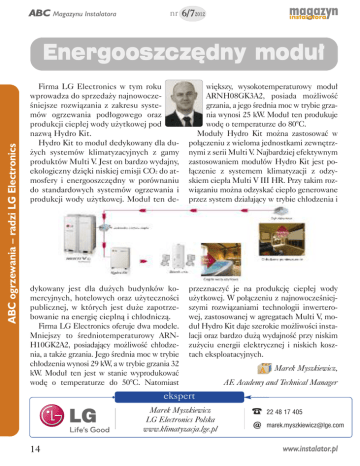 ABC Magazynu Instalatora nr 6/72012 ABC ogrzewania – radzi LG Electronics Energooszczędny moduł Firma LG Electronics w tym roku wprowadza do sprzedaży najnowocześniejsze rozwiązania z zakresu systemów ogrzewania podłogowego oraz produkcji ciepłej wody użytkowej pod nazwą Hydro Kit. Hydro Kit to moduł dedykowany dla dużych systemów klimatyzacyjnych z gamy produktów Multi V. Jest on bardzo wydajny, ekologiczny dzięki niskiej emisji CO2 do atmosfery i energooszczędny w porównaniu do standardowych systemów ogrzewania i produkcji wody użytkowej. Moduł ten de- większy, wysokotemperaturowy moduł ARNH08GK3A2, posiada możliwość grzania, a jego średnia moc w trybie grzania wynosi 25 kW. Moduł ten produkuje wodę o temperaturze do 80°C. Moduły Hydro Kit można zastosować w połączeniu z wieloma jednostkami zewnętrznymi z serii Multi V. Najbardziej efektywnym zastosowaniem modułów Hydro Kit jest połączenie z systemem klimatyzacji z odzyskiem ciepła Multi V III HR. Przy takim rozwiązaniu można odzyskać ciepło generowane przez system działający w trybie chłodzenia i dykowany jest dla dużych budynków komercyjnych, hotelowych oraz użyteczności publicznej, w których jest duże zapotrzebowanie na energię cieplną i chłodniczą. Firma LG Electronics oferuje dwa modele. Mniejszy to średniotemperaturowy ARNH10GK2A2, posiadający możliwość chłodzenia, a także grzania. Jego średnia moc w trybie chłodzenia wynosi 29 kW, a w trybie grzania 32 kW. Moduł ten jest w stanie wyprodukować wodę o temperaturze do 50°C. Natomiast przeznaczyć je na produkcję ciepłej wody użytkowej. W połączeniu z najnowocześniejszymi rozwiązaniami technologii inwerterowej, zastosowanej w agregatach Multi V, moduł Hydro Kit daje szerokie możliwości instalacji oraz bardzo dużą wydajność przy niskim zużyciu energii elektrycznej i niskich kosztach eksploatacyjnych. MarekMyszkiewicz, AEAcademyandTechnicalManager ekspert MarekMyszkiewicz LGElectronicsPolska www.klimatyzacja.lge.pl 14 ☎ 22 48 17 405 @ [email protected] www.instalator.pl