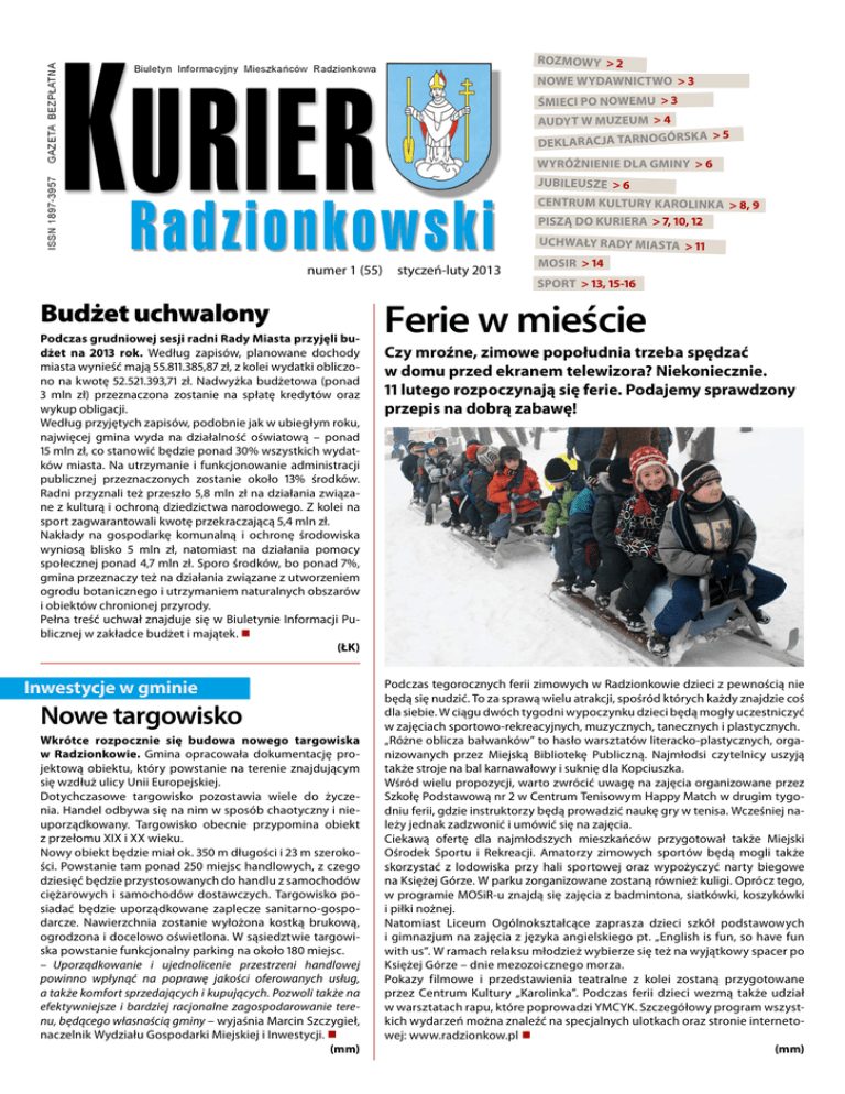 ROZMOW y > 2 Nowe wydawnictwo > 3 śmieci po nowemu > 3 audyt w muzeum > 4 rsk a > 5 Deklaracja tarnogó wyróżnienie dla gminy > 6 JUBILEUSZE > 6 CENTRUM KULTURY KAROLINKA > 8, 9 PISZĄ DO KURIERA > 7, 10, 12 numer 1 (55) Budżet uchwalony Podczas grudniowej sesji radni Rady Miasta przyjęli budżet na 2013 rok. Według zapisów, planowane dochody miasta wynieść mają 55.811.385,87 zł, z kolei wydatki obliczono na kwotę 52.521.393,71 zł. Nadwyżka budżetowa (ponad 3 mln zł) przeznaczona zostanie na spłatę kredytów oraz wykup obligacji. Według przyjętych zapisów, podobnie jak w ubiegłym roku, najwięcej gmina wyda na działalność oświatową – ponad 15 mln zł, co stanowić będzie ponad 30% wszystkich wydatków miasta. Na utrzymanie i funkcjonowanie administracji publicznej przeznaczonych zostanie około 13% środków. Radni przyznali też przeszło 5,8 mln zł na działania związane z kulturą i ochroną dziedzictwa narodowego. Z kolei na sport zagwarantowali kwotę przekraczającą 5,4 mln zł. Nakłady na gospodarkę komunalną i ochronę środowiska wyniosą blisko 5 mln zł, natomiast na działania pomocy społecznej ponad 4,7 mln zł. Sporo środków, bo ponad 7%, gmina przeznaczy też na działania związane z utworzeniem ogrodu botanicznego i utrzymaniem naturalnych obszarów i obiektów chronionej przyrody. Pełna treść uchwał znajduje się w Biuletynie Informacji Publicznej w zakładce budżet i majątek. (ŁK) Inwestycje w gminie Nowe targowisko Wkrótce rozpocznie się budowa nowego targowiska w Radzionkowie. Gmina opracowała dokumentację projektową obiektu, który powstanie na terenie znajdującym się wzdłuż ulicy Unii Europejskiej. Dotychczasowe targowisko pozostawia wiele do życzenia. Handel odbywa się na nim w sposób chaotyczny i nieuporządkowany. Targowisko obecnie przypomina obiekt z przełomu XIX i XX wieku. Nowy obiekt będzie miał ok. 350 m długości i 23 m szerokości. Powstanie tam ponad 250 miejsc handlowych, z czego dziesięć będzie przystosowanych do handlu z samochodów ciężarowych i samochodów dostawczych. Targowisko posiadać będzie uporządkowane zaplecze sanitarno-gospodarcze. Nawierzchnia zostanie wyłożona kostką brukową, ogrodzona i docelowo oświetlona. W sąsiedztwie targowiska powstanie funkcjonalny parking na około 180 miejsc. – Uporządkowanie i ujednolicenie przestrzeni handlowej powinno wpłynąć na poprawę jakości oferowanych usług, a także komfort sprzedających i kupujących. Pozwoli także na efektywniejsze i bardziej racjonalne zagospodarowanie terenu, będącego własnością gminy – wyjaśnia Marcin Szczygieł, naczelnik Wydziału Gospodarki Miejskiej i Inwestycji. (mm) styczeń-luty 2013 UCHWAŁY RADY MIASTA > 11 MOSiR > 14 SPORT > 13, 15-16 Ferie w mieście Czy mroźne, zimowe popołudnia trzeba spędzać w domu przed ekranem telewizora? Niekoniecznie. 11 lutego rozpoczynają się ferie. Podajemy sprawdzony przepis na dobrą zabawę! Podczas tegorocznych ferii zimowych w Radzionkowie dzieci z pewnością nie będą się nudzić. To za sprawą wielu atrakcji, spośród których każdy znajdzie coś dla siebie. W ciągu dwóch tygodni wypoczynku dzieci będą mogły uczestniczyć w zajęciach sportowo-rekreacyjnych, muzycznych, tanecznych i plastycznych. „Różne oblicza bałwanków” to hasło warsztatów literacko-plastycznych, organizowanych przez Miejską Bibliotekę Publiczną. Najmłodsi czytelnicy uszyją także stroje na bal karnawałowy i suknię dla Kopciuszka. Wśród wielu propozycji, warto zwrócić uwagę na zajęcia organizowane przez Szkołę Podstawową nr 2 w Centrum Tenisowym Happy Match w drugim tygodniu ferii, gdzie instruktorzy będą prowadzić naukę gry w tenisa. Wcześniej należy jednak zadzwonić i umówić się na zajęcia. Ciekawą ofertę dla najmłodszych mieszkańców przygotował także Miejski Ośrodek Sportu i Rekreacji. Amatorzy zimowych sportów będą mogli także skorzystać z lodowiska przy hali sportowej oraz wypożyczyć narty biegowe na Księżej Górze. W parku zorganizowane zostaną również kuligi. Oprócz tego, w programie MOSiR-u znajdą się zajęcia z badmintona, siatkówki, koszykówki i piłki nożnej. Natomiast Liceum Ogólnokształcące zaprasza dzieci szkół podstawowych i gimnazjum na zajęcia z języka angielskiego pt. „English is fun, so have fun with us”. W ramach relaksu młodzież wybierze się też na wyjątkowy spacer po Księżej Górze – dnie mezozoicznego morza. Pokazy filmowe i przedstawienia teatralne z kolei zostaną przygotowane przez Centrum Kultury „Karolinka”. Podczas ferii dzieci wezmą także udział w warsztatach rapu, które poprowadzi YMCYK. Szczegółowy program wszystkich wydarzeń można znaleźć na specjalnych ulotkach oraz stronie internetowej: www.radzionkow.pl (mm) 2 Kurier RADZIONKOWSKI >> styczeń-luty 2013 Sąsiedzkim okiem 1 stycznia Radzionków świętował piętnastą rocznicę restytucji praw miejskich. Był to punkt zwrotny w najnowszej historii miasta. W wyniku reformy administracyjnej w 1975 roku, Radzionków utracił samodzielność i stał się dzielnicą Bytomia. Wielu mieszkańców nie mogło pogodzić się z tym faktem. W lutym 1990 roku powstało Radzionkowskie Towarzystwo Społeczno-Kulturalne, które rozpoczęło starania o odzyskanie praw miejskich. W listopadzie 1991 roku odbyło się nawet ogólnobytomskie referendum w sprawie odłączenia Radzionkowa. W Radzionkowie i Rojcy za odłączeniem głosowało 91,6%, a przeciw zaledwie 8,4% mieszkańców. Konsekwencja i determinacja mieszkańców skupionych wokół RTSK zostały zwieńczone sukcesem. 1 stycznia 1998 roku Radzionków ponownie pojawił się na mapie administracyjnej Polski. W związku z tym zapytaliśmy włodarzy sąsiednich gmin, co sądzą o naszym mieście. Oto co nam powiedzieli: Arkadiusz Czech burmistrz Tarnowskich Gór Z całego serca życzę wszystkim mieszkańcom Radzionkowa tak dobrego zarządzania