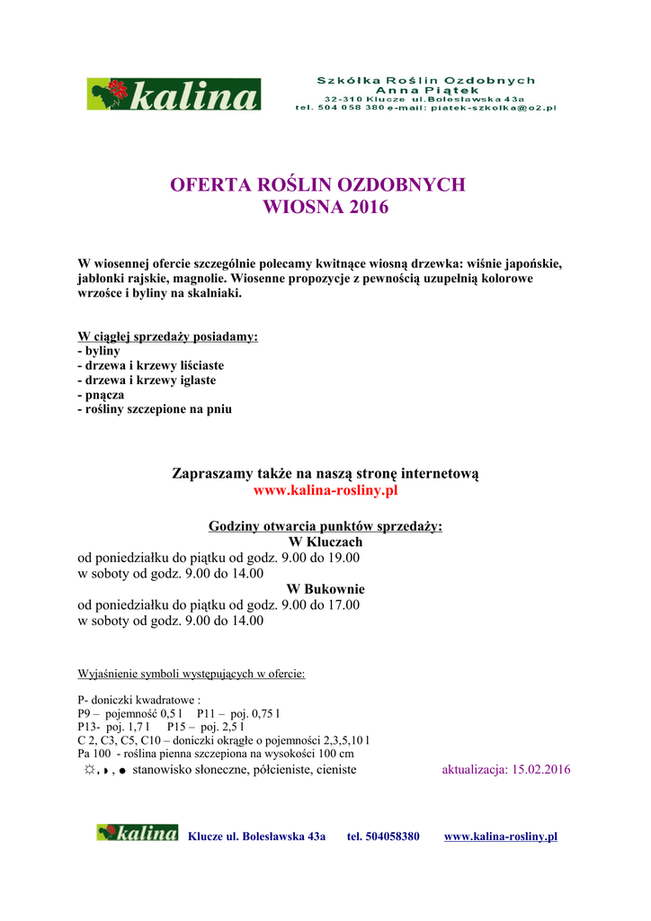 Wszystkie rośliny uwzględnione w ofercie dostępne są w punkcie sprzedaży w Kluczach i Bukownie. W