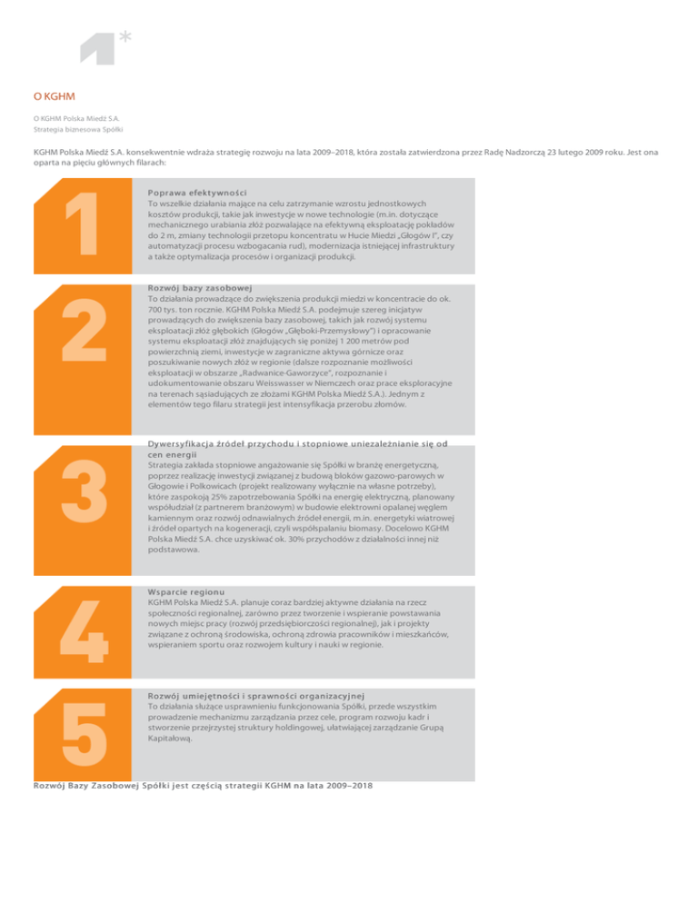 O KGHM O KGHM Polska Miedź S.A. Strategia biznesowa Spółki KGHM Polska Miedź S.A. konsekwentnie wdraża strategię rozwoju na lata 2009–2018, która została zatwierdzona przez Radę Nadzorczą 23 lutego 2009 roku. Jest ona oparta na pięciu głównych filarach: P opr awa efek t y wnoś ci To wszelkie działania mające na celu zatrzymanie wzrostu jednostkowych kosztów produkcji, takie jak inwestycje w nowe technologie (m.in. dotyczące mechanicznego urabiania złóż pozwalające na efektywną eksploatację pokładów do 2 m, zmiany technologii przetopu koncentratu w Hucie Miedzi „Głogów I”, czy automatyzacji procesu wzbogacania rud), modernizacja istniejącej infrastruktury a także optymalizacja procesów i organizacji produkcji. R ozwój bazy zas obowej To działania prowadzące do zwiększenia produkcji miedzi w koncentracie do ok. 700 tys. ton rocznie. KGHM Polska Miedź S.A. podejmuje szereg inicjatyw prowadzących do zwiększenia bazy zasobowej, takich jak rozwój systemu eksploatacji złóż głębokich (Głogów „Głęboki-Przemysłowy”) i opracowanie systemu eksploatacji złóż znajdujących się poniżej 1 200 metrów pod powierzchnią ziemi, inwestycje w zagraniczne aktywa górnicze oraz poszukiwanie nowych złóż w regionie (dalsze rozpoznanie możliwości eksploatacji w obszarze „Radwanice-Gaworzyce”, rozpoznanie i udokumentowanie obszaru Weisswasser w Niemczech oraz prace eksploracyjne na terenach sąsiadujących ze złożami KGHM Polska Miedź S.A.). Jednym z elementów tego filaru strategii jest intensyfikacja przerobu złomów. Dy wer s y fik acj a źr ódeł pr zy chodu i s t opniowe uniezależnianie s ię od cen ener gii Strategia zakłada stopniowe angażowanie się Spółki w branżę energetyczną, poprzez realizację inwestycji związanej z budową bloków gazowo-parowych w Głogowie i Polkowicach (projekt realizowany wyłącznie na własne potrzeby), które zaspokoją 25% zapotrzebowania Spółki na energię elektryczną, planowany współudział (z partnerem branżowym) w budowie elektrowni opalanej węglem kamiennym oraz rozwój odnawialnych źródeł energii, m.in. energetyki wiatrowej i źródeł opartych na kogeneracji, czyli współspalaniu biomasy. Docelowo KGHM Polska Miedź S.A. chce uzyskiwać ok. 30% przychodów z działalności innej niż podstawowa. Ws par cie r egionu KGHM Polska Miedź S.A. planuje coraz bardziej aktywne działania na rzecz społeczności regionalnej, zarówno przez tworzenie i wspieranie powstawania nowych miejsc pracy (rozwój przedsiębiorczości regionalnej), jak i projekty związane z ochroną środowiska, ochroną zdrowia pracowników i mieszkańców, wspieraniem sportu oraz rozwojem kultury i nauki w regionie. R ozwój umiej ęt noś ci i s pr awnoś ci or ganizacy j nej To działania służące usprawnieniu funkcjonowania Spółki, przede wszystkim prowadzenie mechanizmu zarządzania przez cele, program rozwoju kadr i stworzenie przejrzystej struktury holdingowej, ułatwiającej zarządzanie Grupą Kapitałową. R ozwój B azy Zas obowej Spół k i j es t częś cią s t r at egii K GHM na lat a 2009–2018