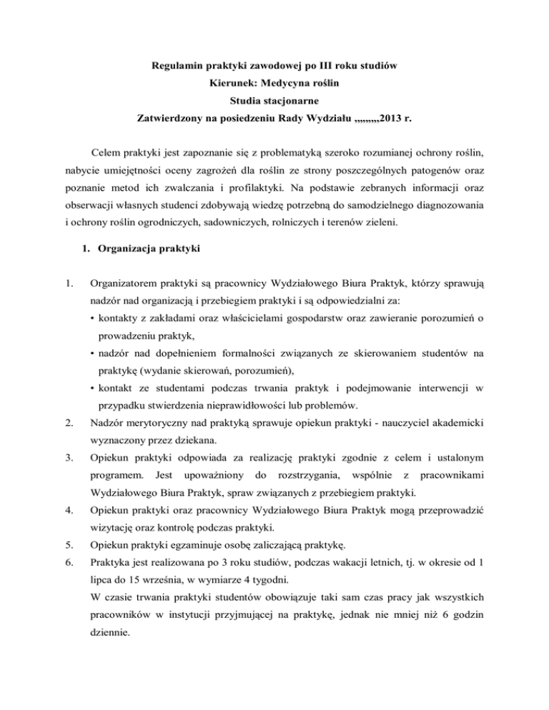 Regulamin praktyki zawodowej po III roku studiów Kierunek: Medycyna roślin Studia stacjonarne Zatwierdzony na posiedzeniu Rady Wydziału ,,,,,,,,,2013 r. Celem praktyki jest zapoznanie się z problematyką szeroko rozumianej ochrony roślin, nabycie umiejętności oceny zagrożeń dla roślin ze strony poszczególnych patogenów oraz poznanie metod ich zwalczania i profilaktyki. Na podstawie zebranych informacji oraz obserwacji własnych studenci zdobywają wiedzę potrzebną do samodzielnego diagnozowania i ochrony roślin ogrodniczych, sadowniczych, rolniczych i terenów zieleni. 1. Organizacja praktyki 1. Organizatorem praktyki są pracownicy Wydziałowego Biura Praktyk, którzy sprawują nadzór nad organizacją i przebiegiem praktyki i są odpowiedzialni za: • kontakty z zakładami oraz właścicielami gospodarstw oraz zawieranie porozumień o prowadzeniu praktyk, • nadzór nad dopełnieniem formalności związanych ze skierowaniem studentów na praktykę (wydanie skierowań, porozumień), • kontakt ze studentami podczas trwania praktyk i podejmowanie interwencji w przypadku stwierdzenia nieprawidłowości lub problemów. 2. Nadzór merytoryczny nad praktyką sprawuje opiekun praktyki - nauczyciel akademicki wyznaczony przez dziekana. 3. Opiekun praktyki odpowiada za realizację praktyki zgodnie z celem i ustalonym programem. Jest upoważniony do rozstrzygania, wspólnie z pracownikami Wydziałowego Biura Praktyk, spraw związanych z przebiegiem praktyki. 4. Opiekun praktyki oraz pracownicy Wydziałowego Biura Praktyk mogą przeprowadzić wizytację oraz kontrolę podczas praktyki. 5. Opiekun praktyki egzaminuje osobę zaliczającą praktykę. 6. Praktyka jest realizowana po 3 roku studiów, podczas wakacji letnich, tj. w okresie od 1 lipca do 15 września, w wymiarze 4 tygodni. W czasie trwania praktyki studentów obowiązuje taki sam czas pracy jak wszystkich pracowników w instytucji przyjmującej na praktykę, jednak nie mniej niż 6 godzin dziennie. 7. Miejscem praktyki są firmy oraz instytucje zajmujące się nadzorem fitosanitarnym oraz ochroną roślin: Państwowa Inspekcja Ochrony Roślin i Nasiennictwa-wszystkie szczeble, IUNG, oddziały BASF, BAYER, Osadkowski S.A., Zarządy Zieleni Miejskiej, WIOŚ, ogrody botaniczne, arboreta itp. W przypadkach szczególnych decyzję o możliwości realizacji praktyki w miejscu zaproponowanym przez studenta podejmuje merytoryczny opiekun praktyki w porozumieniu z Wydziałowym Biurem 8. Praktyk. W ustalonym terminie, przed rozpoczęciem praktyki, student powinien uzyskać z jednostki, w której ma odbywać praktykę oświadczenie zawierające zgodę na odbycie praktyki oraz zapewnienie, że program praktyki może być zrealizowany. 9. Pracownicy Wydziałowego Biura Praktyk w porozumieniu z merytorycznym opiekunem praktyki, organizują zebrania ze studentami, na których zostają przedstawione zasady odbywania praktyki, szczegółowy merytoryczny program praktyki oraz zasady zaliczenia praktyki. 10. Skierowanie na praktykę studenci otrzymują w Wydziałowym Biurze Praktyk indywidualnie. 11. Pracownicy Wydziałowego Biura Praktyk sporządzają listy zawartych porozumień i dostarczają je opiekunowi merytorycznemu do 15 sierpnia każdego roku. 12. Dziekan w porozumieniu z opiekunem merytorycznym praktyk może zwolnić studenta z obowiązku odbywania praktyki, lub jej części, w przypadku odbycia wcześniej praktyki o podobnym charakterze, lub wykonywania przez niego pracy zarobkowej, jeżeli jej charakter spełnia wymagania programu praktyki. Może to być również praca za granica, jednakże musi ona być realizowana na zasadach umowy między uczelnią a instytucją przyjmującą. Zaliczenie praktyki odbywa się wówczas na podstawie wykazania się przez studenta wiedzą w zakresie obowiązującego programu praktyki. Student zwolniony z praktyki lub jej części ma obowiązek poinformować o tym Wydziałowe Biuro Praktyk do 1 lipca danego roku. II. Obowiązki studentów: 1. Student zgłasza się na praktykę ze skierowaniem (na podstawie podpisanego porozumienia między uczelnią a przyjmującym na praktykę) w dniu rozpoczęcia praktyki i z aktualnym ubezpieczeniem od następstw nieszczęśliwych wypadków na czas praktyki. 2. Warunkiem uzyskania skierowania na praktykę jest dostarczenie do Biura Praktyk oświadczenia o aktualnym ubezpieczeniu od NNW, oświadczenia o zaliczeniu szkolenia BHP oraz w razie potrzeby uaktualnione wyniki badań Medycyny Pracy. 3. Student odbywający praktykę zobowiązany jest do podporządkowania się zaleceniom kierownictwa instytucji w której realizowana jest praktyka oraz do ścisłego przestrzegania obowiązujących przepisów. Student, który nie przestrzega przepisów dyscypliny pracy lub warunków zawartych w umowie (porozumieniu o realizacji praktyki studenckiej), zostaje odwołany z miejsca praktyki. 4. W czasie całego okresu trwania praktyki student zobowiązany jest do wykonywania prac zleconych przez zakładowego kierownika praktyki wyznaczonego przez przyjmującego na praktykę oraz do realizacji programu praktyki. 5. Student ma obowiązek prowadzić dziennik praktyk, w którym dokumentowany jest jej przebieg, oraz sporządzać notatki z uwzględnieniem celów wynikających z programu praktyki. 6. W wyniku praktyki student sporządza kompleksowe opracowania - według schematu merytorycznego załączonego do programu praktyki. 7. Każda nieobecność na praktyce powinna być usprawiedliwiona i odnotowana w dzienniczku praktyk. Usprawiedliwiona nieobecność na praktyce nie może przekraczać 3 dni podczas trwania praktyki. Dłuższe nieobecności z przyczyn losowych po uzgodnieniu z Wydziałowym Biurem Praktyk podlegają odpracowaniu w innym terminie. 8. W czasie przebiegu praktyki student jest zobowiązany zgłaszać pracodawcy a także pracownikom Wydziałowego Biura Praktyk wszelkie sprawy mające negatywny wpływ na realizację programu praktyki. 9. Weryfikacja spełnienia form