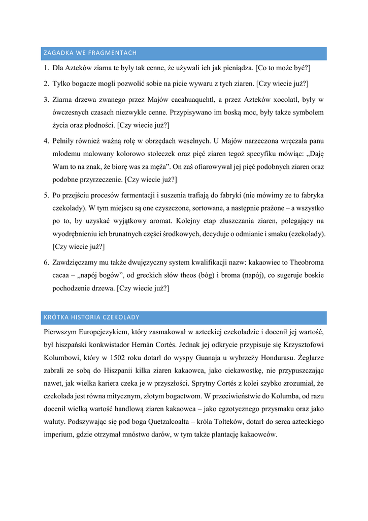 ZAGADKA WE FRAGMENTACH 1. Dla Azteków ziarna te były tak cenne, że używali ich jak pieniądza. [Co to może być?] 2. Tylko bogacze mogli pozwolić sobie na picie wywaru z tych ziaren. [Czy wiecie już?] 3. Ziarna drzewa zwanego przez Majów cacahuaquchtl, a przez Azteków xocolatl, były w ówczesnych czasach niezwykle cenne. Przypisywano im boską moc, były także symbolem życia oraz płodności. [Czy wiecie już?] 4. Pełniły również ważną rolę w obrzędach weselnych. U Majów narzeczona wręczała panu młodemu malowany kolorowo stołeczek oraz pięć ziaren tegoż specyfiku mówiąc: „Daję Wam to na znak, że biorę was za męża”. On zaś ofiarowywał jej pięć podobnych ziaren oraz podobne przyrzeczenie. [Czy wiecie już?] 5. Po przejściu procesów fermentacji i suszenia trafiają do fabryki (nie mówimy ze to fabryka czekolady). W tym miejscu są one czyszczone, sortowane, a następnie prażone – a wszystko po to, by uzyskać wyjątkowy aromat. Kolejny etap złuszczania ziaren, polegający na wyodrębnieniu ich brunatnych części środkowych, decyduje o odmianie i smaku (czekolady). [Czy wiecie już?] 6. Zawdzięczamy mu także dwujęzyczny system kwalifikacji nazw: kakaowiec to Theobroma cacaa – „napój bogów”, od greckich słów theos (bóg) i broma (napój), co sugeruje boskie pochodzenie drzewa. [Czy wiecie już?] KRÓTKA HISTORIA CZEK OLADY Pierwszym Europejczykiem, który zasmakował w azteckiej czekoladzie i docenił jej wartość, był hiszpański konkwistador Hernán Cortés. Jednak jej odkrycie przypisuje się Krzysztofowi Kolumbowi, który w 1502 roku dotarł do wyspy Guanaja u wybrzeży Hondurasu. Żeglarze zabrali ze sobą do Hiszpanii kilka ziaren kakaowca, jako ciekawostkę, nie przypuszczając nawet, jak wielka kariera czeka je w przyszłości. Sprytny Cortés z kolei szybko zrozumiał, że czekolada jest równa mitycznym, złotym bogactwom. W przeciwieństwie do Kolumba, od razu docenił wielką wartość handlową ziaren kakaowca – jako egzotycznego przysmaku oraz jako waluty. Podszywając się pod boga Quetzalcoalta – króla Tolteków, dotarł do serca azteckiego imperium, gdzie otrzymał mnóstwo darów, w tym także plantację kakaowców.