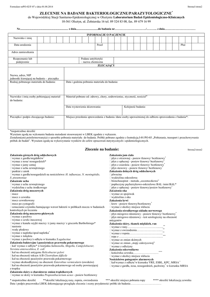 Formularz nrPO-02/F-07 z dnia 01.08.2014 Strona1/stron2 ZLECENIE NA BADANIE BAKTERIOLOGICZNE/PARAZYTOLOGICZNE* do Wojewódzkiej Stacji Sanitarno-Epidemiologicznej w Olsztynie Laboratorium Badań Epidemiologiczno-Klinicznych 10-561 Olsztyn, ul. Żołnierska 16 tel. 89 524 83 00, fax. 89 679 16 99 [ Nr.................................................................... z dnia...............................do badania nr……………………………/……….. z dnia…………………………… INFORMACJE O PACJENCIE Nazwisko i imię Data urodzenia Pesel Płeć Adres zamieszkania Rozpoznanie lub podejrzenie Nazwa, adres, NIP jednostki kierującej na badanie - pieczątka Rodzaj pobranego materiału do badania: Nazwisko i imię osoby pobierającej materiał do badania: Podane antybiotyki – nazwa chemiczna ZLECAJĄCY Data i godzina pobrania materiału do badania: Materiał pobrano od: zdrowy, chory, ozdrowieniec, styczność, nosiciel٭ Data wystawienia skierowania: Pieczątka i podpis zlecającego badanie: Kolejność badania: Miejsce przesłania sprawozdania z badania /dane osoby upoważnionej do odbioru sprawozdania z badania*: *niepotrzebne skreślić Wyrażam zgodę na wykonanie badania metodami stosowanymi w LBEK zgodnie z wykazem. Zostałem(am) poinformowany(a) o sposobie pobrania materiału do badania. Próbki pobrano zgodnie z Instrukcją I-01/PO-03 „Pobieranie, transport i przechowywanie próbek do badań”. Wyrażam zgodę na wykorzystanie wyników do celów opracowań statystycznych i epidemiologicznych. Zlecenie na badanie: Zakażenia górnych dróg oddechowych wymaz z gardła/migdałków* wymaz z nosa/ nosogardzieli* wymaz z jamy ustnej wymaz z ucha zewnętrznego punktat z zatok wymaz z gardła/nosogardzieli na nosicielstwo: H. influenzae, N. meningitidis, S. pneumoniae Zakażenie ucha wymaz z ucha zewnętrznego wydzielina z ucha środkowego Zakażenia dróg moczowych mocz mocz z cewnika mocz cewnikowany mocz po cystografii oznaczanie czynnika hamującego wzrost bakterii w próbkach moczu w badaniach kontrolnych po leczeniu Zakażenia dróg moczowo-płciowych wymaz z pochwy wymaz z cewki moczowej wymaz z kanału szyjki macicy /z jamy macicy/ z gruczołu Bartholiniego* nasienie wody płodowe wymaz z napletka/spod napletka* wymaz z żołędzia wymaz z pochwy/z odbytu w kierunku S.agalactiae Zakażenia bakteryjne i pasożytnicze przewodu pokarmowego kał/ wymaz z odbytu* w kierunku Salmonella, Shigella, Campylobacter, Yersinia enterocolitica, E. coli* kał na obecność antygenu Helicobacter pylori kał na obecność toksyn A/B Clostridium difficile kał na obecność pasożytów przewodu pokarmowego wymaz okołoodbytowy na obecność Enterobius vermicularis (owsików) kał na obecność pasożytów przewodu pokarmowego od osoby powracającej z tropiku Zakażenia skóry o charakterze zmian trądzikowych wymaz ze skóry w kierunku Propionibacterium acnes - posiew beztlenowy Strona2/stron2 Zakażenia jam ciała płyn z otrzewnej - posiew tlenowy/ beztlenowy* płyn z opłucnej - posiew tlenowy/ beztlenowy* płyn z osierdzia - posiew tlenowy/ beztlenowy* płyn stawowy - posiew tlenowy/ beztlenowy* Zakażenia dolnych dróg oddechowych plwocina wydzielina oskrzelowa bronchoaspirat - metoda „szczoteczkowa” popłuczyny pęcherzykowo-oskrzelowe BAL /mini BAL* płyn z opłucnej - posiew tlenowy/posiew beztlenowy* Zakażenia oka wymaz ze spojówek wydzielina z oka Zakażenia krwi krew - posiew tlenowy/beztlenowy* wymaz z okolicy miejsca wkłucia Zakażenia ośrodkowego układu nerwowego płyn mózgowo rdzeniowy - posiew tlenowy/ beztlenowy* płyn mózgowo rdzeniowy - test serologiczny na obecność antygenów Zakażenia skóry, tkanek miękkich, ran wymaz z rany…………………………….…..** wymaz z owrzodzenia…………………….… ** wymaz z ropnia………………………….…..** ropa z …………………………………….….*** wymaz ze zmian skórnych wymaz ze zmian „stopy cukrzycowej” wymaz z odleżyny Zakażenia odcewnikowe końcówka cewnika……………………… **** wymaz z okolicy miejsca wkłucia Nosicielstwo patogenów alarmowych kał/wymaz z odbytu*w kierunku VRE, ESBL, KPC, MRSA * wymaz z gardła, nosa, nosogardzieli, pachwiny* w kierunku MRSA * niepotrzebne skreślić **określić lokalizację rany, ropnia, owrzodzenia *** określić miejsce pobrania ropy **** określić lokalizację cewnika Data i podpis pracownika LBEK dokonującego przeglądu zlecenia i oceny przydatności próbki do badania……………………………