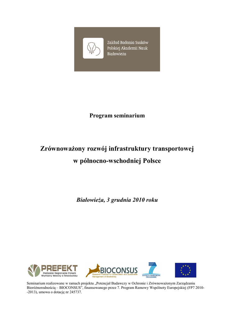 Program seminarium Zrównoważony rozwój infrastruktury transportowej w północno-wschodniej Polsce Białowieża, 3 grudnia 2010 roku Seminarium realizowane w ramach projektu „Potencjał Badawczy w Ochronie i Zrównoważonym Zarządzaniu Bioróżnorodnością – BIOCONSUS”, finansowanego przez 7. Program Ramowy Wspólnoty Europejskiej (FP7 2010-2013), umowa o dotację nr 245737. Piątek , 3 grudnia 2010 r. 9:00-10:00 Rejestracja uczestników 10:00-10:15 Otwarcie seminarium, powitanie gości, prezentacja ZBS PAN – dr hab. Andrzej Zalewski, Dyrektor Zakładu Badania Ssaków Polskiej Akademii Nauk, Białowieża 10:15-10:30 Prezentacja projektu BIOCONSUS i idei Podlaskiego Regionalnego Forum Wymiany Wiedzy o Środowisku (PREFEKT) − Dorota Ławreszuk, Zakład Badania Ssaków Polskiej Akademii Nauk, Białowieża 10:30-11:00 Rozwój sieci transportowej w Polsce – działania w trosce o zachowanie ciągłości ekologicznej – dr hab. Paweł Mickiewicz, Generalna Dyrekcja Dróg Krajowych i Autostrad, Departament Środowiska, Warszawa 11:00-11:30 Sieć transportowa w województwie podlaskim – obecny stan oraz plany rozwoju – Jerzy Doroszkiewicz, Generalna Dyrekcja Dróg Krajowych i Autostrad, Oddział Białystok 11:30-11:45 Pytania i dyskusja 11:45-12:10 PRZERWA NA KAWĘ 12:10-12:40 Środki łagodzące negatywny wpływ infrastruktury transportowej – przegląd rozwiązań stosowanych w kraju i na świecie – dr Robert Mysłajek, Stowarzyszenie dla Natury „Wilk”, Twardorzeczka 12:40-13:10 Przegląd narzędzi GIS i możliwości ich wykorzystania przy projektowaniu korytarzy ekologicznych i przejść dla dzikich zwierząt – Marcin Górny/Paweł Struś, Zakład Badania Ssaków PAN, Białowieża 13:10-13:40 Potrzeba prowadzenia monitoringu przejść dla zwierząt – dr Robert Mysłajek, Stowarzyszenie dla Natury „Wilk”, Twardorzeczka 13:40-13:55 Pytania i dyskusja 13:55-14:55 PRZERWA NA OBIAD 14:55-15:25 Zakres analiz przyrodniczych w procedurach prawnych oraz na podstawie stosowanych metodyk i dobrych praktyk. Prezentacja pozytywnego i negatywnego przykładu OOŚ z regionu Podlasia – Marta Wronka, FPP Consulting, Warszawa 15:25-16:00 Podsumowanie seminarium. Sformułowanie wniosków i uwag dotyczących wspierania zrównoważonego rozwoju infrastruktury transportowej w Polsce północno–wschodniej – Dorota Ławreszuk, dr hab. Paweł Mickiewicz, dr Robert Mysłajek Seminarium realizowane w ramach projektu „Potencjał Badawczy w Ochronie i Zrównoważonym Zarządzaniu Bioróżnorodnością – BIOCONSUS”, finansowanego przez 7. Program Ramowy Wspólnoty Europejskiej (FP7 2010-2013), umowa o dotację nr 245737.