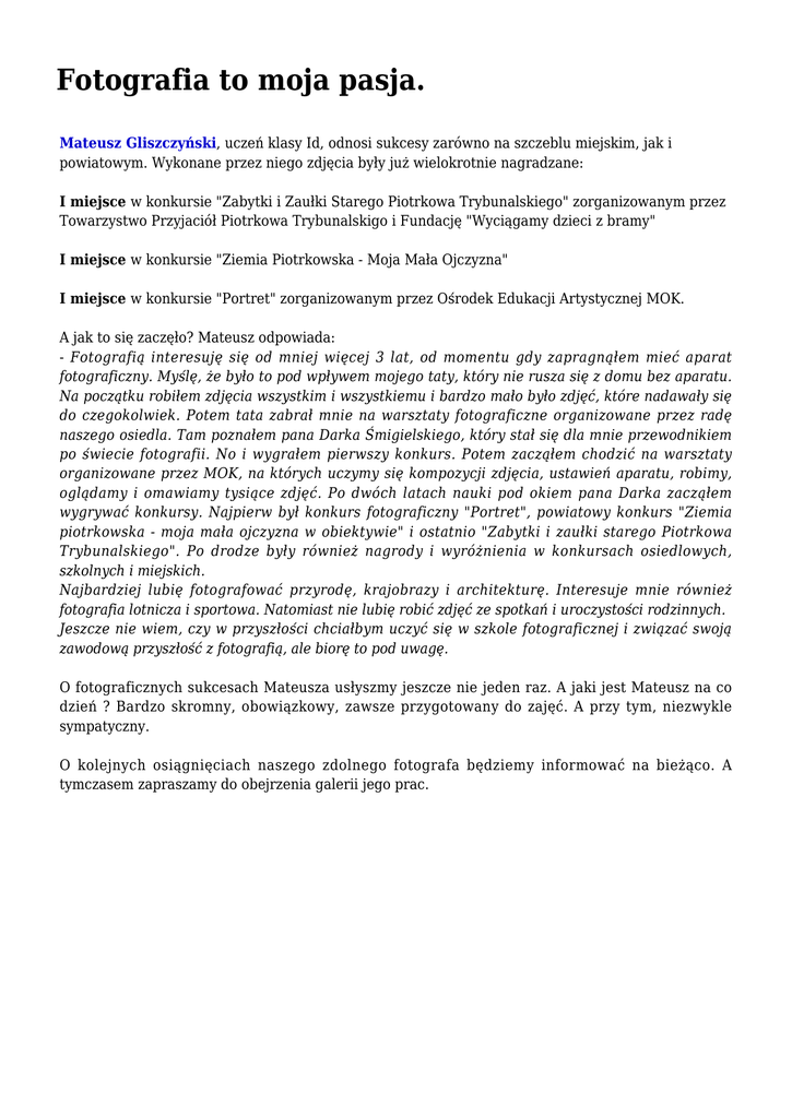 Fotografia to moja pasja. Mateusz Gliszczyński, uczeń klasy Id, odnosi sukcesy zarówno na szczeblu miejskim, jak i powiatowym. Wykonane przez niego zdjęcia były już wielokrotnie nagradzane: I miejsce w konkursie "Zabytki i Zaułki Starego Piotrkowa Trybunalskiego" zorganizowanym przez Towarzystwo Przyjaciół Piotrkowa Trybunalskigo i Fundację "Wyciągamy dzieci z bramy" I miejsce w konkursie "Ziemia Piotrkowska - Moja Mała Ojczyzna" I miejsce w konkursie "Portret" zorganizowanym przez Ośrodek Edukacji Artystycznej MOK. A jak to się zaczęło? Mateusz odpowiada: - Fotografią interesuję się od mniej więcej 3 lat, od momentu gdy zapragnąłem mieć aparat fotograficzny. Myślę, że było to pod wpływem mojego taty, który nie rusza się z domu bez aparatu. Na początku robiłem zdjęcia wszystkim i wszystkiemu i bardzo mało było zdjęć, które nadawały się do czegokolwiek. Potem tata zabrał mnie na warsztaty fotograficzne organizowane przez radę naszego osiedla. Tam poznałem pana Darka Śmigielskiego, który stał się dla mnie przewodnikiem po świecie fotografii. No i wygrałem pierwszy konkurs. Potem zacząłem chodzić na warsztaty organizowane przez MOK, na których uczymy się kompozycji zdjęcia, ustawień aparatu, robimy, oglądamy i omawiamy tysiące zdjęć. Po dwóch latach nauki pod okiem pana Darka zacząłem wygrywać konkursy. Najpierw był konkurs fotograficzny "Portret", powiatowy konkurs "Ziemia piotrkowska - moja mała ojczyzna w obiektywie" i ostatnio "Zabytki i zaułki starego Piotrkowa Trybunalskiego". Po drodze były również nagrody i wyróżnienia w konkursach osiedlowych, szkolnych i miejskich. Najbardziej lubię fotografować przyrodę, krajobrazy i architekturę. Interesuje mnie również fotografia lotnicza i sportowa. Natomiast nie lubię robić zdjęć ze spotkań i uroczystości rodzinnych. Jeszcze nie wiem, czy w przyszłości chciałbym uczyć się w szkole fotograficznej i związać swoją zawodową przyszłość z fotografią, ale biorę to pod uwagę. O fotograficznych sukcesach Mateusza usłyszmy jeszcze nie jeden raz. A jaki jest Mateusz na co dzień ? Bardzo skromny, obowiązkowy, zawsze przygotowany do zajęć. A przy tym, niezwykle sympatyczny. O kolejnych osiągnięciach naszego zdolnego fotografa będziemy informować na bieżąco. A tymczasem zapraszamy do obejrzenia galerii jego prac.