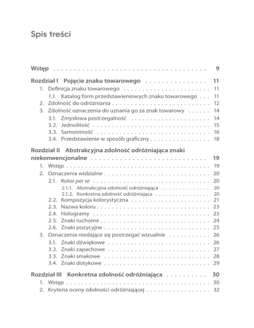 Spis treści Wstęp . . . . . . . . . . . . . . . . . . . . . . . . . . . . . . . . . . . . . 9 Rozdział I Pojęcie znaku towarowego . . . . . . . . . . . . . . . 11 1. Definicja znaku towarowego . . . . . . . . . . . . . . . . . . . . 1.1. Katalog form przedstawieniowych znaku towarowego 2. Zdolność do odróżniania . . . . . . . . . . . . . . . . . . . . . . . 3. Zdolność oznaczenia do uznania go za znak towarowy . . . 3.1. Zmysłowa postrzegalność . . . . . . . . . . . . . . . . . . 3.2. Jednolitość . . . . . . . . . . . . . . . . . . . . . . . . . . . . 3.3. Samoistność . . . . . . . . . . . . . . . . . . . . . . . . . . . 3.4. Przedstawienie w sposób graficzny . . . . . . . . . . . . . . . . . . . . . . . . . . . . . . . . . . . . . Rozdział II Abstrakcyjna zdolność odróżniająca znaki niekonwencjonalne . . . . . . . . . . . . . . . . . . . . . . . . . . . . 11 11 12 14 14 15 16 18 19 1. Wstęp . . . . . . . . . . . . . . . . . . . . . . . . . . . . . . . . . . . . . . 19 2. Oznaczenia widzialne . . . . . . . . . . . . . . . . . . . . . . . . . . . . 20 2.1. Kolor per se . . . . . . . . . . . . . . . . . . . . . . . . . . . . . . . 20 2.1.1. Abstrakcyjna zdolność odróżniająca . . . . . . . . . . . . . . 2.1.2. Konkretna zdolność odróżniająca . . . . . . . . . . . . . . . . 2.2. Kompozycja kolorystyczna . . . . . . . . . . 2.3. Nazwa koloru . . . . . . . . . . . . . . . . . . . 2.4. Hologramy . . . . . . . . . . . . . . . . . . . . 2.5. Znaki ruchome . . . . . . . . . . . . . . . . . . 2.6. Znaki pozycyjne . . . . . . . . . . . . . . . . . 3. Oznaczenia niedające się postrzegać wizualnie 3.1. Znaki dźwiękowe . . . . . . . . . . . . . . . . 3.2. Znaki zapachowe . . . . . . . . . . . . . . . . 3.3. Znaki smakowe . . . . . . . . . . . . . . . . . 3.4. Znaki dotykowe . . . . . . . . . . . . . . . . . . . . . . . . . . . . . . . . . . . . . . . . . . . . . . . . . . . . . . . . . . . . . . . . . . . . . . . . . . . . . . . . . . . . . . . . . . . . . . . . . . . . . . . . . . . . . . . . . . . . . . . . . . . . . . . 20 20 21 23 23 24 25 26 26 27 28 29 Rozdział III Konkretna zdolność odróżniająca . . . . . . . . . . 30 1. Wstęp . . . . . . . . . . . . . . . . . . . . . . . . . . . . . . . . . . . . . . 30 2. Kryteria oceny zdolności odróżniającej . . . . . . . . . . . . . . . . . 32 3. Oznaczenia nienadające się do odróżniania w obrocie towarów wskazanych w zgłoszeniu – oznaczenia niedystynktywne . . . . 4. Oznaczenia opisowe . . . . . . . . . . . . . . . . . . . . . . . . . . . . 4.1. Uwagi ogólne . . . . . . . . . . . . . . . . . . . . . . . . . . . . . 4.2. Monopolizacja oznaczeń informacyjnych/opisowych . . . . 4.3. Kategorie oznaczeń opisowych . . . . . . . . . . . . . . . . . . 4.3.1. 4.3.2. 4.3.3. 4.3.4. 4.3.5. 4.3.6. 4.3.7. 4.3.8. Znaki słowne . . . . . . . . . . . . . . . . . . . . . . . . . . Neologizmy . . . . . . . . . . . . . . . . . . . . . . . . . . . Oznaczenia aluzyjne i sugerujące . . . . . . . . . . . . . Oznaczenia opisowe sformułowane w języku obcym Oznaczenia posiadające kilka znaczeń . . . . . . . . . . Kombinacja wyrazów opisowych i ich skrótu . . . . . . Znaki złożone zawierające element opisowy . . . . . . Oznaczenia wskazujące na pochodzenie geograficzne towaru . . . . . . . . . . . . . . . . . . . . . 4.3.9. Formy towaru lub opakowania . . . . . . . . . . . . . . . 4.3.10. Pojedyncze litery . . . . . . . . . . . . . . . . . . . . . . . . 4.3.11. Pojedyncze cyfry/liczby . . . . . . . . . . . . . . . . . . . 34 36 36 37 38 . . . . . . . . . . . . . . . 38 . 39 . 41 . 42 . 44 . 44 . 45 . . . . . . . . . . . . 47 49 50 51 4.4. Szczególne przypadki oznaczeń opisowych . . . . . . . . . . 52 4.4.1. Slogany reklamowe . . . . . . . . . . . . . . . . . 4.4.2. Domeny internetowe . . . . . . . . . . . . . . . . 4.4.3. Międzynarodowe nazwy niezastrzeżone INN (ang. International Nonproprietary Name) . . . 4.4.4. Tytuły prasowe . . . . . . . . . . . . . . . . . . . . . . . . . . . . . . . . . . . . 52 54 . . . . . . . . . . . . . . . . 58 58 5. Oznaczenia, które składają się wyłącznie z elementów, które weszły do języka potocznego lub są używane w praktykach handlowych . . . . . . . . . . . . . . . . . . . . . . . . . 60 5.1. Uwagi ogólne . . . . . . . . . . . . . . . . . . . . . . . . . . . . . 60 5.2. Zasady oceny . . . . . . . . . . . . . . . . . . . . . . . . . . . . . . 61 5.2.1. Zasada krajowości używania, a zasada regionalności używania . . . . . . . . . . . . . . . . . . . . . . . . . . . . . 5.2.2. Zasada powszechności używania . . . . . . . . . . . . . 5.2.3. Zasada przedmiotowego odniesienia . . . . . . . . . . 5.2.4. Zasada oceny z punktu widzenia relewantnego kręgu odbiorców . . . . . . . . . . . . . . . . . . . . . . . . . . . . . . . 61 . . . 62 . . . 64 . . . 65 5.3. Przykłady znaków towarowych, które nie uzyskały ochrony, bądź ją utraciły . . . . . . . . . . . . . . . . . . . . . . . 66 Rozdział IV Wtórna zdolność odróżniająca . . . . . . . . . . . . 68 1. Pojęcie wtórnej zdolności odróżniającej . . . . . . . . . . . . . . . . 68 1.1. Definicja . . . . . . . . . . . . . . . . . . . . . . . . . . . . . . . . . 68 1.2. Używanie oznaczenia w celu nabycia wtórnej zdolności odróżniającej . . . . . . . . . . . . . . . . . . . . . . . . . . . . 1.3. Używanie oznaczenia jako części znaku złożonego . . . 1.4. Nabycie wtórnej zdolności a interes publiczny . . . . . . 2. Moment nabycia wtórnej zdolności odróżniającej . . . . . . . . 3. Kryteria oceny istnienia wtórnej zdolności odróżniającej . . . 3.1. Uwagi ogólne . . . . . . . . . . . . . . . . . . . . . . . . . . . 3.2. Czynniki brane pod uwagę przy ustalaniu zdolności odróżniającej . . . . . . . . . . . . . . . . . . . . . . . . . . . . 3.3. Zasięg terytorialny . . . . . . . . . . . . . . . . . . . . . . . . 3.4. Rodzaje dowodów . . . . . . . . . . . . . . . . . . . . . . . 