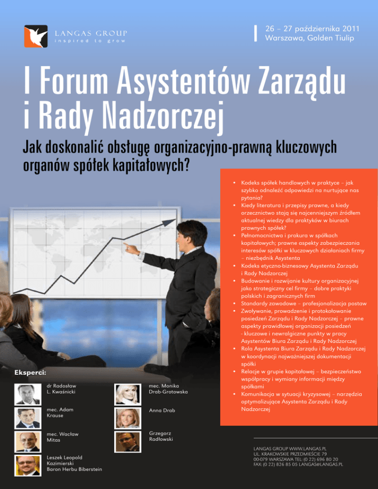 26 – 27 października 2011 Warszawa, Golden Tiulip I Forum Asystentów Zarządu i Rady Nadzorczej Jak doskonalić obsługę organizacyjno-prawną kluczowych organów spółek kapitałowych? Eksperci: dr Radosław L. Kwaśnicki mec. Monika Drab-Grotowska mec. Adam Krause Anna Drab mec. Wacław Mitas Grzegorz Radłowski Leszek Leopold Kazimierski Baron Herbu Biberstein • Kodeks spółek handlowych w praktyce – jak szybko odnaleźć odpowiedzi na nurtujące nas pytania? • Kiedy literatura i przepisy prawne, a kiedy orzecznictwo stają się najcenniejszym źródłem aktualnej wiedzy dla praktyków w biurach prawnych spółek? • Pełnomocnictwa i prokura w spółkach kapitałowych; prawne aspekty zabezpieczania interesów spółki w kluczowych działaniach firmy – niezbędnik Asystenta • Kodeks etyczno-biznesowy Asystenta Zarządu i Rady Nadzorczej • Budowanie i rozwijanie kultury organizacyjnej jako strategiczny cel firmy – dobre praktyki polskich i zagranicznych firm • Standardy zawodowe – profesjonalizacja postaw • Zwoływanie, prowadzenie i protokołowanie posiedzeń Zarządu i Rady Nadzorczej – prawne aspekty prawidłowej organizacji posiedzeń - kluczowe i newralgiczne punkty w pracy Asystentów Biura Zarządu i Rady Nadzorczej • Rola Asystenta Biura Zarządu i Rady Nadzorczej w koordynacji najważniejszej dokumentacji spółki • Relacje w grupie kapitałowej – bezpieczeństwo współpracy i wymiany informacji między spółkami • Komunikacja w sytuacji kryzysowej – narzędzia optymalizujące Asystenta Zarządu i Rady Nadzorczej LANGAS GROUP WWW.LANGAS.PL UL. KRAKOWSKIE PRZEDMIEŚCIE 79 00-079 WARSZAWA TEL: (0 22) 696 80 20 FAX: (0 22) 826 85 05 [email protected] I FORUM ASYSTENTÓW ZARZĄDU I RADY NADZORCZEJ Jak doskonalić obsługę organizacyjno-prawną kluczowych organów spółek kapitałowych? 26 – 27 października 2011 Warszawa, Golden Tiulip Szanowni Państwo OPINIE UCZESTNIKÓW PROJEKTÓW DLA ASYSTENTÓW ZARZĄDU I RADY NADZORCZEJ: Zapraszamy do udziału w pierwszej edycji Forum Asystentów Zarządu i Rady Nadzorczej. Celem spotkania jest wymiana doświadczeń i przede wszystkim dobrych praktyk, które wskazują kierunki skutecznych rozwiązań organizacyjnoprawnych w spółkach kapitałowych. Dobrze pojęte i funkcjonalnie stosowane prawo spółek, daje możliwość sprawnego realizowania poleceń organów spółek, zabezpieczania ich interesów i działania całej firmy zarówno w wymiarze wewnętrznym, jak i we współpracy z zewnętrznymi podmiotami. „Profesjonalizm i w pełni wyczerpujące informacje merytoryczne związane z tematyką szkolenia – dziękuję bardzo to nie był stracony czas” – Agnieszka Bielawska-Januszkiewicz, Dalkia Łódź S.A. Podczas forum poruszone zostaną kwestie: • W jaki sposób wykorzystywać na co dzień prawo handlowe, aby zabezpieczać działania organów i funkcjonowanie firmy? • Na co zwracać szczególną uwagę w zakresie obsługi Zarządu, Rady Nadzorczej, Walnych Zgromadzeń/Zgromadzeń Wspólników? – „głośne sprawy 2011” • Jakie czekają nas usprawnienia w polskim prawie gospodarczym i co to oznacza dla funkcjonowania spółek kapitałowych? • Teoria czy praktyka organów spółek? – Jak powinien wyglądać „układ sił”, a jak wygląda? – kazusy z polskiego rynku • Reprezentacja i prowadzenie spraw spółki – co przynoszą przepisy prawne, jaka jest praktyka na polskim rynku, a jakie rozwiązania można regulować wewnętrznymi zapisami? • Pełnomocnik i prokurent – jakie jest umocowanie ustawodawców? Jak zabezpieczyć reprezentanta firmy i firmę? Jakich błędów nie popełniać i jakie jest ryzyko w działaniach pełnomocników/prokurentów ? • Władze i właściciele spółki, firma – spojrzenie wewnątrz i na zewnątrz – czym są standardy etyczno – zawodowe? Wizerunek i reputacja firmy jako przewaga konkurencyjna • Jakie są kluczowe i newralgiczne punkty w pracy Asystentów w zakresie organizacji posiedzeń? - dokumenty/materiały przed i na posiedzeniach, prawidłowe zwołanie, koordynacja przebiegu, podpisywanie • Jak koordynować najważniejszą dokumentację w spółce? - praktyczne wskazówki w zakresie prawnych aspektów organizacji • W jaki sposób współdziałają spółki w grupach kapitałowych? Jak wygląda współpraca i jakie są zależności? – bezpieczeństwo współpracy i wymiany informacji • Jakie narzędzia komunikacyjne może zastosować Asystent w sytuacji kryzysowej w firmie? – optymalizujące kroki interwencyjne Metodologia: Forum ma charakter wykładowy, połączony z analizą rozwiązań prawnoorganizacyjnych, analizą przykładów z praktyki polskich spółek. W przypadku jakichkolwiek pytań Proszę o kontakt telefoniczny z zespołem Langas Group pod numerem telefonu (22) 696 80 20, lub za pomocą poczty elektronicznej: [email protected] Natychmiast odpowiemy na każde Twoje pytanie! Pamiętaj, że inwestując Twój czas i pieniądze w szkolenia organizowane przez Langas Group, możesz zawsze spodziewać się co najmniej kilkukrotnego zwrotu z inwestycji! Stawiamy na Twoje maksymalne zadowolenie! Barbara Zielińska Kierownik Projektu „Szkolenie na bardzo wysokim poziomie, prowadzone przez znakomitych wykładowców, którzy nie przekazują suchej wiedzy, łączą wykład z ćwiczeniami, rozmową poruszając interesujące tematy” – Małgorzata Labuda, MTU Moje Towarzystwo Ubezpieczeń SA „Bardzo duży nacisk na fachową kadrę zasługuje na pochwałę!” – Iwona Wyrzykiewicz, PSE-Zachód SA „Rewelacyjni prowadzący, z sercem podchodzący do swoich zadań, bez rutyny” – Alicja Hazuka, Porta KMI Poland sp. z o.o. „Doskonale dobrani szkolący, profesjonalna i miła organizacja, szeroko zakreślona problematyka tematyczna” – Katarzyna Barszcz, Wakacje.pl S.A. „Kompetencje i wiedza wykładowców są na imponującym poziomie. Gratulacje!” – Marta Orłowska, Nadwiślanka SA SZKOLENIE
