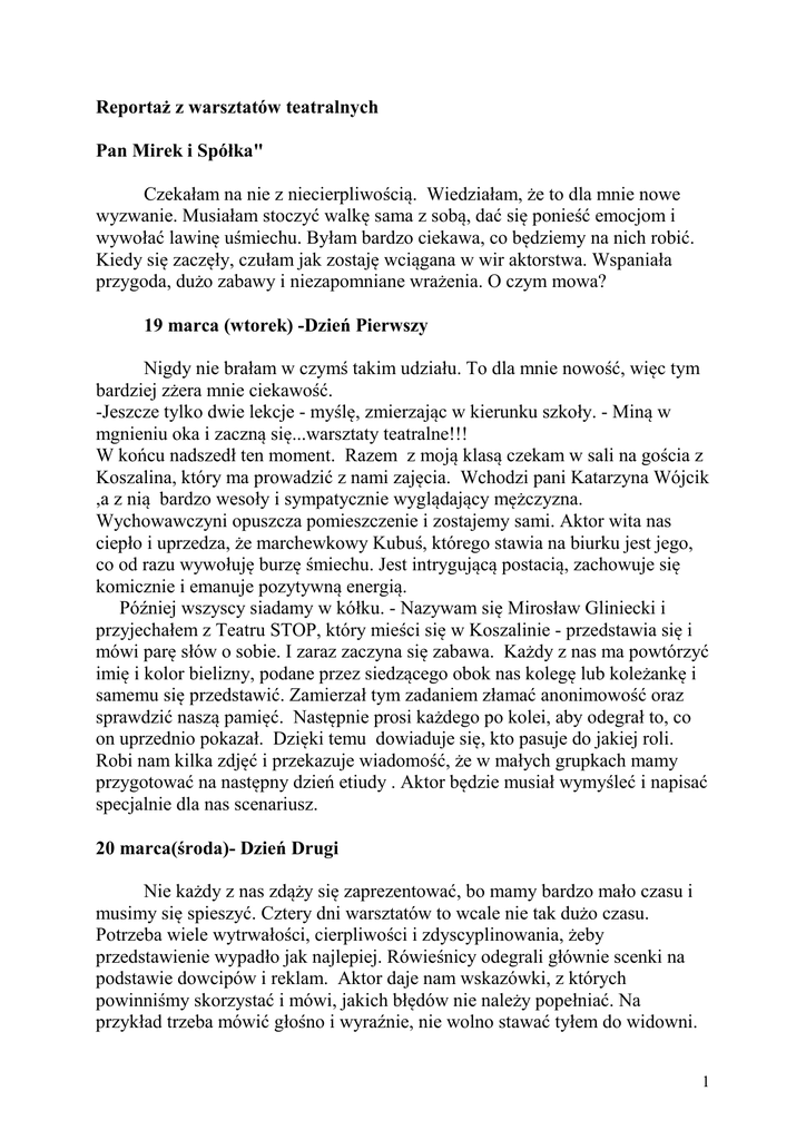 Reportaż z warsztatów teatralnych Pan Mirek i Spółka" Czekałam na nie z niecierpliwością. Wiedziałam, że to dla mnie nowe wyzwanie. Musiałam stoczyć walkę sama z sobą, dać się ponieść emocjom i wywołać lawinę uśmiechu. Byłam bardzo ciekawa, co będziemy na nich robić. Kiedy się zaczęły, czułam jak zostaję wciągana w wir aktorstwa. Wspaniała przygoda, dużo zabawy i niezapomniane wrażenia. O czym mowa? 19 marca (wtorek) -Dzień Pierwszy Nigdy nie brałam w czymś takim udziału. To dla mnie nowość, więc tym bardziej zżera mnie ciekawość. -Jeszcze tylko dwie lekcje - myślę, zmierzając w kierunku szkoły. - Miną w mgnieniu oka i zaczną się...warsztaty teatralne!!! W końcu nadszedł ten moment. Razem z moją klasą czekam w sali na gościa z Koszalina, który ma prowadzić z nami zajęcia. Wchodzi pani Katarzyna Wójcik ,a z nią bardzo wesoły i sympatycznie wyglądający mężczyzna. Wychowawczyni opuszcza pomieszczenie i zostajemy sami. Aktor wita nas ciepło i uprzedza, że marchewkowy Kubuś, którego stawia na biurku jest jego, co od razu wywołuję burzę śmiechu. Jest intrygującą postacią, zachowuje się komicznie i emanuje pozytywną energią. Później wszyscy siadamy w kółku. - Nazywam się Mirosław Gliniecki i przyjechałem z Teatru STOP, który mieści się w Koszalinie - przedstawia się i mówi parę słów o sobie. I zaraz zaczyna się zabawa. Każdy z nas ma powtórzyć imię i kolor bielizny, podane przez siedzącego obok nas kolegę lub koleżankę i samemu się przedstawić. Zamierzał tym zadaniem złamać anonimowość oraz sprawdzić naszą pamięć. Następnie prosi każdego po kolei, aby odegrał to, co on uprzednio pokazał. Dzięki temu dowiaduje się, kto pasuje do jakiej roli. Robi nam kilka zdjęć i przekazuje wiadomość, że w małych grupkach mamy przygotować na następny dzień etiudy . Aktor będzie musiał wymyśleć i napisać specjalnie dla nas scenariusz. 20 marca(środa)- Dzień Drugi Nie każdy z nas zdąży się zaprezentować, bo mamy bardzo mało czasu i musimy się spieszyć. Cztery dni warsztatów to wcale nie tak dużo czasu. Potrzeba wiele wytrwałości, cierpliwości i zdyscyplinowania, żeby przedstawienie wypadło jak najlepiej. Rówieśnicy odegrali głównie scenki na podstawie dowcipów i reklam. Aktor daje nam wskazówki, z których powinniśmy skorzystać i mówi, jakich błędów nie należy popełniać. Na przykład trzeba mówić głośno i wyraźnie, nie wolno stawać tyłem do widowni. 1 Jeśli zapomnimy jakiegoś słowa, to należy zastąpić je własnym, bo publiczność nie zna tektu i się nie zorientuje. Nadchodzi pora na wymyślenie nazwy dla naszego teatru. Przewagą głosów wygrywa "Teatr KUNA" . Jestem zadowolona, podekscytowana i czekam, co będzie działo się dalej. Pan Mirek czyta cały scenariusz na głos, zmieniając tonację i strojąc różne miny. Później nadchodzi chwila prawdy - obsadzenie ról. Pada moje imię i nazwisko. Dowiaduję się, że zagram Aktorkę I, Płaczkę I i Ładną I. Mam nadzieję ,że dam radę. Czy każdy jest zadowolony? Po chwili, gdy już wszyscy wiemy, jaką postać gramy w sztuce, czytamy scenariusz z podziałem na role. Jutro musimy znać wszystko na pamięć. Nie mam zbyt dużo kwestii, więc będzie łatwo. 21 marca(czwartek)- Dzień Trzeci Tylko jedna luźna lekcja - godzina wychowawcza, i pracujemy dalej nad przedstawieniem. Czujemy się swobodnie w swoim towarzystwie, mamy niezły ubaw i mam wrażenie, że nie ma takiej osoby, której by się te warsztaty nie podobały. To, że się odbyły, to zasługa naszej wychowawczyni, RADY SAMORZĄDU UCZNIOWSKIEGO oraz Dyrekcji . Gimnazjum nr 12 jest pierwszą szkołą w Szczecinie, w której odbyły się warsztaty dla młodzieży z aktorami z tego teatru. Czyż nie powinniśmy być bardzo wdzięczni? Uważam, że tak! Pan Mirek powoli omawia każdą scenę, każdy szczegół z wielką precyzją i dokładnością. Pokazuje jak ją zagrać, tłumaczy jak wczuć się w rolę i nadzoruje naszą grę aktorską. Każdy z nas jest jeszcze nieoszlifowanym diamentem i on stara się z nas wydobyć to, co najlepsze. Czy mu się uda? Efekty naszej pracy zostaną pokazane w piątek przed tzw. życzliwą publicznością, czyli przed chętnymi zobaczyć nas w roli aktorów rodzicami, bliskimi i nauczycielami. Siedzimy do późna w szkole i staramy się z całych sił. 22 marca(piątek)- Dzień Czwarty, czyli Wielki Dzień Czuję od rana lekką tremę. Zależy mi na tym, by wypaść jak najlepiej, by wszystko się udało. Musimy ćwiczyć, ćwiczyć i jeszcze raz ćwiczyć. Aż do skutku. Najpierw odbywa się próba generalna bez kostiumów i rekwizytów. Nawet w scenach grupowych należy zachować czujność i skupienie. Nieważne czy stoimy z przodu, czy z tyłu. Nie jesteśmy niewidoczni. Publiczność obserwuje każdy nasz ruch. Musimy "odstawić" siebie gdzieś na bok, zrezygnować z siebie i całą swoją osobą stać się postacią, którą odgrywamy. Chociaż narazie krzesła pozostają puste i tylko jedno jest zajęte przez pana Mirosława, udajemy, że publiczność przybyła, a reżysera nie ma. Czy sprostamy temu zadaniu? Czas na próbę generalną z kostiumami i rekwizytami . Magiczna walizka zostaje otwarta i jak za dotknięciem różdżki wylatują z niej we wszystkie strony różnorakie stroje. Pędzę szybko do łazienki i przebieram się w jaskrawe 2 ubrania. Mam przecież wyglądać niemalże jak dziewczyna z teledysku disco polo, o niskim ilorazie inteligencji. W kulisach zostawiam babciną chustę, którą jako Płaczka założę na głowę. Próba dobiega końca. W szkole już od jakiegoś czasu porozwieszane są plakaty z naszym zdjęciem i informacją o przedstawieniu. Pan Mirek musi nas artystycznie umalować. Wybija godzina 17.00 i zaczynają przychodzić rodzice. Zostają wpuszczeni do sali i przyglądają się teatrowi zza kulis. Nasz wspaniały reżyser i zarazem scenarz