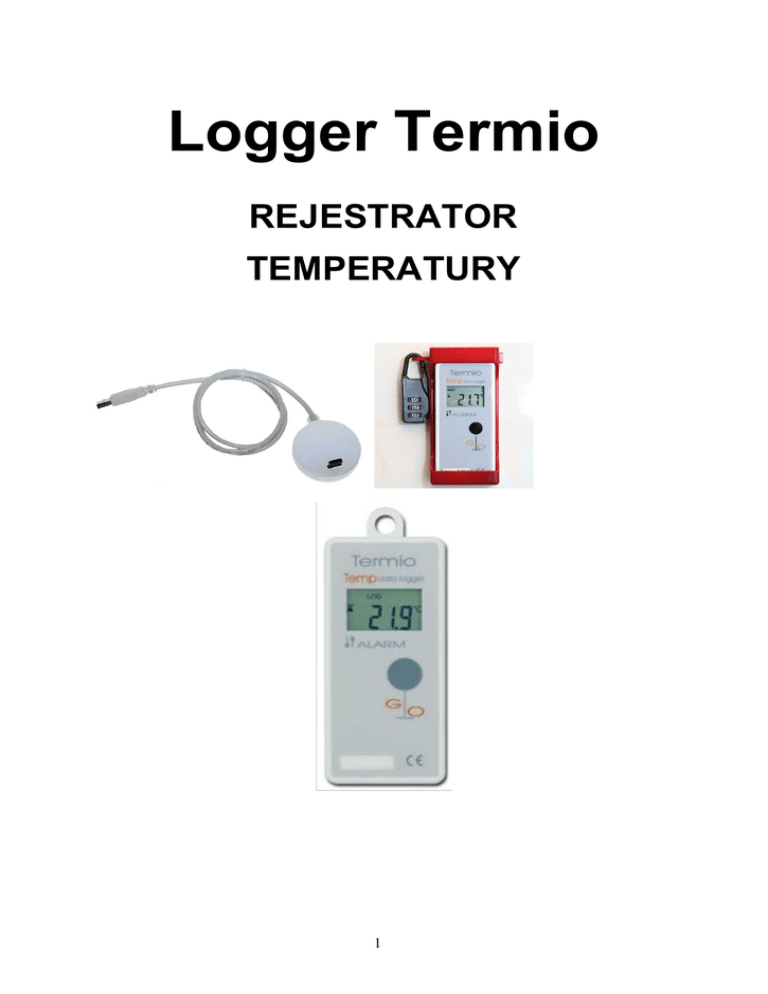 Logger Termio REJESTRATOR TEMPERATURY 1 Spis treści Przeznaczenie urządzenia ........................................................................................................... 3 Dane techniczne ......................................................................................................................... 3 Opis urządzenia .......................................................................................................................... 4 Instalacja i uruchomienie rejestratora ........................................................................................ 4 Okno główne programu .............................................................................................................. 5 Pomiary ...................................................................................................................................... 6 Rejestracja .................................................................................................................................. 8 Wyniki ........................................................................................................................................ 9 Urządzenie ................................................................................................................................ 11 Funkcje serwisowe ................................................................................................................... 11 Jak uruchomić rejestrację? ....................................................................................................... 12 Praca rejestratora ...................................................................................................................... 13 Jak zatrzymać rejestrację? ........................................................................................................ 13 2 Przeznaczenie urządzenia Rejestrator Termio przeznaczony jest do pomiaru i rejestracji temperatury lub temperatury i wilgotności ( Termio + ) w pomieszczeniach i transporcie. Urządzenie jest wyposażone w nowoczesny układ scalony zawierający czujnik temperatury i wilgotności oraz zegar czasu rzeczywistego i pamięć gdzie zapisywane są pomiary. Urządzenie zasilane jest za pomocą wewnętrznej baterii. Rejestrator współpracuje z komputerem. Za pomocą załączonego w zestawie programu LogSoft można: ustalić parametry pracy rejestratora takie jak: - czas uruchomienia - częstotliwość pomiarów - progi alarmowe odczytać i wydrukować zarejestrowane pomiary w postaci tabeli przedstawić wyniki w postaci wykresu na ekranie komputera lub wydruku zapisać wyniki rejestracji na dysku w formacie tekstowym umożliwiającym następnie wczytanie ich do innych programów jak np. EXCEL. Termio można zaprogramować również tak, aby włączenie rejestracji następowało w wyniku naciśnięcia przycisku znajdującego się na przednim panelu, a także z opóźnieniem - o ustalonym czasie. Urządzenie rejestrujące ma małe rozmiary tak, że można je umieścić w dowolnym miejscu. W bardzo prosty sposób łączy się go za pośrednictwem adaptera do portu USB lub szeregowego COM komputera. Dane techniczne zakres mierzonych temperatur -30°C do 70°C Rozdzielczość dokładność °C w całym zakresie pomiarowym 0,1 -/+0,5°C lub lepsza w zakresie pomiarowym -20°C do 40°C -/+1°C w pozostałym zakresie pomiarowym wyświetlacz częstość zapisu Pamięć czas pracy baterii Zasilanie Interfejs wymiary obudowy stopień ochrony obudowy Waga LCD od 1 sekundy do 1440 minut (24 godz) 32703 pomiarów 1000 000 zapisów bateria 1/2xAA 3,6V USB 45x100x19 mm IP65 85g 3 Opis urządzenia Logger Termio zamknięty jest w specjalnej obudowie przemysłowej z tworzywa ABS o dużej wytrzymałości mechanicznej. W konstrukcji rejestratora zastosowano specjalne uszczelnienia, dzięki czemu odporny jest na kurz, brud i wodę. Wyposażony jest w niewielki wyświetlacz, na którym można obserwować: aktualny stan (LOG – rejestracja lub WAIT – nie rejestruje), bieżącą temperaturę i wilgotność, zarejestrowane wartości minimum i maksimum ustawione progi minimum i maksimum w czasie transmisji danych między urządzeniem a komputerem po uruchomieniu programu na wyświetlaczu wyświetlany jest napis PC-- . Posiada jeden przycisk, za pomocą którego można sekwencyjnie zmienić aktualnie wyświetlaną wartość na wyświetlaczu, a także uruchomić pracę loggera po wcześniejszym zaprogramowaniu za pomocą komputera. Na dole obudowy znajduje się wtyk do podłączenia z adapterem. Instalacja i uruchomienie rejestratora Instalacja rejestratora sprowadza się do: 1. podłączenia wtyczki adaptera z - wolnym portem szeregowym komputera oznaczonym najczęściej jako COM lub - wolnym portem USB. 2. skopiowania programu obsługującego rejestrator LogSoft.exe do dowolnego folderu na dysku komputera i utworzeniu skrótu na pulpicie ( lub bezpośrednio skopiowanie programu na pulpit ). Po tych czynnościach rejestrator jest gotowy do uruchomienia. Aby uruchomić program należy kliknąć na ikonę programu LogSoft 4 Okno główne programu Po uruchomieniu programu pojawi się główne okno aplikacji. W przypadku, gdy urządzenie jest podłączone nastąpi automatyczne odczytanie stanu urządzenia. Okno zawiera podstawowe informacje o loggerze. Niektóre elementy okna są ukryte lub wyłączone (niedostępne) w zależności od stanu, w jakim znajduje się Termio. Górna część okna głównego zawiera wiersz menu, w którym dostępne są dwie funkcje: Plik Zakończ - zakończenie pracy z programem Ustawienia USB , COM1, COM3 - wybór portu do komunikacji Główna część okna programu zmienia się w zależności od wybranej zakładki: 1. Pomiary - podstawowe dane urządzenia 2. Rejestracja - parametry uruchomienia i rejestrowania danych 3. Wyniki - odczyt i prezentacja zarejestrowanych danych 4. Urządzenie - dane fabryczne loggera i stopień jego zużycia Wyboru zakładki oraz 
