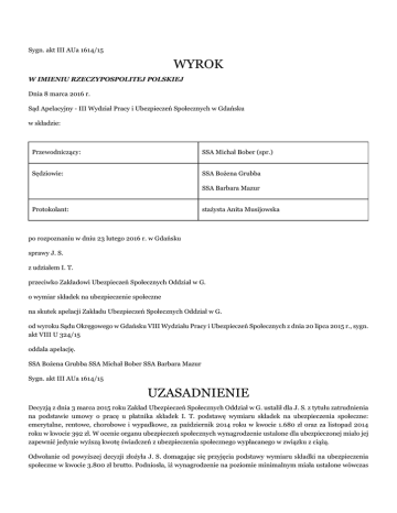 Sygn. akt III AUa 1614/15 WYROK W IMIENIU RZECZYPOSPOLITEJ POLSKIEJ Dnia 8 marca 2016 r. Sąd Apelacyjny - III Wydział Pracy i Ubezpieczeń Społecznych w Gdańsku w składzie: Przewodniczący: SSA Michał Bober (spr.) Sędziowie: SSA Bożena Grubba SSA Barbara Mazur Protokolant: stażysta Anita Musijowska po rozpoznaniu w dniu 23 lutego 2016 r. w Gdańsku sprawy J. S. z udziałem I. T. przeciwko Zakładowi Ubezpieczeń Społecznych Oddział w G. o wymiar składek na ubezpieczenie społeczne na skutek apelacji Zakładu Ubezpieczeń Społecznych Oddział w G. od wyroku Sądu Okręgowego w Gdańsku VIII Wydziału Pracy i Ubezpieczeń Społecznych z dnia 20 lipca 2015 r., sygn. akt VIII U 324/15 oddala apelację. SSA Bożena Grubba SSA Michał Bober SSA Barbara Mazur Sygn. akt III AUa 1614/15 UZASADNIENIE Decyzją z dnia 3 marca 2015 roku Zakład Ubezpieczeń Społecznych Oddział w G. ustalił dla J. S. z tytułu zatrudnienia na podstawie umowy o pracę u płatnika składek I. T. podstawę wymiaru składek na ubezpieczenia społeczne: emerytalne, rentowe, chorobowe i wypadkowe, za październik 2014 roku w kwocie 1.680 zł oraz za listopad 2014 roku w kwocie 392 zł. W ocenie organu ubezpieczeń społecznych wynagrodzenie ustalone dla ubezpieczonej miało jej zapewnić jedynie wyższą kwotę świadczeń z ubezpieczenia społecznego wypłacanego w związku z ciążą. Odwołanie od powyższej decyzji złożyła J. S. domagając się przyjęcia podstawy wymiaru składki na ubezpieczenia społeczne w kwocie 3.800 zł brutto. Podniosła, iż wynagrodzenie na poziomie minimalnym miała ustalone wówczas gdy studiowała i była zatrudniona w wymiarze połowy etatu. W trakcie zatrudnienia ukończyła studia i podniosła kwalifikacje poprzez uzyskanie certyfikatu księgowego, dzięki czemu pracodawca zaproponował jej awans na samodzielną księgową oraz podwyżkę wynagrodzenia. Nadto wskazała, iż umowa o pracę została zawarta, a praca była przez nią wykonywana. Pozwany w odpowiedzi na odwołanie wniósł o jego oddalenie, podtrzymując argumentację zawartą w zaskarżonej decyzji. Sąd Okręgowy Sąd Pracy i Ubezpieczeń Społecznych w Gdańsku wyrokiem z dnia 20 lipca 2015 roku zmienił zaskarżoną decyzję i ustalił, że podstawa wymiaru składek na pracownicze ubezpieczenie społeczne J. S. jako wynosi od 1 października 2014 roku 3.800 zł. Swoje rozstrzygnięcie Sąd ten oparł na następujących ustaleniach faktycznych i prawnych. Zainteresowana I. T. w okresie od 1999 roku do 31 maja 2015 roku prowadziła działalność gospodarczą w zakresie usługowego prowadzenia ksiąg rachunkowych osób fizycznych i prawnych pod firmą Biuro (...). Od 9 lat przysługuje jej prawo do emerytury. Choruje na zaawansowaną chorobę wieńcową, przebyła zawał. W okresie od 1 marca 2006 roku do 31 maja 2015 roku zainteresowana zatrudniała E. K., na stanowisku specjalisty ds. płac, w pełnym wymiarze czasu pracy, z wynagrodzeniem 1.750 zł brutto miesięcznie. W zakres jej czynności wchodziło sporządzanie list płac oraz przesyłanie, za pośrednictwem programu Płatnik, deklaracji rozliczeniowych do ZUS. W okresie od 1 maja 2006 roku do 31 maja 2007 roku i od 1 czerwca 2007 roku do 31 maja 2015 roku zatrudniała A. K., odpowiednio na stanowisku księgowej i samodzielnej księgowej, w pełnym wymiarze czasu pracy, z wynagrodzeniem 2.900 zł brutto miesięcznie. Do jej obowiązków zawodowych należało odbieranie od klientów w siedzibie biura niezbędnych dokumentów, samodzielne prowadzenie księgowości klientów i ksiąg handlowych. W ramach powyższego zatrudnienia A. K. w okresie od 26 czerwca 2014 roku do 31 maja 2015 roku pozostawała na urlopie macierzyńskim. Kolejny pracownik zainteresowanej, E. T. przebywała na urlopie wychowawczym od 1 września 2011 roku do 31 sierpnia 2014 roku. W okresie od 20 marca 2014 roku do 30 listopada 2014 roku w Biurze (...) odbywała staż W. M., która została zatrudniona przez zainteresowaną od 1 grudnia 2014 roku do 31 maja 2015 roku, na stanowisku księgowej, w pełnym wymiarze czasu pracy, za wynagrodzeniem 2.500 zł brutto miesięcznie. W zakres jej obowiązków wchodziło wprowadzanie dokumentów księgowych do ewidencji VAT i (...) za pomocą programów komputerowych, pod nadzorem zainteresowanej, wstępne przygotowanie i sporządzanie deklaracji rozliczeniowych z zakresu podatku dochodowego i VAT. W dniu 30 października 2009 roku zainteresowana I. T. zawarła z J. S. (wówczas P.) umowę o pracę na czas nieokreślony, w pełnym wymiarze czasu pracy, na stanowisku księgowej. Strony w pkt 4 tej umowy określiły wynagrodzenie ubezpieczonej na „najniższe wynagrodzenie krajowe ogłoszone w Monitorze Polskim”. Dnia 31 grudnia 2009 roku strony zawarły aneks do powyższej umowy o pracę, w którym wskazały, iż z dniem 1 stycznia 2010 roku ulega zmianie wymiar czasu pracy na 1/2 etatu oraz wysokość wynagrodzenia na „1/2 najniższego wynagrodzenia krajowego ogłoszonego w Monitorze Polskim”. Pozostałe warunki umowy nie uległy zmianie. W dniu 25 lipca 2013 roku J. S. ukończyła, w formie niestacjonarnej, studia na (...), na kierunku finanse i rachunkowość, w specjalności rachunkowość i uzyskała tytuł magistra. Dnia 25 marca 2014 roku zainteresowana I. T. w zaświadczeniu potwierdzającym posiadanie przez ubezpieczoną praktyki w księgowości, wystawionym Ministerstwu Finansów, wskazała, iż prowadzi ona, na podstawie dowodów księgowych, księgi rachunkowe, ujmujące zdarzenia w porządku chronologicznym i systematycznym, prowadzi wycenę aktywów i pasywów, ustala wynik finansowy i sporządza sprawozdania finansowe. W dniu 22 kwietnia 2014 roku wnioskodawczyni uzyskała certyfikat księgowy nr (...), wydany przez Ministra Finansów Rzeczypospolitej Polskiej, potwierdzający kwalifikacje i uprawnienie do usługowego prowadzenia ksiąg rachunkowych. Posiada również certyfikat ukończenia kursu e-learningowego „Z
