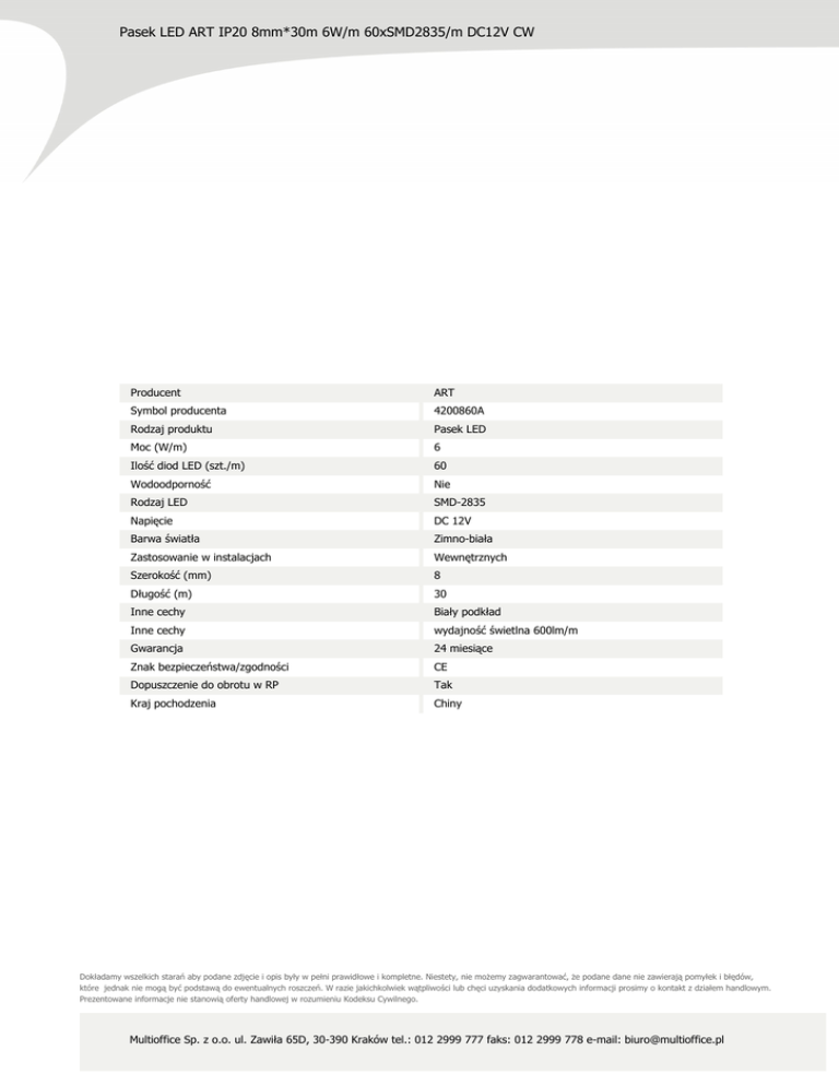 Pasek LED ART IP20 8mm*30m 6W/m 60xSMD2835/m DC12V CW Producent ART Symbol producenta 4200860A Rodzaj produktu Pasek LED Moc (W/m) 6 Ilość diod LED (szt./m) 60 Wodoodporność Nie Rodzaj LED SMD-2835 Napięcie DC 12V Barwa światła Zimno-biała Zastosowanie w instalacjach Wewnętrznych Szerokość (mm) 8 Długość (m) 30 Inne cechy Biały podkład Inne cechy wydajność świetlna 600lm/m Gwarancja 24 miesiące Znak bezpieczeństwa/zgodności CE Dopuszczenie do obrotu w RP Tak Kraj pochodzenia Chiny Dokładamy wszelkich starań aby podane zdjęcie i opis były w pełni prawidłowe i kompletne. Niestety, nie możemy zagwarantować, że podane dane nie zawierają pomyłek i błędów, które jednak nie mogą być podstawą do ewentualnych roszczeń. W razie jakichkolwiek wątpliwości lub chęci uzyskania dodatkowych informacji prosimy o kontakt z działem handlowym. Prezentowane informacje nie stanowią oferty handlowej w rozumieniu Kodeksu Cywilnego. Multioffice Sp. z o.o. ul. Zawiła 65D, 30-390 Kraków tel.: 012 2999 777 faks: 012 2999 778 e-mail: [email protected]