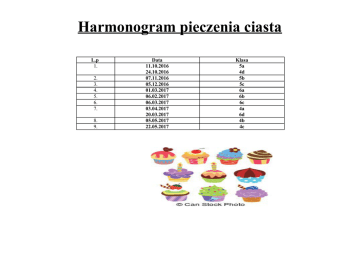 Harmonogram pieczenia ciasta L.p 1. 2. 3. 4. 5. 6. 7. 8. 9. Data 11.10.2016 24.10.2016 07.11.2016 05.12.2016 01.03.2017 06.02.2017 06.03.2017 03.04.2017 20.03.2017 05.05.2017 22.05.2017 Klasa 5a 4d 5b 5c 6a 6b 6c 4a 6d 4b 4c