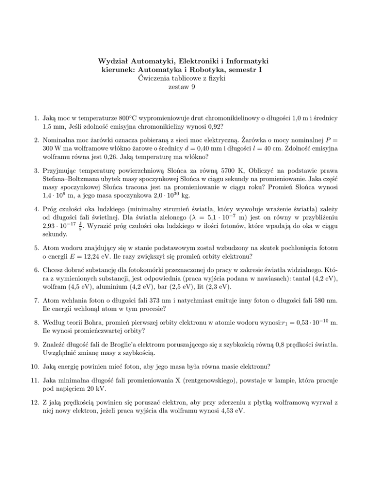 Wydział Automatyki, Elektroniki i Informatyki kierunek: Automatyka i Robotyka, semestr I Ćwiczenia tablicowe z fizyki zestaw 9 1. Jaką moc w temperaturze 800◦C wypromieniowuje drut chromonikielinowy o długości 1,0 m i średnicy 1,5 mm, Jeśli zdolność emisyjna chromonikieliny wynosi 0,92? 2. Nominalna moc żarówki oznacza pobieraną z sieci moc elektryczną. Żarówka o mocy nominalnej P = 300 W ma wolframowe włókno żarowe o średnicy d = 0,40 mm i długości l = 40 cm. Zdolność emisyjna wolframu równa jest 0,26. Jaką temperaturę ma włókno? 3. Przyjmując temperaturę powierzchniową Słońca za równą 5700 K, Obliczyć na podstawie prawa Stefana–Boltzmana ubytek masy spoczynkowej Słońca w ciągu sekundy na promieniowanie. Jaka część masy spoczynkowej Słońca tracona jest na promieniowanie w ciągu roku? Promień Słońca wynosi 1,4 · 109 m, a jego masa spoczynkowa 2,0 · 1030 kg. 4. Próg czułości oka ludzkiego (minimalny strumień światła, który wywołuje wrażenie światła) zależy od długości fali świetlnej. Dla światła zielonego (λ = 5,1 · 10−7 m) jest on równy w przybliżeniu 2,93 · 10−17 Js . Wyrazić próg czułości oka ludzkiego w ilości fotonów, które wpadają do oka w ciągu sekundy. 5. Atom wodoru znajdujący się w stanie podstawowym został wzbudzony na skutek pochłonięcia fotonu o energii E = 12,24 eV. Ile razy zwiększył się promień orbity elektronu? 6. Chcesz dobrać substancję dla fotokomórki przeznaczonej do pracy w zakresie światła widzialnego. Która z wymienionych substancji, jest odpowiednia (praca wyjścia podana w nawiasach): tantal (4,2 eV), wolfram (4,5 eV), aluminium (4,2 eV), bar (2,5 eV), lit (2,3 eV). 7. Atom wchłania foton o długości fali 373 nm i natychmiast emituje inny foton o długości fali 580 nm. Ile energii wchłonął atom w tym procesie? 8. Według teorii Bohra, promień pierwszej orbity elektronu w atomie wodoru wynosi:r1 = 0,53 · 10−10 m. Ile wynosi promieńczwartej orbity? 9. Znaleźć długość fali de Broglie’a elektronu poruszającego się z szybkością równą 0,8 prędkości światła. Uwzględnić zmianę masy z szybkością. 10. Jaką energię powinien mieć foton, aby jego masa była równa masie elektronu? 11. Jaka minimalna długość fali promieniowania X (rentgenowskiego), powstaje w lampie, która pracuje pod napięciem 20 kV. 12. Z jaką prędkością powinien się poruszać elektron, aby przy zderzeniu z płytką wolframową wyrwał z niej nowy elektron, jeżeli praca wyjścia dla wolframu wynosi 4,53 eV.