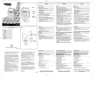 XP AE1505/14 A7up5x3 29-03-2000 15:59 Pagina 1 AE 1505 Pocket Radio 1 POWER SUPPLY Battery (not included) AERIAL • Open battery door and insert two alkaline batteries, type R6, UM3 or AA as indicated inside the compartment. • Remove the batteries from the set if they are exhausted or not to be used for a long time. Batteries contain chemical substances, so they should be disposed of properly. AE1505 POC KET RAD IO AE1505 POC KET RAD IO AM 53 65 83 100 120 170 kHz FM 88 92 96 100 104 108 MHz AM 53 65 83 100 120 170 kHz FM 88 92 96 100 104 108 MHz DIAL LENS 0 0 20 40 60 80 20 40 60 100 80 RADIO RECEPTION 100 TUNING 1. • 2. 3. BAND MW (AM)/FM • 4. 5. • • 6. MAINTENANCE 2 AE 1505 - Pocket Radio Turn VOL/ POWER OFF clockwise to switch on the radio. You will hear a small click when switching on. Adjust the volume level with VOL/ POWER OFF. For personal listening, connect headphones with a 3.5 mm plug to the p socket. The built-in speaker will then be muted. Adjust the band switch to FM/MW (AM) to select your waveband. Tune to the desired radio station by turning the TUNING wheel. For FM, pull out the telescopic aerial. Reduce its length if the FM signal is too strong (very close to a transmitter). For MW (AM), the set is provided with a built-in aerial. Turn the whole set to find the best position. To switch off the set, turn VOL/ POWER OFF anti-clockwise until you hear a small click. • Use a soft damp cloth to wipe off dust and dirt. Don't use benzene or corrosives to clean the set. • Don't expose the set to rain, moisture, sand or to excessive heat e.g. cars parked in direct sunlight. English TAKE CARE WHEN USING HEADPHONES êÛÒÒÍËÈ Polski VOL Æesky POWER OFF VOL/POWER OFF ENVIRONMENTAL NOTE Slovensky Magyar Hearing Safety: Listen at a moderate volume. Use at high volume can impair your hearing! Traffic Safety: Do not use headphones while driving or cycling as you may cause an accident! • The packaging has been minimized so that it is easy to separate into two materials: cardboard and plastic. Please observe the local regulations regarding the disposal of these packaging materials. • Please inquire about local regulations on how to hand in your old set for recycling. p BATTERY COMPARTMENT Polski êÛÒÒÍËÈ English èàíÄçàÖ Å‡Ú‡Âfl (Ì ‚Íβ˜‡ÂÚÒfl ‚ ÍÓÏÔÎÂÍÚ) • éÚÍÓÈÚ ÓÚ‰ÂÎÂÌË ·‡Ú‡ÂÈ Ë ‚ÒÚ‡‚¸Ú ‰Â ˘ÂÓ˜˚ ·‡Ú‡ÂË ÚËÔ‡ R6, UM3 ËÎË AA, Í‡Í ÔÓ͇Á‡ÌÓ ‚ ÓÚ‰ÂÎÂËË. • àÁ‚ÎÂÍÚ ·‡Ú‡ÂË ËÁ ÔËÂÏÌË͇, ÂÒÎË ÓÌË ‡ÁflÊÂ˚ ËÎË Ì ÔÓ„ÛÚ ËÒÔÓθÁÓ‚‡Ú¸Òfl ̇ ÔÓÚflÊÂÌËË ‰ÎËÚÂθÌÓ„Ó ‚ÂÏÂÌË. ŇڇÂË ÒÓ‰ÂÊ‡Ú ıËÏ˘ÂÒÍË ‚¢ÂÒÚ‚‡, ÔÓ˝ÚÓÏÛ Ëı ÒΉÛÂÚ ËÁ‚ÎÂ͇ڸ ÒÓÓÚ‚ÂÚÒÚ‚Û˛˘ËÏ Ó·‡ÁÓÏ. èêàÖå PÄÑàéëçÉçÄãéÇ 1. ÑÎfl ÚÓ„Ó, ˜ÚÓ·˚ ‚Íβ˜ËÚ¸ ‡‰ËÓ, ÔÓ‚ÂÌËÚ VOL/ POWER OFF ÔÓ ˜‡ÒÓ‚ÓÈ ÒÚÂÎÍÂ. • èË ‚Íβ˜ÂÌËË ÔÓÒÎ˚¯ËÚÒfl ÚËıËÈ ˘ÂΘÓÍ. 2. éÚ„ÛÎËÛÈÚ ÛÓ‚Â̸ Á‚Û͇ ÔË ÔÓÏÓ˘Ë VOL/ POWER OFF. 3. ÑÎfl Ë̉˂ˉۇÎÌÓ„Ó ÔÓÒÎۯ˂‡ÌËfl ÔËÒÓ‰ËÌËÚ ̇ۯÌËÍË Ò 3,5 ÏÏ ¯ÚÂÍÂÓÏ Í „ÌÂÁ‰Û p. • èË ˝ÚÓÏ ‚ÒÚÓÂÌÌ˚È ‰Ë̇ÏËÍ ‚˚Íβ˜ËÚÒfl. 4. ìÒÚ‡ÌÓ‚ËÚ ÔÂÂÍÎ˛Û‡ÚÂθ ˜‡ÒÚÓÚ Ì‡ FM/MW (AM) ‰Îfl ‚˚·Ó‡ ‚ÓÎÌ˚ ÌÛÊÌÓÈ ‚‡Ï ‰ÎËÌ˚. 5. èÂÂÍβ˜ËÚÂÒ¸ ̇ ÌÂÓ·ıÓ‰ËÏÛ˛ Ç‡Ï ‡‰ËÓÒÚ‡ÌˆË˛, ÔÓ‚Ó‡˜Ë‚‡fl ÍÓÎÂÒÓ Ì‡ÒÚÓÈÍË TUNING. • ÑÎfl ÚÓ„Ó ˜ÚÓ·˚ ÔËÌËχڸ FM, ‚˚‰‚Ë̸Ú ÒÍ·‰ÌÛ˛ ‡ÌÚÂÌÌÛ. ìÏÂ̸¯Ëڠ ‰ÎËÌÛ, ÂÒÎÌ Ò˄̇ΠFM ÒËθÌ˚È (Ô‰‡Ú˜ËÍ Ì‡ıÓ‰ËÚÒfl Ó˜Â̸ ·ÎËÁÍÓ). • èËÂÏÌËÍ ÓÒ̇˘ÂÌ ‚ÒÚÓÂÌÓÈ ‡ÌÚÂÌÌÓÈ ‰Îfl ÔËÌflÚËfl Ò˄̇ÎÓ‚ MW (AM). èÓ‚ÂÌËÚ ÔËÂÏÌËÍ,˜ÚÓ·˚ ̇ÈÚË Ì‡ËÎÛ˜¯Â ÔÓÎÓÊÂÌËÂ. 6. óÚÓ·˚ ‚˚Íβ˜ËÚ¸ ÔËÂÏÌËÍ, ‚‡˘‡ÈÚ VOL/ POWER OFF ÔÓÚË‚ ˜‡ÒÓ‚ÓÈ ÒÚÂÎÍË, ÔÓ͇ Ì ÛÒθ¯ËÚ ÚËıËÈ ˘ÂΘÓÍ. ìïéÑ ZASILACZ Baterie (nie zawarte) • Otworzyæ dzrwiczki przedzia¬u baterii i za¬o¿yæ na miejsce dwie baterie alkaliczne, typu R6, UM3 lub AA, jak pokazano wewnåtrz pojemnika na baterie. • Baterie nale¿y wyjåæ w razie ich wyczerpania lub na czas d¬u¿szego nie korzystania z urzådzenia. Baterie zawierajå substancje chemiczne, a zatem nale¿y siê ich odpowiednio pozbywaæ. ODBIÓR RADIOWY 1. W celu w¬åczenia odbiornika obróciæ pokrêt¬o VOL/ POWER OFF w kierunku zgodnym z ruchem wskazówek zegara. • S¬yszalne bêdzie ciche klikniêcie. 2. Ustawiæ ¿ådany poziom g¬oœnoœci za pomocå pokrêt¬a VOL/ POWER OFF. 3. Istnieje mo¿liwoœæ indywidualnego ods¬uchu, za pomocå s¬uchawek, które pod¬åcza siê do gniazda 3,5 mm p. • Po pod¬åczeniu s¬uchawek od¬åczony zostanie wbudowany g¬oœnik. 4. Wyboru zakresu dokonuje siê za pomocå prze¬åcznika FM/MW (AM). 5. Obracajåc pokrêt¬o TUNING dostroiæ odbiornik do ¿ådanej stacji. • Przy odbiorze stacji z zakresu FM, nale¿y wyciågnåæ antenê teleskopowå. Jeœli sygna¬ jest zbyt silny, co mo¿e siê zdarzyæ w przypadku ods¬uchu w pobli¿u nadajnika, nale¿y zmniejszyæ jej d¬ugoœæ. • Do odbioru sygna¬u z zakresów MW (AM) s¬u¿y antena wewnêtrzna. Optymalny odbiór uzyskuje siê obracajåc odbiornik. 6. Aby wy¬åczyæ radio, nale¿y do oporu przekrêciæ pokrêt¬o VOL/ POWER OFF w kierunku przeciwnym do ruchu wskazówek zegara. KONSERWACJA • ÑÎfl ÚÓ„Ó, ˜ÚÓ·˚ Û‰‡ÎËÚ¸ Ô˚θ Ë „flÁ¸, ÔÓθÁÛÈÚÂÒ¸ Ïfl„ÍÓÈ ‚·ÊÌÓÈ ÚflÔÍÓÈ. ÑÎfl ˜ËÒÚÍË ÛÒÚÓÈÒÚ‚‡ Ì ÒΉÛÂÚ ÔÓθÁÓ‚