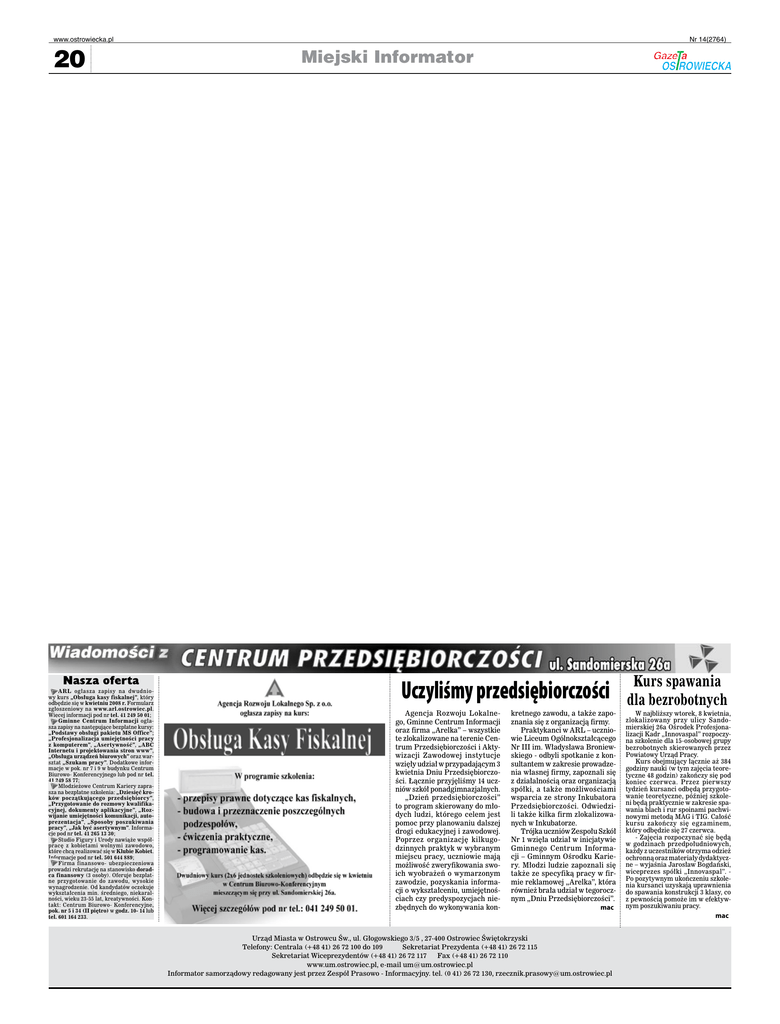 www.ostrowiecka.pl 20 Nasza oferta A R L ogłasza zapisy na dw udnio wy kurs „Obsługa kasy fiskalnej”, który odbędzie się w kwietniu 2008 r. Formularz zgłoszeniowy na www.arl.ostrowiec.pl. Więcej informacji pod nr tel. 41 249 50 01; Gminne Centrum Informacji ogłasza zapisy na następujące bezpłatne kursy: „Podstawy obsługi pakietu MS Office”; „Profesjonalizacja umiejętności pracy z komputerem”, „Asertywność”, „ABC Internetu i projektowania stron www”, „Obsługa urządzeń biurowych” oraz warsztat „Szukam pracy”. Dodatkowe informacje w pok. nr 7 i 9 w budynku Centrum Biurowo- Konferencyjnego lub pod nr tel. 41 249 58 77; Młodzieżowe Centrum Kariery zaprasza na bezpłatne szkolenia: „Dziesięć kroków początkującego przedsiębiorcy”, „Przygotowanie do rozmowy kwalifikacyjnej, dokumenty aplikacyjne”, „Rozwijanie umiejętności komunikacji, autoprezentacja”, „Sposoby poszukiwania pracy”, „Jak być asertywnym”. Informacje pod nr tel. 41 265 13 30; Studio Figury i Urody nawiąże współpracę z kobietami wolnymi zawodowo, które chcą realizować się w Klubie Kobiet. Informacje pod nr tel. 501 644 889; Firma finansowo- ubezpieczeniowa prowadzi rekrutację na stanowisko doradca finansowy (3 osoby). Oferuje bezpłatne przygotowanie do zawodu, w ysokie wynagrodzenie. Od kandydatów oczekuje wykształcenia min. średniego, niekaralności, wieku 23-55 lat, kreatywności. Kontakt: Centrum Biurowo- Konferencyjne, pok. nr 5 i 34 (II piętro) w godz. 10- 14 lub tel. 601 164 233. Nr 14(2764) Miejski Informator Uczyliśmy przedsiębiorczości Agencja Rozwoju Lokalnego, Gminne Centrum Informacji oraz firma „Arelka” – wszystkie te zlokalizowane na terenie Centrum Przedsiębiorczości i Aktywizacji Zawodowej instytucje wzięły udział w przypadającym 3 kwietnia Dniu Przedsiębiorczości. Łącznie przyjęliśmy 14 uczniów szkół ponadgimnazjalnych. „Dzień przedsiębiorczości” to program skierowany do młodych ludzi, którego celem jest pomoc przy planowaniu dalszej drogi edukacyjnej i zawodowej. Poprzez organizację kilkugodzinnych praktyk w wybranym miejscu pracy, uczniowie mają możliwość zweryfikowania swoich wyobrażeń o wymarzonym zawodzie, pozyskania informacji o wykształceniu, umiejętnościach czy predyspozycjach niezbędnych do wykonywania kon- kretnego zawodu, a także zapoznania się z organizacją firmy. Praktykanci w ARL – uczniowie Liceum Ogólnokształcącego Nr III im. Władysława Broniewskiego - odbyli spotkanie z konsultantem w zakresie prowadzenia własnej firmy, zapoznali się z działalnością oraz organizacją spółki, a także możliwościami wsparcia ze strony Inkubatora Przedsiębiorczości. Odwiedzili także kilka firm zlokalizowanych w Inkubatorze. Trójka uczniów Zespołu Szkół Nr 1 wzięła udział w inicjatywie Gminnego Centrum Informacji – Gminnym Ośrodku Kariery. Młodzi ludzie zapoznali się także ze specyfiką pracy w firmie reklamowej „Arelka”, która również brała udział w tegorocznym „Dniu Przedsiębiorczości”. mac Urząd Miasta w Ostrowcu Św., ul. Głogowskiego 3/5 , 27-400 Ostrowiec Świętokrzyski Telefony: Centrala (+48 41) 26 72 100 do 109 Sekretariat Prezydenta (+48 41) 26 72 115 Sekretariat Wiceprezydentów (+48 41) 26 72 117 Fax (+48 41) 26 72 110 www.um.ostrowiec.pl, e-mail [email protected] Informator samorządowy redagowany jest przez Zespół Prasowo - Informacyjny. tel. (0 41) 26 72 130, [email protected] Kurs spawania dla bezrobotnych W najbliższy wtorek, 8 kwietnia, zlokalizowany przy ulicy Sandomierskiej 26a Ośrodek Profesjonalizacji Kadr „Innovaspal” rozpoczyna szkolenie dla 15-osobowej grupy bezrobotnych skierowanych przez Powiatowy Urząd Pracy. Kurs obejmujący łącznie aż 384 godziny nauki (w tym zajęcia teoretyczne 48 godzin) zakończy się pod koniec czerwca. Przez pierwszy tydzień kursanci odbędą przygotowanie teoretyczne, później szkoleni będą praktycznie w zakresie spawania blach i rur spoinami pachwinowymi metodą MAG i TIG. Całość kursu zakończy się egzaminem, który odbędzie się 27 czerwca. - Zajęcia rozpoczynać się będą w godzinach przedpołudniowych, każdy z uczestników otrzyma odzież ochronną oraz materiały dydaktyczne – wyjaśnia Jarosław Bogdański, wiceprezes spółki „Innovaspal”. Po pozytywnym ukończeniu szkolenia kursanci uzyskają uprawnienia do spawania konstrukcji 3 klasy, co z pewnością pomoże im w efektywnym poszukiwaniu pracy. mac