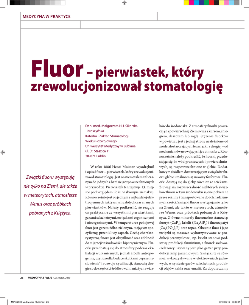 MEDYCYNA W PRAKTYCE Fluor – pierwiastek, który zrewolucjonizował stomatologię Dr n. med. Małgorzata H.J. Sikorska ‑Jaroszyńska Katedra i Zakład Stomatologii Wieku Rozwojowego Uniwersytet Medyczny w Lublinie ul. St. Staszica 11 20‑071 Lublin Związki fluoru występują nie tylko na Ziemi, ale także w meteorytach, atmosferze Wenus oraz próbkach pobranych z Księżyca. 26 W roku 1886 Henri Moissan wyodrębnił i opisał fluor – pierwiastek, który zrewolucjoni‑ zował stomatologię. Jest on niemetalem zalicza‑ nym do jednych z bardziej rozpowszechnionych w przyrodzie. Pierwiastek ten zajmuje 13. miej‑ sce pod względem ilości w skorupie ziemskiej. Równocześnie jest on jednym z najbardziej elek‑ troujemnych i aktywnych z dotychczas znanych pierwiastków. Należy podkreślić, że reaguje on praktycznie ze wszystkimi pierwiastkami, gazami szlachetnymi, związkami organicznymi i nieorganicznymi. W temperaturze pokojowej fluor jest gazem żółto‑zielonym, mającym spe‑ cyficzny, przenikliwy zapach. Cechą charakte‑ rystyczną fluoru jest oksyfilność oraz zdolność do migracji w środowisku hipergenicznym. Flu‑ orki przedostają się do atmosfery podczas eks‑ halacji wulkanicznych, jednak źródła antropo‑ genne, czyli źródła będące skutkami „uprzemy‑ słowienia” i rozwoju cywilizacji, stanowią dru‑ gie co do częstości źródło uwalniania tych związ‑ ków do środowiska. Z atmosfery fluorki powra‑ cają na powierzchnię Ziemi wraz z kurzem, śnie‑ giem, deszczem lub mgłą. Stężenie fluorków w powietrzu jest z jednej strony uzależnione od źródeł dostarczających te związki, z drugiej – od mechanizmów usuwających je z atmosfery. Rów‑ nocześnie należy podkreślić, że fluorki, przedo‑ stając się do wód gruntowych i powierzchnio‑ wych, są rozpowszechnione w glebie. Dodat‑ kowym źródłem dostarczającym związków flu‑ oru glebie i roślinom są nawozy fosforowe. Flu‑ orki dostają się do gleby również ze ściekami. Z uwagi na rozpuszczalność niektórych związ‑ ków fluoru w tym środowisku są one pobierane przez rośliny i transportowane do ich nadziem‑ nych części. Związki fluoru występują nie tylko na Ziemi, ale także w meteorytach, atmosfe‑ rze Wenus oraz próbkach pobranych z Księ‑ życa. Główne minerały fluoronośne stanowią: fluoryt (CaF2), kriolit (Na3AlF6) i fluoroapatyt [Ca5(PO4)3F] oraz topaz. Obecnie fluor i jego związki są masowo wykorzystywane w pro‑ dukcji przemysłowej, np. kriolit stanowi pod‑ stawę produkcji aluminium, a fluorek sodowo ‑żelazowy używany jest jako getter przy pro‑ dukcji lamp jarzeniowych. Związki te są rów‑ nież wykorzystywane w elektrowniach jądro‑ wych, w syntezie gazów szlachetnych, produk‑ cji olejów, szkła oraz emalii. Za dopuszczalny MEDYCYNA I PASJE czerwiec 2010 MiP 3 2010 Med w prakt Fluor.indd 26 2010-06-16 12:36:07 Organizm ludzki przyswaja fluor głównie drogą pokarmową (ok. 2/3), poziom związków fluoru w wodzie pitnej przyj‑ muje się 1,5 mg/l. Stężenie fluoru w zwykłej surowej wodzie nie jest zazwyczaj wyższe niż 1,5 mg/l, natomiast w wodach podziemnych może dochodzić nawet do 10 mg/l. W porów‑ naniu z wodami z poziomów skał niewapien‑ nych wody wgłębne w rejonach występowania utworów wapiennych zawierają większe ilości fluoru. W wodach mineralnych w Polsce stwier‑ dza się dość wysokie stężenia fluoru. Wody morskie zawierają średnio 1,4‑1,5 ppm fluor‑ ków. W Polsce za optymalny poziom fluorków w wodzie przyjmuje się obecnie 1 mg/l. Oczy‑ wiście należy wziąć pod uwagę, że na określe‑ nie, jaki jest optymalny poziom związków fluoru w wodzie pitnej, wpływa klimat danego kraju albo jego poszczególnych obszarów. W krajach o klimacie ciepłym lub gorącym ilość związków fluoru powinna być niższa. Jest to spowodowane faktem, że w tych regionach ilość spożywanej wody, a co za tym idzie – dostarczanych związ‑ ków fluoru, jest wyższa. Metabolizm związków fluoru w organizmie człowieka jest procesem złożonym. Organizm ludzki przyswaja fluor głównie drogą pokar‑ mową (ok. 2/3), natomiast drogą oddechową wraz z wdychanym powietrzem związki fluoru wchłaniane są raczej wtedy, jeśli w powietrzu stwierdza się ich wysokie stężenia (najczęściej ma to miejsce w przypadku narażenia zawodo‑ wego). Fluorki absorbowane są przede wszyst‑ kim z przewodu pokarmowego. Wchłanianie tych związków rozpoczyna się już w jamie ust‑ nej, jednak absorbowane w ten sposób ilości są nieznaczne i nie przekraczają 1% spożywa‑ nych dziennie związków fluoru. Uważa się, że 40‑50% z pobranych związków jest wchła‑ niane w żołądku. U ludzi absorpcja związków fluoru może być uzależniona od wydzielania soku żołądkowego. Biorąc pod uwagę pozostałe części przewodu pokarmowego, uważa się, że większość związków fluoru jest przyswajana w górnej części jelita cienkiego. Trzeba jednak podkreślić, że proces resorpcji jest zaburzony i znacznie wolniejszy w przypadku połącze‑ nia się fluorków z jonami Ca 2+, Mg2+ lub Al3+. Ogólnie można stwierdzić, że spożycie związ‑ ków fluoru łącznie z pokarmami zawierającymi znaczne ilości dwu‑ lub trójwartościowych kationów jest istotnie zmniejszone. Wynika to z powstawania substancji nierozpuszczalnych albo precypitatów (w ten sposób oddziałuje na przykład mleko, substancją wpływającą ograni‑ czająco na pobieranie związków fluoru jest rów‑ nież chlorek sodu). Biorąc pod uwagę nauki medyczne, fluor wraz z wdychanym powietrzem związki fluoru wchłaniane są raczej wtedy, jeśli w powietrzu stwierdza się ich wysokie stężenia (najczęściej ma to miejsce w przypadku narażenia zawodowego). MEDYCYNA I PASJE czerwiec 2010 MiP 3 2010 Med w prakt Fluor.indd 27 MEDYCYNA W PRAKTYCE natomiast drogą oddechową 27 2010-06-16 12: