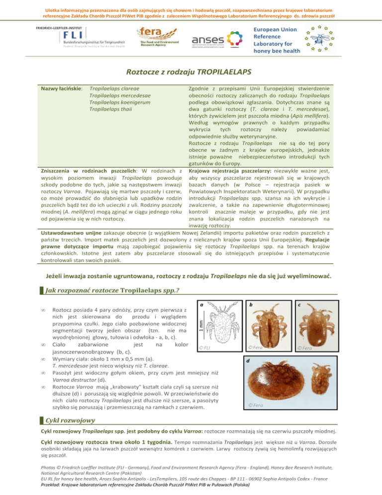 Ulotka informacyjna przeznaczona dla osób zajmujących się chowem i hodowlą pszczół, rozpowszechniana przez krajowe laboratorium referencyjne Zakładu Chorób Pszczół PIWet PIB zgodnie z zaleceniem Wspólnotowego Laboratorium Referencyjnego ds. zdrowia pszczół European Union Reference Laboratory for honey bee health Roztocze z rodzaju TROPILAELAPS Zgodnie z przepisami Unii Europejskiej stwierdzenie obecności roztoczy zaliczanych do rodzaju Tropilaelaps podlega obowiązkowi zgłaszania. Dotychczas znane są dwa gatunki roztoczy (T. clareae i T. mercedesae), których żywicielem jest pszczoła miodna (Apis mellifera). Według wymogów prawnych o każdym przypadku wykrycia tych roztoczy należy powiadamiać odpowiednie służby weterynaryjne. Roztocze z rodzaju Tropilaelaps nie są do tej pory obecne w żadnym z krajów europejskich, jednakże istnieje poważne niebezpieczeństwo introdukcji tych gatunków do Europy. Zniszczenia w rodzinach pszczelich: W rodzinach z Krajowa rejestracja pszczelarzy: niezwykle ważne jest, wysokim poziomem inwazji Tropilaelaps powoduje aby wszyscy pszczelarze rejestrowali się w krajowych szkody podobne do tych, jakie są następstwem inwazji bazach danych (w Polsce – rejestracja pasiek w roztoczy Varroa. Pojawiają się martwe pszczoły i czerw, Powiatowych Inspektoratach Weterynarii). W przypadku co może prowadzić do słabnięcia lub upadków rodzin introdukcji Tropilaelaps spp. szansa na ich wykrycie i pszczelich bądź też do ich ucieczki z uli. Rodziny pszczoły zwalczenie, a także na zapewnienie długoterminowej miodnej (A. mellifera) mogą zginąć w ciągu jednego roku kontroli znacznie maleje w przypadku, gdy nie jest znana lokalizacja rodzin pszczelich narażonych na od pojawienia się w nich roztoczy. inwazję roztoczy. Ustawodawstwo unijne zakazuje obecnie (z wyjątkiem Nowej Zelandii) importu pakietów oraz rodzin pszczelich z państw trzecich. Import matek pszczelich jest dozwolony z nielicznych krajów spoza Unii Europejskiej. Regulacje prawne dotyczące importu mają zapobiegać pojawieniu się roztoczy Tropilaelaps spp. na terenach krajów członkowskich. Istotne jest zatem aby pszczelarze stosowali się do istniejących przepisów i systematycznie kontrolowali stan swoich pasiek. Nazwy łacińskie: Tropilaelaps clareae Tropilaelaps mercedesae Tropilaelaps koenigerum Tropilaelaps thaii Jeżeli inwazja zostanie ugruntowana, roztoczy z rodzaju Tropilaelaps nie da się już wyeliminować. Jak rozpoznać roztocze Tropilaelaps spp.? a Roztocz posiada 4 pary odnóży, przy czym pierwsza z nich jest skierowana do przodu i wyglądem przypomina czułki. Jego ciało pozbawione widocznej segmentacji tworzy jeden obszar (tzn. nie ma wyodrębnionej głowy, tułowia i odwłoka - a, b, c). • Ciało zabarwione jest na kolor jasnoczerwonobrązowy (b, c). Wymiary ciała: około 1 mm x 0,5 mm (a). T. mercedesae jest nieco większy niż T. clareae. Pasożyt jest widoczny gołym okiem, przy czym jest mniejszy niż Varroa destructor (d). Roztocze Varroa mają „krabowaty” kształt ciała czyli są szersze niż dłuższe (d) i poruszają się względnie powoli. W przeciwieństwie do nich ciało roztoczy Tropilaelaps jest dłuższe niż szersze, a pasożyty szybko się poruszają i przemieszczają na ramkach z czerwiem. • • • b c 1 mm • d Cykl rozwojowy Cykl rozwojowy Tropilaelaps spp. jest podobny do cyklu Varroa: roztocze rozmnażają się na czerwiu pszczoły miodnej. Cykl rozwojowy roztocza trwa około 1 tygodnia. Tempo rozmnażania Tropilaelaps jest większe niż u Varroa. Dorosłe osobniki składają jaja na larwach pszczół wewnątrz komórek z czerwiem. Larwy roztoczy żywią się hemolimfą rozwijających się pszczół. Photos © Friedrich Loeffler Institute (FLI - Germany), Food and Environment Research Agency (Fera - England), Honey Bee Research Institute, National Agricultural Research Centre (Pakistan) EU RL for honey bee health, Anses Sophia Antipolis - LesTempliers, 105 route des Chappes - BP 111 - 06902 Sophia Antipolis Cedex - France Przekład: Krajowe laboratorium referencyjne Zakładu Chorób Pszczół PIWet PIB w Puławach (Polska) Tropilaelaps spp. żeruje wyłącznie na czerwiu. Dorosła pszczoła nie może być żywicielem roztoczy, ponieważ nie są one zdolne do przebicia powłok jej ciała. Przeżywalność pasożytów poza komórkami z czerwiem jest zatem dość krótka i nie przekracza 9. dni. Drogi rozprzestrzeniania: Rozprzestrzenianie się roztoczy pomiędzy pasiekami następuje za pośrednictwem dorosłych pszczół w trakcie naturalnych procesów związanych z błądzeniem, rabowaniem oraz rojeniem. Do szerzenia się roztoczy może przyczyniać się również dystrybucja zakażonych plastrów oraz rodzin pszczelich. Jednakże głównym powodem szybkiego rozprzestrzeniania się inwazji Tropilaelaps jest gospodarka wędrowna i przewożenie rodzin na nowe tereny. Niezmiernie istotne jest zatem, aby przed planowaną zmianą lokalizacji rodzin upewnić się, że są one zdrowe. Podejrzenie inwazji/ Konsekwencje inwazji dla rodziny pszczelej Objawy kliniczne inwazji Tropilaelaps są podobne do tych wywoływanych przez warrozę: Skrócone i zdeformowane skrzydła oraz odnóża Zdeformowany odwłok Otworki w zasklepach komórek Czerw rozstrzelony Martwy czerw Pszczoły pełzające przed wylotkiem ula e Jak należy przeglądać ule Do wykrywania roztoczy Tropilaelaps mogą być wykorzystywane metody służące do identyfikacji V. destructor: - Regularne sprawdzanie osypu na wkładkach dennicowych: 1. Używać w ulach siatek dennicowych lub lepkich wkładek (f). 2. W okresie f letnim regularnie usuwać osyp. 3. W przypadku dużej ilości osypu (np. po okresie zimowym) znalezienie roztoczy będzie trudne. Osyp należy wówczas zbadać bardzo starannie. Do tego celu można wykorzystać metodę wypłukiwania: osyp po umieszczeniu w gęstym sicie należy dokładnie wypłukać pod bieżącą wodą. Następnie sito umi