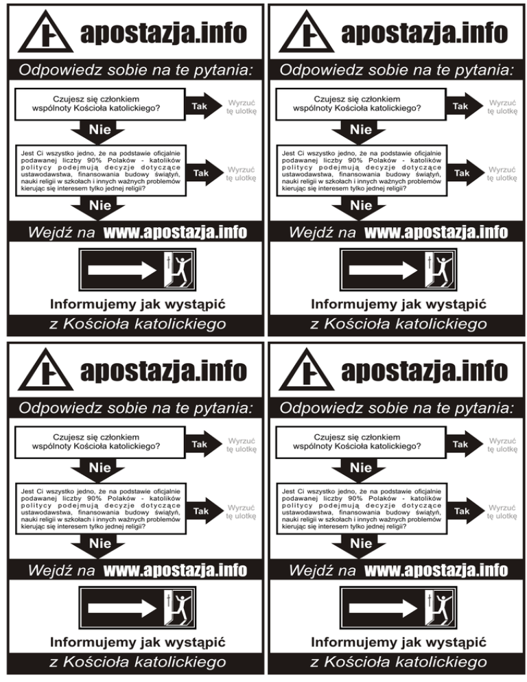 apostazja.info Odpowiedz sobie na te pytania: Czujesz siê cz³onkiem wspólnoty Koœcio³a katolickiego? Tak Tak Wyrzuæ tê ulotkê apostazja.info Odpowiedz sobie na te pytania: Czujesz siê cz³onkiem wspólnoty Koœcio³a katolickiego? Nie Nie Jest Ci wszystko jedno, ¿e na podstawie oficjalnie podawanej liczby 90% Polaków - katolików politycy podejmuj¹ decyzje dotycz¹ce ustawodawstwa, finansowania budowy œwi¹tyñ, nauki religii w szko³ach i innych wa¿nych problemów kieruj¹c siê interesem tylko jednej religii? Jest Ci wszystko jedno, ¿e na podstawie oficjalnie podawanej liczby 90% Polaków - katolików politycy podejmuj¹ decyzje dotycz¹ce ustawodawstwa, finansowania budowy œwi¹tyñ, nauki religii w szko³ach i innych wa¿nych problemów kieruj¹c siê interesem tylko jednej religii? Tak Wyrzuæ tê ulotkê Nie Tak Tak Wyrzuæ tê ulotkê Tak Wyrzuæ tê ulotkê Nie WejdŸ na www.apostazja.info WejdŸ na www.apostazja.info Informujemy jak wyst¹piæ Informujemy jak wyst¹piæ z Koœcio³a katolickiego z Koœcio³a katolickiego apostazja.info Odpowiedz sobie na te pytania: Czujesz siê cz³onkiem wspólnoty Koœcio³a katolickiego? Tak Tak Wyrzuæ tê ulotkê apostazja.info Odpowiedz sobie na te pytania: Czujesz siê cz³onkiem wspólnoty Koœcio³a katolickiego? Nie Nie Jest Ci wszystko jedno, ¿e na podstawie oficjalnie podawanej liczby 90% Polaków - katolików politycy podejmuj¹ decyzje dotycz¹ce ustawodawstwa, finansowania budowy œwi¹tyñ, nauki religii w szko³ach i innych wa¿nych problemów kieruj¹c siê interesem tylko jednej religii? Jest Ci wszystko jedno, ¿e na podstawie oficjalnie podawanej liczby 90% Polaków - katolików politycy podejmuj¹ decyzje dotycz¹ce ustawodawstwa, finansowania budowy œwi¹tyñ, nauki religii w szko³ach i innych wa¿nych problemów kieruj¹c siê interesem tylko jednej religii? Tak Wyrzuæ tê ulotkê Nie Tak Tak Wyrzuæ tê ulotkê Tak Wyrzuæ tê ulotkê Nie WejdŸ na www.apostazja.info WejdŸ na www.apostazja.info Informujemy jak wyst¹piæ Informujemy jak wyst¹piæ z Koœcio³a katolickiego z Koœcio³a katolickiego