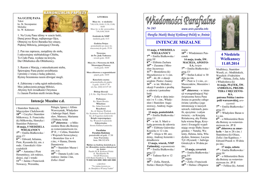 LITURGIA NA UCZTĘ PANA Tekst: ks. St. Szczepaniec Melodia: ks. W. Kałamarz Msze św. w niedziele: 7.00; 8.30; 10.00; 11.30; 13.00; 18.00 Msze św. w dni powszednie: 7.00; 8.00; 18.00 1. Na Ucztę Pana idźmy w szacie łaski, Danej przez Boga, najlepszego Ojca, Obmytej we Krwi Baranka bez zmazy, Pięknej Miłością, jaśniejącej Chwałą. 2. Pan nas zaprasza, zasiądźmy do stołu, I zakosztujmy niebiańskiego Chleba, To Ciało Pana, wydane na krzyżu, Dar Oblubieńca dla Oblubienicy. 3. Razem z Maryją, z mieszkańcami nieba, Śpiewajmy Panu pieśni uwielbienia I prośmy z wiarą o łaskę jedności, Byśmy brzemiona razem dźwigać mogli. 4. Zabierzmy z sobą ogień miłosierdzia, Moc jednoczenia potęgą Miłości, Abyśmy byli świadkami Chrystusa I z Janem Pawłem nieśli światu Boga. Intencje Mszalne c.d. i Stanisław Stańczyk, Mieczysław Chełchowski 1800 + Cecylia i Stanisław Miłkowscy, S. Franciszka (k) Miłkowska, Henryka i Stanisław Puławscy 18 maja, 5 NIEDZIELA WIELKANOCY 700 + Emilia Białkowska / greg.17/ 830 + Edward, Julianna, Piotr, Ryszarda (k), zm. z rodz.: Urawskich i Górczyńskich 1000 + Antonina i Piotr Herumińscy, ich rodzice, dzieci, zięć i wnuki 1130 + Janina i Franciszek Nowaccy, Weronika, Pelagia, Ignacy i Alfons Wawrzyniak, Władysław i Jadwiga Orpel, Stanisław, Mateusz, Marianna i Elżbieta Arlak 1300 zbiorowa: – o Miłosierdzie Boże dla Bożeny za wstawiennictwem św. JP II ; + Celina, Stanisław i Wojciech Seroczyńscy; + Bronisław Ges w 4 r.śm.; + Hanna, Dorota Dereniowie 1630 + Stanisław Mazur i zm. z cr. 1800 + Danuta Łysik i zm. rodzice: Janina i Jan, Zofia i Józef Godzinki do NMP niedziela godz. 8.15 Godzina Święta - poniedziałek po mszy św. wieczornej do godz. 19.30 Nowenna do Św. Judy Tadeusza - wtorek godz. 18.00 Msza św. i Nowenna do M.B. Nieustającej Pomocy - środa godz. 18.00 Msza zbiorowa z wypominkami - piątek godz. 18.00 Kancelaria czynna od poniedziałku do piątku w godz.: 16.00-17.30 tel./fax. (022) 613-07-20 Biskup diecezji: J. E. Ks. Abp Henryk Hoser Proboszcz: Ks. Marek Doszko Wikariusz: Ks. Adam Kurowski Rezydenci: Ks. dr Mariusz Wedziuk Ks. Kazimierz Zoch-Chrabołowski Ks. dr Eugeniusz Jankowski Ksiądz wspomagający: Ks. Wojciech Czarnowski Zakrystianka: Siostra ElŜbieta Łaniewska Parafialna Poradnia Rodzinna poniedziałki od godz. 17.30 Anna Warwińska kom. 506 312 676 Wpłaty na budowę kościoła p.w. św. Benedykta moŜna dokonywać na konto: Parafia M. B. Królowej Polski ul. Rzeźbiarska 46 04-620 Warszawa CITI Bank Handlowy w Warszawie 75 1030 1654 0000 0000 3405 5000 z dopiskiem "Na budowę kościoła p.w. św. Benedykta w Wawrze-Sadulu” Nr 243 www.anin.parafia.info Parafia Matki BoŜej Królowej Polski w Aninie INTENCJE MSZALNE 11 maja, 4 NIEDZIELA WIELKANOCY 700 + Emilia Białkowska / greg.10/ 830 + Elżbieta Zachara 1000 + Zuzanna i Mirosław Jaczewscy 1130 + Bronisława (k) Mazurkiewicz w 1 r.śm. 1300 – dz.-bł. z okazji urodzin: Piotra i Joanny 1630 – w int. Michała z okazji 9 urodzin z prośbą o zdrowie i potrzebne łaski 1800 + Zofia w dniu imienin i w 5. r.śm., Władysław i Stanisław Augustowscy, Andrzej Augustowski 12 maja, poniedziałek 700 + Emilia Białkowska / greg.11/ 800 – w int. S. Marii o łaskę powrotu do zdrowia 1800 + Elżbieta GalewskaKrasicka w 12 r.śm. 1800 + Alicja w 80. urodziny, Andrzej Jezierski i dziadkowie 13 maja, wtorek, NMP Fatimskiej, wspomnienie 700 + Emilia Białkowska / greg.12/ 800 + Tadeusz Kot w 12 r.śm. 1800 + Zofia, Henryk, Stefan i Henryk Flejsze- rowie 1800 + Włodzimierz Penconek 14 maja, środa, ŚW. MACIEJA, APOSTOŁA, święto 700 + Emilia Białkowska / greg.13/ 800 + Stefan Łokieć w 30 dniu po śm. 800 + Piotr w 2 r.śm., cr.: Maszczaków, Moreniów i Baranów 1800 zbiorowa: - w intencji wynagradzającej Najświętszemu Sercu Pana Jezusa za grzechy całego świata i prośbą o jego intronizację w naszych sercach, rodzinach, parafii, ojczyźnie i całym świecie; - za Krucjatą Różańcową, aby Polska była wierna Bogu, Krzyżowi i Ewangelii wypełniając swoje Śluby Jasnogórskie; + Natalia, Walenty, Helena, Julia, Władysław, Ireneusz, Lucyna Tyl i Ryszard; + Jadwiga Góralczyk w 30 dniu po śm.; 15 maja, czwartek 700 + Emilia Białkowska / greg.14/ 700 zajęta 800 + Zofia i Franciszek 1800 + Halina i Zbigniew 4 Niedziela Wielkanocy 11.05.2014 Modlińscy, Stanisław Weseli, cr.: Modlińskich, Weselich i Fridrichów 1800 + Helena, Zofia, Julia i Władysława (k) 16 maja, PIĄTEK, ŚW. ANDRZEJA, PREZBITERA I MĘCZENNIKA, patrona Polska i metropolii warszawskiej, uroczystość 700 + Emilia Białkowska / greg.15/ 800 + Władysław Baran w 6 r.śm. 800 – o Miłosierdzie Boże dla Bożeny za wstawiennictwem św. JP II 1800 zbiorowa za zmarłych: + Jan w 28 r.śm. i Stanisława (k) Oliasz, Zofia i Jan Kępińscy; + Edward Prasek w 30 dniu po śm.; 17 maja, sobota 700 + Emilia Białkowska / greg.16/ 800 – o Miłosierdzie Boże dla Bożeny za wstawiennictwem św. JP II 1800 + Feliksa (k), Antoni Liturgia Słowa Bożego Dz 2,14a.36-41 Pan mym pasterzem: nie brak mi niczego 1 P 2,20b-25 J 10,1-10 Zaprawdę, zaprawdę, powiadam wam: Kto nie wchodzi do owczarni przez bramę, ale wdziera się inną drogą, ten jest złodziejem i rozbójnikiem. Kto jednak wchodzi przez bramę, jest pasterzem owiec. Temu otwiera odźwierny, a owce słuchają jego głosu; woła on swoje owce po imieniu i wyprowadza je. A kiedy wszystkie wyprowadzi, staje na ich czele, a owce postępują za nim, ponieważ głos jego znają. Natomiast za obcym nie pójdą, lecz będą uciekać od niego, bo nie znają głosu obcych. Tę przypowieść opowiedział im Jezus, lecz oni nie pojęli znaczenia tego, co im mówił. Powtórnie więc powiedział do nich Jezus: Zaprawdę, zapra wdę, powiad a m wam: Ja jestem bramą owiec. Wszyscy, którzy przyszli przede Mną, są złodziejami i rozbójnikami, a nie posłuchały ich owce. Ja jestem bramą. Jeżeli ktoś wejdzie p