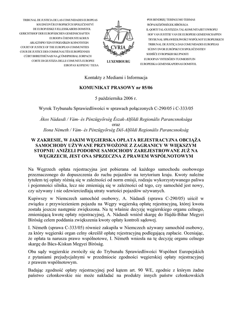 TRIBUNAL DE JUSTICIA DE LAS COMUNIDADES EUROPEAS SOUDNÍ DVŮR EVROPSKÝCH SPOLEČENSTVÍ EUROPOS BENDRIJŲ TEISINGUMO TEISMAS EURÓPAI KÖZÖSSÉGEK BÍRÓSÁGA DE EUROPÆISKE FÆLLESSKABERS DOMSTOL IL-QORTI TAL-ĠUSTIZZJA TAL-KOMUNITAJIET EWROPEJ GERICHTSHOF DER EUROPÄISCHEN GEMEINSCHAFTEN HOF VAN JUSTITIE VAN DE EUROPESE GEMEENSCHAPPEN EUROOPA ÜHENDUSTE KOHUS TRYBUNAŁ SPRAWIEDLIWOŚCI WSPÓLNOT EUROPEJSKICH ∆ΙΚΑΣΤΗΡΙΟ ΤΩΝ ΕΥΡΩΠΑΪΚΩΝ ΚΟΙΝΟΤΗΤΩΝ TRIBUNAL DE JUSTIÇA DAS COMUNIDADES EUROPEIAS COURT OF JUSTICE OF THE EUROPEAN COMMUNITIES SÚDNY DVOR EURÓPSKYCH SPOLOČENSTIEV COUR DE JUSTICE DES COMMUNAUTÉS EUROPÉENNES SODIŠČE EVROPSKIH SKUPNOSTI CÚIRT BHREITHIÚNAIS NA gCÓMHPHOBAL EORPACH EUROOPAN YHTEISÖJEN TUOMIOISTUIN CORTE DI GIUSTIZIA DELLE COMUNITÀ EUROPEE EIROPAS KOPIENU TIESA EUROPEISKA GEMENSKAPERNAS DOMSTOL Kontakty z Mediami i Informacja KOMUNIKAT PRASOWY nr 85/06 5 października 2006 r. Wyrok Trybunału Sprawiedliwości w sprawach połączonych C-290/05 i C-333/05 Ákos Nádasdi / Vám- és Pénzügyőrség Észak-Alföldi Regionális Parancsnoksága oraz Ilona Németh / Vám- és Pénzügyőrség Dél-Alföldi Regionális Parancsnokság W ZAKRESIE, W JAKIM WĘGIERSKA OPŁATA REJESTRACYJNA OBCIĄŻA SAMOCHODY UŻYWANE PRZYWOŻONE Z ZAGRANICY W WIĘKSZYM STOPNIU ANIŻELI PODOBNE SAMOCHODY ZAREJESTROWANE JUŻ NA WĘGRZECH, JEST ONA SPRZECZNA Z PRAWEM WSPÓLNOTOWYM Na Węgrzech opłata rejestracyjna jest pobierana od każdego samochodu osobowego przeznaczonego do dopuszczenia do ruchu pojazdów na terytorium kraju. Kwoty należne tytułem tej opłaty różnią się w zależności od norm emisji, rodzaju wykorzystywanego paliwa i pojemności silnika, lecz nie zmieniają się w zależności od tego, czy samochód jest nowy, czy używany i nie odzwierciedlają utraty wartości pojazdów używanych. Kupiwszy w Niemczech samochód osobowy, A. Nádasdi (sprawa C-290/05) uiścił w związku z przywiezieniem pojazdu na Węgry węgierską opłatę rejestracyjną, której kwota została jeszcze następnie zwiększona. Na tę właśnie decyzję węgierskiego organu celnego, zmieniającą kwotę opłaty rejestracyjnej, A. Nádasdi wniósł skargę do Hajdú-Bihar Megyei Bíróság celem poddania zwiększenia kwoty opłaty kontroli sądowej. I. Németh (sprawa C-333/05) również zakupiła w Niemczech używany samochód osobowy, za który węgierski organ celny określił opłatę rejestracyjną podlegającą zapłacie. Oceniając, że opłata ta narusza prawo wspólnotowe, I. Németh wniosła na tę decyzję organu celnego skargę do Bács-Kiskun Megyei Bíróság. Oba sądy węgierskie zwróciły się do Trybunału Sprawiedliwości Wspólnot Europejskich z pytaniami prejudycjalnymi w przedmiocie zgodności węgierskiej opłaty rejestracyjnej z prawem wspólnotowym. Badając zgodność opłaty rejestracyjnej pod kątem art. 90 WE, zgodnie z którym żadne państwo członkowskie nie może nakładać na produkty innych państw członkowskich podatków wyższych od tych, które nakłada na podobne produkty krajowe, Trybunał wyjaśnił, że należy w niniejszym przypadku porównać skutki opłaty rejestracyjnej nakładanej na pojazdy używane przywiezione niedawno z innego państwa członkowskiego niż Republika Węgierska ze skutkami rezydualnej opłaty rejestracyjnej nakładanej na podobne używane pojazdy zarejestrowane na Węgrzech, które w związku z faktem rejestracji zostały już obciążane tą samą opłatą. Trybunał stwierdził, że pojazd nowy, na który na Węgrzech została nałożona opłata rejestracyjna, traci wraz z upływem czasu część swojej wartości rynkowej oraz że proporcjonalnie do utraty wartości obniżeniu ulega kwota opłaty rejestracyjnej zawarta w aktualnej wartości pojazdu. Jako pojazd używany, może on zostać sprzedany wyłącznie za ułamek wartości początkowej, zawierający rezydualną kwotę opłaty rejestracyjnej. Pojazd tej samej marki, w tym samym wieku, z tym samym przebiegiem i identyczny również w zakresie innych cech, zakupiony jako używany w innym państwie członkowskim i zarejestrowany na Węgrzech zostanie jednak obciążony opłatą rejestracyjną stosowaną dla pojazdów tej kategorii według stawki 100%. W konsekwencji, opłata ta obciąża samochody używane przywożone z zagranicy w większym stopniu aniżeli podobne samochody używane już zarejestrowane na Węgrzech. W tej sytuacji Trybunał orzekł, że prawo wspólnotowe sprzeciwia się opłacie, takiej jak węgierska opłata rejestracyjna, o ile jej kwota jest obliczana bez uwzględnienia utraty wartości przez samochody, co w przypadku jej zastosowania do samochodów używanych przywiezionych z innych państw członkowskich prowadzi do tego, że przewyższa ona opłatę rejestracyjną zawartą w wartości rezydualnej podobnych samochodów używanych, które zostały już zarejestrowane na Węgrzech. Trybunał uznał, że nie należy ograniczać skutków niniejszego wyroku w czasie. Dokument nieoficjalny, sporządzony na użytek mediów, który nie wiąże w żaden sposób Trybunału Sprawiedliwości. Dostępne wersje językowe : FR, CS, DE, EN, HU, IT, PL, SL, SK Pełny tekst wyroku znajduje się na stronie internetowej Trybunału http://curia.europa.eu/jurisp/cgi-bin/form.pl?lang=PL&Submit=rechercher&numaff=C290/05 oraz http://curia.europa.eu/jurisp/cgi-bin/form.pl?lang=PL&Submit=rechercher&numaff=C333/05 Tekst jest z reguły dostępny od godz. 12.00 CET w dniu ogłoszenia. W celu uzyskania dodatkowych informacji proszę skontaktować się z Ireneuszem Kolowcą Tel. (00352) 4303 2878 Faks (00352) 4303 2053 Nagranie wideo z ogłoszenia wyroku jest dostępne przez EbS „Europe by Satellite”, serwis prowadzony przez Komisję Europejską, Dyrekcję Generalną ds. Prasy i Komunikacji, L-2920 Luksemburg, tel. (00352) 4301 35177 faks (00352) 4301 35249 lub B-1049 Bruksela, tel. (0032) 2 2964106 faks (0032) 2 2965956