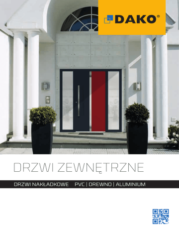 DRZWI ZEWNĘTRZNE DRZWI NAKŁADKOWE PVC | DREWNO | ALUMINIUM “ Charakter domu wyraża osobowość gospodarzy, a drzwi są ich znakiem rozpoznawczym. Zbliżają Twoich gości do odpowiedzi na pytanie… ...kim jesteś? Osamu Ono - od 25 lat zajmuje się kształ- Przestrzeń w której przebywamy wpływa na jakość towaniem przestrzeni projektując zarówno naszego życia, a możliwość jej kształtowania daje szansę nowoczesne rezydencje jak też zaawan- decydowania o tej jakości. Począwszy od wyboru projektu sowane obiekty komercyjne. Specjalizuje domu, poprzez ustalenie dominujących w nim kolorów, się w budownictwie energooszczędnym aż po dobór elementów dekoracyjnych – z każdą kolejną i przyjaznym dla środowiska, korzystając decyzją tworzymy swoją przyszłość. z tradycji oraz współczesnych osiągnięć japońskiej architektury i wzornictwa. Od 5 lat poleca swoim klientom stolarkę DAKO. Żyje i pracuje w Japonii. Wybór drzwi zajmuje pośród tych decyzji miejsce szczególne. Drzwi to nowe otwarcie, początek i powitanie, ale także: schronienie i bariera. Są więc wieloznaczne, ale jednocześnie wyraźnie wyróżnione, koncentrując na sobie uwagę przechodniów i gości. Dzięki temu, jak żaden inny element potrafią określić charakter domu. Gorąco zachęcam Państwa do dokonania tego określenia w świadomy i przemyślany sposób. SPIS TREŚCI Modele s. 6 Budowa, wyposażenie i kolorystyka drzwi PVC s. 94 Budowa, wyposażenie i kolorystyka drzwi drewnianych s. 100 Budowa, wyposażenie i kolorystyka drzwi aluminiowych s. 104 HarmonyLine s. 110 Wybierz swój model: Taida s. 10 Sotera s. 14 Nila s. 18 Niceta s. 22 Feba s. 34 Fotyna s. 38 Idalia s. 42 Argea s. 48 Dalia s. 64 Lilla s. 68 Stella s. 72 Tulia s. 76 Tala s. 6 Kora s. 26 Eunika s. 30 Alla s. 52 Zoe s. 56 Alba s. 60 Noel s. 80 Zola s. 84 Keira s. 88 Na stronie www.dako.eu możesz zaprojektować własny model drzwi korzystając z wygodnego konfiguratora on-line aluminium | drewno | pvc 4 5 Model TALA Model w konfiguracji standardowej TALA PVC Materiał Model Grubość Kolor zew. Kolor wew. Opis Pochwyt Wymiary PVC TALA 82 mm Antracyt (RAL 7016) Biały (RAL 9016) Od zewnątrz: frezowania Q-10, dł. 1000 mm 1100 / 2105 mm Sprawdź wyposażenie standardowe i opcjonalne na str. 94 22 6 7 TALA ALUMINIUM DREWNO Materiał Model Grubość Kolor zew. Kolor wew. Opis Pochwyt Wymiary ALUMINIUM TALA 90 mm Srebrny (RAL 9006) Srebrny (RAL 9006) Od zewnątrz: frezowania Q-10, dł. 1500 mm 1120 / 2100 mm Sprawdź wyposażenie standardowe i opcjonalne na str. 104 Materiał Model Grubość Kolor zew. Kolor wew. Opis Pochwyt Wymiary DREWNO TALA 92 mm Stara sosna Stara sosna Od zewnątrz: frezowania P-10, dł. 1000 mm 1100 / 2115 mm Sprawdź wyposażenie standardowe i opcjonalne na str. 100 8 9 Model TAIDA TAIDA ALUMINIUM ALUMINIUM TAIDA 90 mm Orzech (2178.007) Orzech (2178.007) Obustronne aplikacje ze stali szlachetnej, matowej szczotkowanej; możliwość zastosowania okleiny Pochwyt P-10, dł. 1600 mm Wymiary 1120 / 2100 mm Materiał Model Grubość Kolor zew. Kolor wew. Opis Sprawdź wyposażenie standardowe i opcjonalne na str. 104 Dostępne w kompozycji 10 11 TAIDA PVC DREWNO PVC TAIDA 82 mm Ciemnobrązowy (RAL 8017) Biały (RAL 9016) Od zewnątrz: aplikacje ze stali szlachetnej, matowej szczotkowanej Pochwyt P-10 dł. 1600 mm Wymiary 1100 / 2105 mm Materiał Model Grubość Kolor zew. Kolor wew. Opis Sprawdź wyposażenie standardowe i opcjonalne na str. 94 DREWNO TAIDA 92 mm Teak Teak Od zewnątrz: aplikacje ze stali szlachetnej, matowej szczotkowanej Pochwyt P-10, dł. 800 mm Wymiary 1100 / 2115 mm Materiał Model Grubość Kolor zew. Kolor wew. Opis Sprawdź wyposażenie standardowe i opcjonalne na str. 100 12 13 Model SOTERA SOTERA PVC Materiał Model Grubość Kolor zew. Kolor wew. Opis Pochwyt Wymiary PVC SOTERA 82 mm Antracyt (RAL 7016) Biały (RAL 9016) Od zewnątrz: frezowania P-10, dł. 1500 mm 1100 / 2105 mm Sprawdź wyposażenie standardowe i opcjonalne na str. 94 Dostępne w kompozycji 14 15 SOTERA ALUMINIUM DREWNO ALUMINIUM SOTERA 90 mm Bazaltowoszary (RAL 7012) Bazaltowoszary (RAL 7012) Od zewnątrz: frezowania; możliwość zastosowania intarsji jednostronnej Pochwyt P-10, dł. 1500 mm Wymiary 1120 / 2100 mm Materiał Model Grubość Kolor zew. Kolor wew. Opis Sprawdź wyposażenie standardowe i opcjonalne na str. 104 Materiał Model Grubość Kolor zew. Kolor wew. Opis Pochwyt Wymiary DREWNO SOTERA 92 mm Palisander Palisander Od zewnątrz: frezowania P-10, dł. 800 mm 1100 / 2115 mm Sprawdź wyposażenie standardowe i opcjonalne na str. 100 16 17 16 17 Model NILA NILA DREWNO DREWNO NILA 92 mm Brąz czekoladowy Brąz czekoladowy Od zewnątrz: aplikacje ze stali szlachetnej, matowej szczotkowanej; frezowania Klamka Srebrna na długim szyldzie Wymiary 1100 / 2115 mm Materiał Model Grubość Kolor zew. Kolor wew. Opis Sprawdź wyposażenie standardowe i opcjonalne na str. 100 Dostępne w kompozycji 18 19 NILA ALUMINIUM PVC ALUMINIUM NILA 90 mm Biały (RAL 9016) Biały (RAL 9016) Od zewnątrz: aplikacje w kolorze Winchester (49240); frezowania Pochwyt Q-10, dł. 580 mm Wymiary 1120 / 2100 mm Materiał Model Grubość Kolor zew. Kolor wew. Opis Sprawdź wyposażenie standardowe i opcjonalne na str. 104 PVC NILA 82 mm Antracyt (RAL 7016) Biały (RAL 9016) Od zewnątrz: aplikacje w kolorze Winchester (49240); frezowania Pochwyt Q-10, dł. 1400 mm Wymiary 1100 / 2105 mm Materiał Model Grubość Kolor zew. Kolor wew. Opis Sprawdź wyposażenie standardowe i opcjonalne na str. 94 20 21 Model NICETA Model w konfiguracji standardowej NICETA DREWNO ! DREWNO NICETA 92 mm Stara sosna Stara sosna Od zewnątrz: aplikacje ze stali szlachetnej, matowej szczotkowanej; frezowania; brak możliwości zastosowania szkła przeziernego Klamka Srebrna na długim szyldzie Wymiary 1100 / 2115 mm Materiał Model Grubość Kolor zew. Kolor wew. Opis Sprawdź wyposażenie standardowe i opcjonalne na str. 100 Dostępne w komp