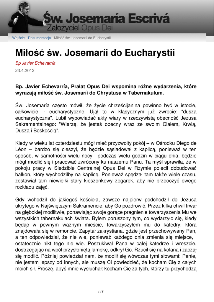 Wejście - Dokumentacja - Miłość św. Josemaríi do Eucharystii Miłość św. Josemaríi do Eucharystii Bp Javier Echevarría 23.4.2012 Bp. Javier Echevarría, Prałat Opus Dei wspomina różne wydarzenia, które wyrażają miłość św. Josemaríi do Chrystusa w Tabernakulum. Św. Josemaría często mówił, że życie chrześcijanina powinno być w istocie, całkowicie! - eucharystyczne. Ujął to w klasycznym już zwrocie: "dusza eucharystyczna". Lubił wypowiadać akty wiary w rzeczywistą obecność Jezusa Sakramentalnego: "Wierzę, że jesteś obecny wraz ze swoim Ciałem, Krwią, Duszą i Boskością". Kiedy w wieku lat czterdziestu mógł mieć przyzwoity pokój – w Ośrodku Diego de Léon – bardzo się cieszył, że będzie sąsiadował z kaplicą, ponieważ w ten sposób, w samotności wielu nocy i podczas wielu godzin w ciągu dnia, będzie mógł modlić się i pracować zwrócony ku naszemu Panu. Ta myśl sprawiła, że w pokoju pracy w Siedzibie Centralnej Opus Dei w Rzymie polecił dobudować balkon, który wychodziłby na kaplicę. Ponieważ spędzał tam także wiele czasu, zostawiał tam niewielki stary kieszonkowy zegarek, aby nie przeoczyć owego rozkładu zajęć. Gdy wchodził do jakiegoś kościoła, zawsze najpierw podchodził do Jezusa ukrytego w Najświętszym Sakramencie, aby Go pozdrowić. Przez kilka chwil trwał na głębokiej modlitwie, ponawiając swoje gorące pragnienie towarzyszenia Mu we wszystkich tabernakulach świata. Byłem poruszony tym, co wydarzyło się, kiedy będąc w pewnym ważnym mieście, towarzyszyłem mu do katedry, która znajdowała się w remoncie. Zapytał zakrystiana, gdzie jest przechowywany Pan, a ten odpowiedział, że nie wie, ponieważ każdego dnia zmienia się miejsce, i ostatecznie nikt tego nie wie. Poszukiwał Pana w całej katedrze i wreszcie, dostrzegając na wpół przysłoniętą lampkę, odkrył Go. Rzucił się na kolana i zaczął się modlić. Później powiedział nam, że modlił się wówczas tymi słowami: Panie, nie jestem lepszy od innych, ale muszę Ci powiedzieć, że kocham Cię z całych moich sił. Proszę, abyś mnie wysłuchał: kocham Cię za tych, którzy tu przychodzą 1/5 i nie mówią Ci tego; za tych wszystkich, którzy kiedykolwiek przyjdą i nie powiedzą Ci tego. I dodał: Czy nie uczynilibyście czegoś podobnego, gdyby wasi rodzice – którzy czynią tak wiele dobrego - poświęciliby się dla innych, a ci nawet by im nie podziękowali? Bogu musimy dziękować dużo bardziej. On, który jest samym szczęściem, samym pięknem i prawdziwym Życiem, oddaje się do dyspozycji każdego z nas, abyśmy mieli udział w tym Życiu. Trzeba, abyśmy byli wdzięczni. W wolnych chwilach, które mu się trafiały, chociaż musiał pokonywać schody, wstępował do kaplicy, aby uklęknąć i wypowiedzieć choćby jeden akt strzelisty, komunię duchową czy akt uwielbienia. Nigdy nie zawahał się dając tę radę: Wymknij się, jeśli możesz, aby towarzyszyć Jezusowi w Przenajświętszym Sakramencie, choćby to było jedynie parę sekund. Mów Mu - z całej duszy – że Go kochasz, że pragniesz kochać Go coraz bardziej, i że Go kochasz za wszystkich ludzi na ziemi, także za tych, którzy mówią, że Go nie kochają. Kiedyś Założyciel Opus Dei przyjmował pewnych gości. Po obiedzie, z całą naturalnością, która go charakteryzowała, zaproponował: Chodźmy pozdrowić Pana. Byli to pobożni chrześcijanie, ale zdziwili się słysząc go, jak mówił w ten sposób, ponieważ ton jego głosu był wskazywał na to, że ma na myśli kogoś bardzo wysoko postawionego: Kogóż możemy pozdrowić, jeśli nie Pana tego domu, który jest tu gospodarzem? Zrozumieli to dopiero po wejściu do kaplicy. Zwracał nam, księdzu Álvaro del Portillo i mnie, uwagę, abyśmy nie przechodzili obok tabernakulum, bez powiedzenia Jezusowi, że Go kochacie z całej duszy, że pragniecie strzec Go w waszych sercach, że dziękujecie Mu za Jego obecność w tabernakulum dla naszego pocieszenia, aby nam pomagał swoją siłą i wszechmocą. A po chwili dodał: Ja tak właśnie robię. 26 lutego 1970 roku zwrócił się do nas z prośbą, pełną pasji wobec Pana Jezusa Eucharystycznego, która go tak spalała: Nieustannie łączcie się z moją modlitwą. Modlę się przez cały dzień i w nocy. Jednoczcie się z moją Mszą świętą. Czyńcie wiele aktów wiary i miłości w obecności Jezusa Eucharystycznego, i wiele aktów zadośćuczynienia. Mówcie Panu, że Go kochacie z całej duszy, że nie chcecie przysparzać Mu cierpień, że pragniecie nieustannie wynagradzać Mu. Zalecał kapłanom, aby poświęcali swój czas modlitwie przed Najświętszym Sakramentem. Pragnął, by we wszystkich wzrastała pobożność eucharystyczna. Jeśli tego nie robicie – mówił do księży – tylko dlatego, że zobaczą was jakieś osoby z waszego kościoła, wierni z waszej parafii, to nie szkodzi, że was zobaczą. Jeśli jesteście oddani Panu, a ludzie znają waszą miłość, zapytają was, co was do 2/5 tego skłania, a wówczas będziecie mogli powiedzieć o tym rozmiłowaniu, które powinno wypełnić całe wasze życie. Nieustannie przy nas powtarzał: Dziękuje Ci, mój Boże, ponieważ już w młodości pozwoliłeś mi przeczuć cud tej Miłości w tajemnicy Eucharystii. W 1973 roku zachęcał swoje córki i swoich synów, aby wzrastała w nich miłość do Jezusa Sakramentalnego: Bóg sprawia, że jesteśmy w stanie pragnąć Go, dostrzegać i kochać. W jaki sposób? Wypełniając jak najlepiej, wkładając w to cały wysiłek, zadania każdego dnia. Ojcze, pytacie mnie, ale jak możemy jeszcze bardziej być z Nim? Wejdźcie z Nim w zażyłość, ponieważ jesteśmy Jego rodziną. Szukajcie Go tam, gdzie przebywa, w tabernakulum i w waszych sercach, i mówcie Mu, że chcecie się na Nim opierać, na jego mocy. Te słowa, wypowiedziane w ostatnich latach jego życia, są kontynuacją tego, czym żył i 
