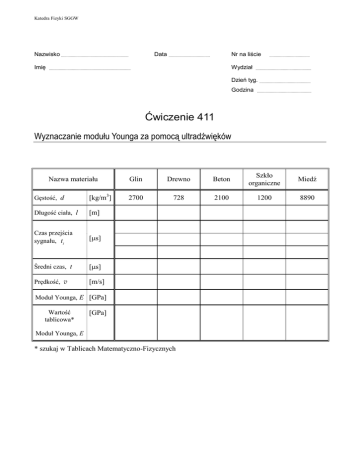 Katedra Fizyki SGGW Nazwisko .............................................................. Imię Nr na liście Data ...................................... Wydział ........................................................................... ..................................... ................................................... Dzień tyg. ............................................... Godzina .................................................. Ćwiczenie 411 Wyznaczanie modułu Younga za pomocą ultradźwięków Nazwa materiału Gęstość, d [kg/m3] Długość ciała, l [m] Czas przejścia sygnału, ti [s] Średni czas, t [s] Prędkość, v [m/s] Glin Drewno Beton Szkło organiczne Miedź 2700 728 2100 1200 8890 Moduł Younga, E [GPa] Wartość tablicowa* [GPa] Moduł Younga, E * szukaj w Tablicach Matematyczno-Fizycznych Katedra Fizyki SGGW -1- Ex11 Ćwiczenie 411. Wyznaczanie modułu Younga za pomocą ultradźwięków Definicja modułu Younga Jeżeli na unieruchomione ciało sprężyste podziałamy siłą, to powstaną w tym ciele naprężenia, wywołujące jego odkształcenie. Naprężenie  w pręcie o przekroju poprzecznym A, na który działa siła F (prostopadła bądź styczna do A) równe jest stosunkowi siły do pola przekroju pręta: (1) F A Naprężeniu stawiają opór siły międzycząsteczkowe wewnątrz materiału. Rozróżnia się zwykle trzy rodzaje naprężeń: rozciągające (wydłużają ciało), ściskające (skracają ciało) i ścinające (deformują postać ciała). W ostatnim przypadku siła działa stycznie do powierzchni przekroju. Zmiana długości pręta spowodowana rozciąganiem lub ściskaniem jest proporcjonalna do jego  długości. Jeśli, na przykład, pręt o długości l, rozciągany siłą F , zwiększa swoją długość o l, rys. 1, to miarą odkształcenia  jest względna zmiana długości: (2)   l l .  Gdy po usunięciu siły F ciało wraca do swych wymiarów, to odkształcenie nazywamy sprężystym. Przy małych odkształceniach,  jest proporcjonalne do : l A 1 (3)    , E gdzie E jest modułem sprężystości (nazywanym modułem Younga) materiału. Liniowa zależność pomiędzy naprężeniem a odkształceniem znana jest jako prawo l Hooke’a. Po podstawieniu do (3) wzorów definiujących  i , otrzymamy: F 1 l (4) Rys.1 l   F . E A A zatem, prawo Hooke’a stwierdza, że podczas rozciągania lub ściskania zmiana długości jest proporcjonalna do działającej siły. Moduł Younga wyraża się, tak jak naprężenie czy ciśnienie, w paskalach: 1 Pa = 1 N/m2. Wyznaczanie modułu Younga za pomocą ultradźwięków Fale dźwiękowe są to rozchodzące się w ośrodku mechaniczne drgania cząsteczek tego ośrodka. Źródłem dźwięku są obszary ośrodka, w których z jakichś przyczyn występują drgania mechaniczne, a więc wahania naprężenia lub ciśnienia. W ciałach stałych mogą występować różne typy fal dźwiękowych. W gazach i cieczach drgania cząsteczek, związane z falą dźwiękową, odbywają się jedynie zgodnie z kierunkiem ruchu fali (jest to, zatem, fala podłużna). Drgania cząsteczek ośrodka, ze względu na zakres odbieranych przez ucho ludzkie częstotliwości, dzielimy na: infradźwięki (016 Hz), dźwięki (16 Hz 20 kHz) i ultradźwięki (od 20 kHz). Prawa fizyczne dotyczące wymienionych rodzajów drgań są takie same, natomiast ich własności (np. oddziaływanie na materię ożywioną) są różne. Znane są dwie metody wytwarzania ultradźwięków. Jedna z nich wykorzystuje zjawisko magnetostrykcji, które polega na tym, że pręty wykonane z ciał ferromagnetycznych (np. żelazo, nikiel), umieszczone w zmiennym polu magnetycznym, doznają zmian swojej długości w takt zmian pola magnetycznego. Drgania te są szczególnie silne, gdy częstotliwość drgań własnych pręta pokrywa się z częstotliwością zmian pola. Pręt wykonuje wtedy drgania rezonansowe i staje się źródłem ultradźwięków. W ten sposób można wytwarzać ultradźwięki o częstotliwości do 60 kHz. Druga metoda wytwarzania ultradźwięków, stosowana w próbnikach materiałów, polega na wykorzystaniu tzw. odwrotnego zjawiska piezoelektrycznego. Tą metodą można wytwarzać ultradźwięki o częstotliwościach do około 300 Mhz. Katedra Fizyki SGGW -2- Ex11 Pewne kryształy, np. kwarc, umieszczone w polu elektrycznym, którego kierunek pokrywa się z odpowiednią osią kryształu, zmieniają swoje wymiary geometryczne w takt zmian pola elektrycznego. Rozmiary kryształu są tak dobrane, aby wykonywał on drgania rezonansowe, czyli aby częstotliwość jego drgań własnych była zgodna z częstotliwością zmian pola elektrycznego. Próbnik materiałów jest przyrządem przeznaczonym do dokładnego pomiaru czasu t przejścia fal ultradźwiękowych w badanym materiale. Jeżeli droga przejścia fali w danym materiale jest l, to prędkość rozchodzenia się fali sprężystej spełnia zależność (5) vl t. Z teorii drgań sprężystych wiemy, że prędkość v fali w ośrodku zależy od modułu Younga E i od gęstości d badanego materiału, zgodnie z wzorem: v  E d , skąd (6) E  v2  d . Mierząc prędkość rozchodzenia się ultradźwięków w ośrodku sprężystym, możemy ze wzoru (6) wyznaczyć moduł Younga. Wykonanie pomiarów 1. Mierzymy długość l badanego ciała (są to walce bądź klocki prostopadłościenne wykonane z określonych materiałów, takich jak metal, drewno, beton, szkło organiczne). 2. Sprawdź połączenia głowic — nadawczej (transmitującą ultradźwięki, oznaczoną literą T) i odbiorczej (rejestrującą ultradźwięki, oznaczoną literą R), z próbnikiem materiałów za pomocą kabli koncentrycznych. Głowica nadawcza powinna być podłączona do gniazda płyty czołowej próbnika, oznaczonego symbolem . Głowica odbiorcza powinna być podłączona do gniazda . 3. Próbnik jest podłączony na stałe do zasilacza, który włączamy do sieci prądu zmiennego. Zasilacz ma odpowiednio ustawione napię