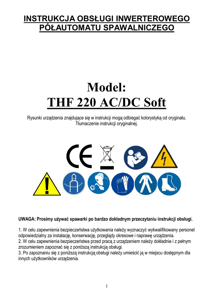 INSTRUKCJA OBSŁUGI INWERTEROWEGO PÓŁAUTOMATU SPAWALNICZEGO Model: THF 220 AC/DC Soft Rysunki urządzenia znajdujące się w instrukcji mogą odbiegać kolorystyką od oryginału. Tłumaczenie instrukcji oryginalnej. z UWAGA: Prosimy używać spawarki po bardzo dokładnym przeczytaniu instrukcji obsługi . 1. W celu zapewnienia bezpieczeństwa użytkowania należy wyznaczyć wykwalifikowany personel odpowiedzialny za instalację, konserwację, przeglądy okresowe i naprawę urządzenia. 2. W celu zapewnienia bezpieczeństwa przed pracą z urządzeniem należy dokładnie i z pełnym zrozumieniem zapoznać się z poniższą instrukcją obsługi. 3. Po zapoznaniu się z poniższą instrukcją obsługi należy umieścić ją w miejscu dostępnym dla innych użytkowników urządzenia. 1 Spis treści 1. UŻYCIE ZGODNE Z PRZEZNACZENIEM ............................................. 3 2. DANE TECHNICZNE.......................................................................... 3 3. ZASADY BEZPIECZNEGO UŻYTKOWANIA ......................................... 4 4. POZIOM HAŁASU .............................................................................. 7 5. OBJAŚNIENIE SYMBOLI .................................................................... 7 6. BUDOWA I PANEL STEROWANIA ...................................................... 8 7. ZAWARTOŚĆ ZESTAWU ................................................................. 11 8. UŻYTKOWANIE .............................................................................. 11 8.1 Podłączenie do sieci ........................................................................... 11 8.2 Zakładanie przewodów spawalniczych. ................................................. 12 8.3 Podłączenie gazu ochronnego. ............................................................ 12 8.4 Spawanie metodą MMA ...................................................................... 13 8.5 Spawanie metodą TIG ........................................................................ 13 8.6 Wykres przebiegu procesu spawania dla metody TIG z czterotaktem 4T. ... 14 8.7 Wykres przebiegu procesu spawania dla metody TIG w dwutakcie 2T ....... 16 9. CZYSZCZENIE I KONSERWACJA ..................................................... 17 10. PRZECHOWYWANIE I TRANSPORT ................................................. 18 11. UTYLIZACJA ................................................................................... 18 12. GWARANCJA. ................................................................................. 18 13. DEKLARACJA ZGODNOŚCI ............................................................. 20 2 1. UŻYCIE ZGODNE Z PRZEZNACZENIEM Urządzenie THF 220 AC/DC Soft jest profesjonalną spawarką inwerterową przeznaczoną do ręcznego, elektrycznego spawania metodą TIG, wszelkich gatunków stali, aluminium i jego stopów, tytanu i innych metali spawalnych. Urządzeniem można również spawać metodą MMA z wykorzystaniem topliwych elektrod otulonych. Przeznaczone jest do wszelkiego rodzaju prac spawalniczych w warsztatach ślusarskich, warsztatach naprawczych, przemysłowych, fabrykach itp. Urządzenie wyposażone jest w „miękki” przejrzysty panel umożliwiający ustawienie wszystkich niezbędnych funkcji spawalniczych (prąd startu/wypełnienia krateru/spawania/bazy, czasy narastania i opadania prądu, wypływ gazu przed i po spawaniu, częstotliwość pulsu, balans, hot start, arc force, itd.). Źródło prądu zostało zbudowane na tranzystorach IGBT zapewniających minimum zakłóceń elektromagnetycznych, małe straty mocy w układach podstawowych, umożliwiające zwiększenie wydajności i niezawodności źródła prądu. Bardzo wysoka wydajność, przekładająca się bezpośrednio na mniejsze zużycie energii, oraz wysoka częstotliwość przełączania, zapewniają błyskawiczne dostosowanie prądu do zmian parametrów w czasie spawania. 2. DANE TECHNICZNE Parametry Zasilanie Model THF 220 AC/DC Soft 230[V]/50[Hz] Napięcie biegu jałowego [V] 66 Zabezpieczenie [A] 25 Pobór mocy max. [kW] 6,4 TIG Zakres regulacji prądu spawania [A] Zakres regulacji czasu narastania i opadania prądu Regulacja wypływu gazu przed spawaniem Regulacja wypływu gazu po spawaniu Sprawność (40 °C/10 minut.) MMA AC DC AC DC 10÷200 10÷170 10÷170 10÷170 0÷10 [s] — 0÷2 [s] — 0÷10 [s] — 200 [A]/35 [%] 170 [A]/40 [%] Chłodzenie Waga netto [kg] 170 [A]/50 [%] 170 [A]/40 [%] Powietrzem - wentylator 10,5 3 3. ZASADY BEZPIECZNEGO UŻYTKOWANIA Należy przeczytać wszystkie przepisy bezpieczeństwa i wszystkie instrukcje. Niestosowanie się do przepisów BHP i instrukcji może spowodować porażenie prądem, pożar i/lub ciężkie obrażenia ciała. Należy zachować wszystkie przepisy bezpieczeństwa i instrukcje w celu użycia w przyszłości. Nie można dopuszczać dzieci w pobliże miejsca pracy urządzenia. Osoby z wszczepionym rozrusznikiem serca nim podejmą pracę z urządzeniem, powinny skonsultować się ze swoim lekarzem. Obsługa serwisowa i naprawy urządzenia mogą być prowadzone przez wykwalifikowany personel z zachowaniem warunków bezpieczeństwa pracy obowiązujących dla urządzeń elektrycznych. Przeróbki we własnym zakresie mogą spowodować zmianę cech użytkowych urządzenia lub pogorszenie parametrów spawalniczych. Wszelkie przeróbki urządzenia, we własnym zakresie, powodują nie tylko utratę gwarancji, ale mogą być przyczyną pogorszenia się warunków bezpieczeństwa użytkowania i narażenia użytkownika na niebezpieczeństwo porażenia prądem. Niewłaściwe warunki pracy oraz niewłaściwa obsługa mogą spowodować uszkodzenie urządzenia i utratę gwarancji. INSTRUKCJA BHP przy spawaniu elektrycznym 3.1. Uwagi ogólne. a) Do pracy należy przystąpić wypoczętym, trzeźwym, ubranym w odzież roboczą wykonaną z tkaniny trudnopalnej względnie ze skóry, włosy przykryć beretem lub czapką, na nogach mieć buty ze spodniami trudno zap