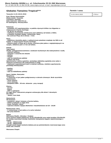 Biuro Podróży WIGRA s.c. ul. Człuchowska 25 01-360 Warszawa Tel. 22 665 06 06, 22 664 94 86, www.wigra.com.pl, e-mail: [email protected] Globales Tamaimo Tropical*** Teneryfa 11.01-18.01.2016 Termin i cena 11.01-18.01.2016 2739 zł Kraj: Wyspy Kanaryjskie Miejscowość: Teneryfa Transport: Samolot Data ważności: 2016-01-11 Nr katalogowy: Wczasy/2015 Położenie - kompleks 372 apartamentów, w pobliżu słynnych klifów Los Gigantes w miejscowości Puerto Santiago. - ok 40 km od lotniska - najbliższy przystanek autobusowy jest oddalony od hotelu o 500m. - w pobliżu niewleki sklepy, restauracje i bary. - Do centrum Playa de la Arena - 2 km. Plaża - Najbliższa niewielka plaża z wulkanicznym piaskiem znajduje się 500 m od hotelu, w miejscowości Puerto Santiago. - Główna plaża w Playa de la Arena, oceniana jako jedna z najpiękniejszych na wyspie, oddalona jest o 2 km od hotelu. Pokoje Typy pokoi; Studio- jednopomieszczeniowe z aneksem kuchennym dla maksymalnie 2 osób, - wiatrak sufitowy - łazienka z suszarka do wlosów - telefon - TV/SAT - sejf (za dodatkową opłatą) - balkon lub taras Apartamenty z jedną sypialnią -posiadają oddzielną sypialnię oraz salon z aneksem kuchennym dla maksymalnie 4 osób; - większość wyposażonych jest w wiatrak sufitowy, niektóre apartamenty posiadają klimatyzator. - telefon - TV/SAT - sejf (za dodatkową opłatą) Sport, Relaks, Rozrywka Bezpłatne; - 5 basenów w tym jeden podgrzewany w okresie zimowym. Brak ręczników basenowych. - Tenis ziemny, - tenis stołowy, - bezpłatne WIFI - 30 min. dziennie - przy recepcji Płatne; - Jacuzzi - bilard - WIFI w pokojach W ciągu dnia i wieczorem program animacyjny dla dzieci i dorosłych. Dla dzieci - basen, mini klub Wyżywienie All Inclusive - śniadanie, obiad i kolacja w formie bufetu, - lekkie przekąski w ciągu dnia - kawa, herbata i deser - wybrane lokalne napoje alkoholwe i bezalkoholowe od 10 - 24;00 Restauracje i bary - 2 restaurację w tym jedna a la carte (włoska) - bar przy basenie Bagaż Warszawa Modlin, Wrocław i Kraków Cena zawiera bagaż podręczny 10 kg (55x40x20) oraz małą torebkę (35x20x20) Do każdej rezerwacji istnieje możliwość dokupienia bagażu rejestrowanego o wadze - 15 kg – 200zł/osobę - 20 kg – 300zł/osobę Uwaga! Jeżeli bagaż zostanie dodany już po potwierdzeniu rezerwacji jego cena może ulec zmianie. Warszawa Chopin 1/2 Biuro Podróży WIGRA s.c. ul. Człuchowska 25 01-360 Warszawa Tel. 22 665 06 06, 22 664 94 86, www.wigra.com.pl, e-mail: [email protected] Cena zawiera bagaż podręczny 10 kg (55x40x20) oraz małą torebkę (35x20x20) Do każdej rezerwacji istnieje możliwość dokupienia bagażu rejestrowanego o wadze - 20 kg – 130zł/osobę Uwaga! Jeżeli bagaż zostanie dodany już po potwierdzeniu rezerwacji jego cena może ulec zmianie. 2/2 Powered by TCPDF (www.tcpdf.org)