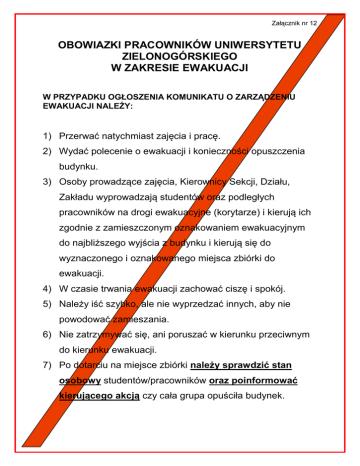 Załącznik nr 12 OBOWIAZKI PRACOWNIKÓW UNIWERSYTETU ZIELONOGÓRSKIEGO W ZAKRESIE EWAKUACJI W PRZYPADKU OGŁOSZENIA KOMUNIKATU O ZARZĄDZENIU EWAKUACJI NALEŻY: 1) Przerwać natychmiast zajęcia i pracę. 2) Wydać polecenie o ewakuacji i konieczności opuszczenia budynku. 3) Osoby prowadzące zajęcia, Kierownicy Sekcji, Działu, Zakładu wyprowadzają studentów oraz podległych pracowników na drogi ewakuacyjne (korytarze) i kierują ich zgodnie z zamieszczonym oznakowaniem ewakuacyjnym do najbliższego wyjścia z budynku i kierują się do wyznaczonego i oznakowanego miejsca zbiórki do ewakuacji. 4) W czasie trwania ewakuacji zachować ciszę i spokój. 5) Należy iść szybko, ale nie wyprzedzać innych, aby nie powodować zamieszania. 6) Nie zatrzymywać się, ani poruszać w kierunku przeciwnym do kierunku ewakuacji. 7) Po dotarciu na miejsce zbiórki należy sprawdzić stan osobowy studentów/pracowników oraz poinformować kierującego akcją czy cała grupa opuściła budynek.