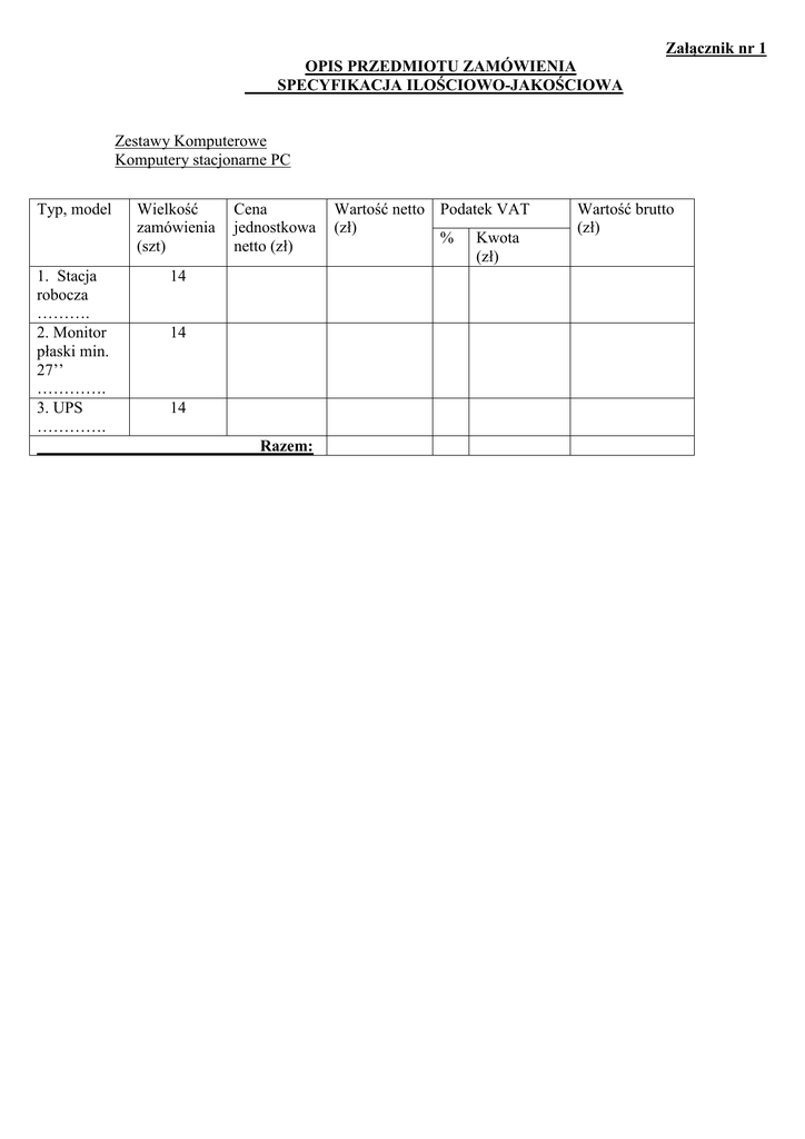 Załącznik nr 1 OPIS PRZEDMIOTU ZAMÓWIENIA SPECYFIKACJA ILOŚCIOWO-JAKOŚCIOWA Zestawy Komputerowe Komputery stacjonarne PC Typ, model Wielkość zamówienia (szt) 1. Stacja robocza ………. 2. Monitor płaski min. 27’’ …………. 3. UPS …………. 14 Cena jednostkowa netto (zł) 14 14 Razem: Wartość netto Podatek VAT (zł) % Kwota (zł) Wartość brutto (zł) System operacyjny Procesor Pamięć RAM Karta sieciowa Karta graficzna Dyski DVD Złącza Zasilacz Aplikacje Klawiatura Mysz Obudowa Monitor płaski min. 27’’ Windows 8.1 PRO PL x64 [Zamawiający używa spełnia / nie spełnia* programów zawodowych działających tylko na systemie Microsoft Windows] posiadający wynik na http://www.cpubenchmark.net spełnia / nie spełnia* „Average CPU Mark” nie mniejszy niż 6500 [np: 4 rdzeniowy w technologii i5; 6MB cache; 3GHz] chłodzony wentylatorem spełnia / nie spełnia* 8GB DDR3-1600 Dodatkowa karta Ethernet 10/100/1000Mbps, RJ45, Wake-On-Lan, karta na PCI Express x1, dołączony kabel sieciowy UTP 5E 5m RJ45 posiadająca wynik na http://www.videocardbenchmark.net nie mniejszy niż 1500 chłodzona wentylatorem, interfejs DVI Systemowy SSD min 160GB [odczyt/zapis minimum 500MB/s, MTBF min. 1000000h]; roboczy 1TB – zapis magnetyczny; interfejs SATA 600 DVD+/-RW USB x 8 [USB 3.0 x 2], PS/2 500W Zamawiający używa dokumentację urzędową w formatach MS Word i MS Excel. MSoffice 2013 Home & Business PKC BOX [ pudełko z kluczem ] ; Irfan View z licencją na Powiatowy Ośrodek Dokumentacji Geodezyjnej I Kartograficznej w Poznaniu Klawiatura ergonomiczna USB Mysz optyczna 1000 dpi, -USB -dwuprzyciskowa, rolka (scroll) jako trzeci przycisk -funkcja scroll'a czterokierunkowego Chłodzenie min. 2 x wentylatory 120mm, Lewy panel boczny wyposażony w system Quick Release Filtry przeciw kurzowe na froncie, Standard ATX, USB 3.0 x 2 na przednim panelu , spełnia / nie spełnia* spełnia / nie spełnia* spełnia / nie spełnia* spełnia / nie spełnia* spełnia / nie spełnia* spełnia / nie spełnia* spełnia / nie spełnia* spełnia / nie spełnia* spełnia / nie spełnia* spełnia / nie spełnia* spełnia / nie spełnia* rozdzielczość 2560 x 1440, kąt widzenia min.: pionowy - 160°, poziomy - 160°, czas reakcji wł/wył. max.. 6ms, jasność 250cd/m2, złącze DVI, D-SUB, DisplayPort kontrast 1000:1, proporcje 16:9, kable zasilające i złącz cyfrowych przy monitorze, regulacja wysokości min 11cm, matryca matowa. Certyfikat EnergyStar UPS 1. nominalne napięcie wejściowe 230V AC spełnia / nie spełnia* 2. moc wyjściowa 400W / 700VA 3. wtyk wejściowy europejski okrągły z uziemieniem, przewód minimum 1.8m 4. gniazda wyjściowe: 4 europejskie okrągłe zasilanie zapasowe + 4 europejskie okrągłe – ochrona przeciwprzepięciowa (wszystkie gniazda z uziemieniem) 5. współczynnik szczytu 3:1 6. schodkowa aproksymacja sinusoidy 7. program monitorujący pod Windows przez USB (*niepotrzebne skreślić) …………………………………………………… (data, pieczątka i podpis Wykonawcy lub upoważnionego przedstawiciela Wykonawcy)
