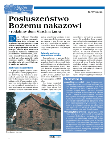 Jerzy Sojka Posłuszeństwo Bożemu nakazowi – rodzinny dom Marcina Lutra D om rodzinny Marcina Lutra w jego wspomnieniach, które zachowały się w spisanych przez jego towarzyszy Mowach stołowych, pojawia się jedynie w pojedynczych okruchach pamięci. Wśród tych okruchów znalazły się wzmianki o chłopskim pochodzeniu Reformatora, połączone ze zdziwieniem, że nie tylko uzyskał najwyższą godność świata ówczesnej nauki – tytuł doktora, ale także stoi w pierwszej linii walki o reformę Kościoła. Zachowane wspomnienia W pamięć zapadła Lutrowi domo wa dyscyplina, w której był wychowa ny. Zachowały się wzmianki o przy padkach surowych kar cielesnych, których doświadczył zarówno od ojca, jak i od matki. Wspomnienia te podsu mowywał stwierdzeniem, że miało to na celu jego dobro i wyrażał wdzięcz ność rodzicom za wychowanie. Obraz wyłaniający się ze wspomnień Refor matora uzupełniają wzmianki o mat ce, która sama była zmuszona nosić na plecach z lasu drewno na opał oraz o jej opowieściach o sąsiadce – czarownicy, która dręczyła ją, zmu szając do utrzymywania z nią dobrych stosunków. Sytuacja społecznoekonomiczna rodziny stosunkowo porządnym gospodar stwem. Tę względnie dobrą sytuację zapewniło ojcu Jana posiadanie ziemi na zasadzie wieczystej dzierżawy. Dzięki temu jego zobowiązania wo bec elektora saskiego ograniczały się jedynie do niewielkiego rocznego czynszu, nie musiał natomiast od pracowywać pańszczyzny. Poza tym chłopi w środkowych Niemczech mieli na przykład własny samorząd, kasę gminną czy możliwość ustalania miejscowych praw. Drugim źródłem względnie dobrej sytuacji dziadka Marcina Lutra było małżeństwo z cór ką ceglarza, które połączyło dwa naj bogatsze rody we wsi. Jednak ojciec Reformatora nie sko rzystał z tego względnego dobrobytu Ten zachowany w pamięci Refor matora fragmentaryczny obraz należy uzupełnić. Rodzice Lutra nosili imio na Jan i Małgorzata. Mieli najprawdo podobniej dziewięcioro dzieci, z któ rych dorosłość osiągnęli Marcin, jego młodszy brat Jakub oraz trzy siostry. Nazwisko rodziców zapisywano jako „Luder”. Forma „Luther” była nato miast przez Reformatora używana dopiero od 1518 Słownik roku. Augustianie eremici – zakon żebraczy oparty Jan Luder pochodził o regułę sformułowaną w XII w. na podstawie pism z Möhra, małej wsi w Tu ojca Kościoła Augustyna i zatwierdzoną na Sobo ryngii. Jego ojciec był rze Laterańskim w 1215 r. Powstał w 1256 r. z po chłopem dysponującym łączenia licznych małych włoskich wspólnot mnichów i eremitów. Klasztor w Erfurcie założono w 1266 r., należał do prowincji saskiej i mieścił od 1504 r. jedyne w saskiej prowincji studium generale, czyli przeznaczoną dla mnichów niezależną od uniwersytetów zakonną szkołę teologiczną z wła snym ciałem pedagogicznym. Zakonnicy rygory stycznie przestrzegali surowej, tzw. obserwanc kiej, reguły, utrzymywali się z jałmużny (dlatego zakon żebraczy) oraz praktykowali ascezę. Uniwersytet w Erfurcie – założony już w 1392 roku, jako jeden z pierwszych uniwersytetów niemieckich. Był jednym z największych z nich, w czasach Lutra studiowało tam ok. 500 studen tów (większe były tylko uniwersytety w Kolonii – 800 i Lipsku – 600 studentów). W czasach Lutra szczególnie ceniony był erfurcki wydział sztuk wy zwolonych (atrium), na którym uczono zgodnie z myślą filozoficznej „nowej drogi” późnego śred niowiecza – nominalizmem. Dom Lutra w Mansfeld 8 12/2012 List do ojca z 21 paź dziernika 152 Marcin Luter pisze 1 roku. ten list do ojca, by za dedykować mu swoje najnowsze dzieło ko najważniejszy ze – pismo Osąd o ślu złożonych przez siebi bach zakonnych (D votis monasticis iudi e. Jego zdaniem wa e tość ślubu czysto cium). Jak sam char rśc i wynika z błędnej in ak te ryzuje je w liście, jest to pismo, „w kt terpretacji czystośc która na gruncie Pi ór ym możesz zobacz i, sm yć przez jakie znak a Świętego stanowi i cuda Chrystus zw i Czystość, której przykazanie Boże. olnił mnie ze ślubó domagano się od za w zakonnych i udzie mi tak wielkiej woln konników, nie jest lił miotem Bożego ości”. przedprzykazania. Mimo W tle tej dedykacji to nadano jej takie zn nie, jakie przyznaje stoi spór pomiędzy aczeinaczej rozumianej cz ojcem a synem, jaki wybuchł ze względ ystości Pismo Święt Zabieg ten ma na u na wybór młode e. celu zwolnienie z po go Lutra, dokonany w 1505 roku, by zosta słuszeństwa zarówn Bogu, jak i rodzicom ć mnichem. Jak sam o . pisze, dokonało się to bez wiedzy i wbre w woli ojca. Planow Mimo że dał się zw ał on dla syna studi ieś ć karierę prawniczą. Re ludzkim doktrynom a i Luter odczytuj i przesądom, formator wspomina e swoje życie w klas również w tym kontekście o ojcowskich ztorze jako Boży za Dzięki temu doświad zamiarach zaaranżo mysł. czeniu doskonale po wania jego małżeństwa. O tym ostatnim znał to, co obecnie jest przedmiotem jeg niestety nie wiadom o o nic więcej, gdyż jes krytyki. Nikt z prze to jedyna wzmianka ciwników nie może t mu więc zarzucić, o takich planach ojc że nie wie, o czym m a wobec syna Marcin Luter chce nieporoz ów i. a. Re umienia, narosłe w formator zaświadcza związku z jego decy także ojcu, że jego su zją sprzed 16 lat, os - wyzwolone przez mienie zostało tatecznie wy jaśnić. Chrystusa i to jest ca Podkreśla na wstępi że osiągnął taki pu łko wi e, ty m St nkt w życiu, w któr ał się nowym stworze wyzwoleniem. ym nie ma dla nieg niem, nie papieża, lec niczego ważniejszeg o ki temu nie należ z Ch o niż przestrzeganie rystusa. Dzięy już do zakonu, ale Bożego nakazu. Następnie Luter re zakon należy do nieg To on decyduje, czy lacjonuje rodzinny o. ma go opuścić. spór. Przypomina pojednanie, do któr ego doszło przy ok Bóg, który wyzwolił az go ji obecności ojca na z z