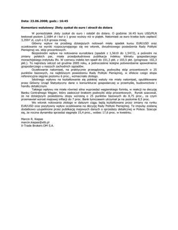 Data: 23.06.2008; godz.: 16:45 Komentarz walutowy: Złoty zyskał do euro i stracił do dolara W poniedziałek złoty zyskał do euro i osłabił do dolara. O godzinie 16:45 kurs USD/PLN testował poziom 2,1684 zł i był o 1 grosz wyższy niż w piątek. Natomiast za euro trzeba było zapłacić 3,3597 zł, czyli o 0,9 grosza mniej. Główny wpływ na przebieg dzisiejszych notowań miały spadek kursu EUR/USD oraz oczekiwanie na wyniki rozpoczynającego się we wtorek, dwudniowego posiedzenia Rady Polityki Pieniężnej ws. stóp procentowych. Bezpośredni wpływ na notowania eurodolara (spadek z 1,5610 do 1,5472), a pośredni na zmiany polskich par, miała przedpołudniowa publikacja indeksu klimatu gospodarczego monachijskiego instytutu Ifo. W czerwcu indeks ten spadł do 101,3 pkt. z 103,5 pkt. (prognoza: 102,3 pkt.). To najniższy odczyt od grudnia 2005 roku, a jednocześnie kolejne potwierdzenie spowolnienia gospodarczego u naszych zachodnich sąsiadów. Oczekiwanie natomiast, na praktycznie przesądzoną, podwyżkę stóp procentowych o 25 punktów bazowych, na najbliższym posiedzeniu Rady Polityki Pieniężnej, w efekcie czego stopa referencyjna sięgnie poziomu 6 proc., wzmacniało złotego. Istotnego wpływu na kształtowanie się polskiej waluty nie miały natomiast, opublikowane przez Główny Urząd Statystyczny dane o koniunkturze gospodarczej w przemyśle, budownictwie i handlu detalicznym. Takiego wpływu nie miała również silna wyprzedaż węgierskiego forinta, w reakcji na decyzję Banku Centralnego Węgier, który zaskoczył brakiem podwyżki stóp procentowych. Rynek szacował, że na dzisiejszym posiedzeniu stopy wzrosną o 25 punktów bazowych do 8,75 proc., za czym przemawiał wzrost majowej inflacji do 7 proc. Bank tymczasem utrzymał je na poziomie 8,5 proc. We wtorek notowania złotego w dalszym ciągu będą kształtowane przez zmiany na rynku EUR/USD oraz pozytywny wpływ oczekiwania na decyzję Rady Polityki Pieniężnej. Te impulsy zostaną dodatkowo uzupełnione przez publikację majowych danych o sprzedaży detalicznej w Polsce. Szacuje się, że roczna dynamika sprzedaż sięgnęła 15,4 proc., wobec 17,6 proc. w kwietniu. Marcin R. Kiepas [email protected] X-Trade Brokers DM S.A.