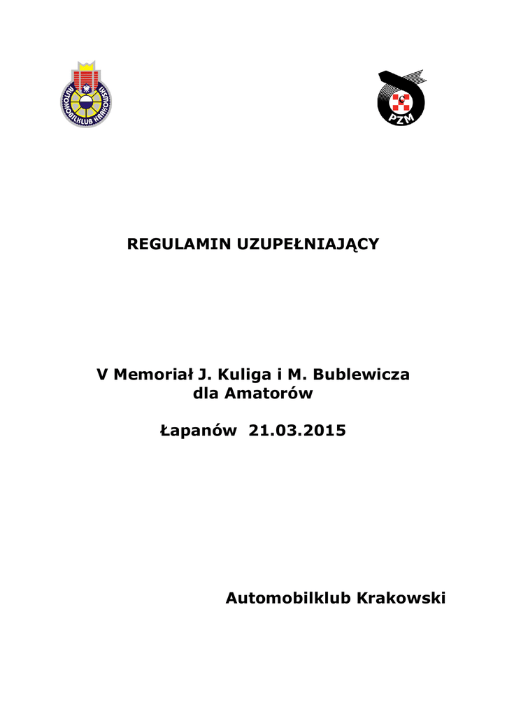 c REGULAMIN UZUPEŁNIAJĄCY V Memoriał J. Kuliga i M. Bublewicza dla Amatorów Łapanów 21.03.2015 Automobilklub Krakowski USTALENIA OGÓLNE Konkursowa Jazda Samochodem zostanie przeprowadzona zgodnie z postanowieniami: 1. Międzynarodowego Kodeksu Sportowego FIA, 2. Regulaminu Sportowego Rajdów Regionalnych FIA wraz z załącznikami 3. Regulaminu Konkursowej Jazdy Samochodem, 4. Regulaminu Ochrony Środowiska w Sportach Motorowych, 5. Ustawy „Prawo o ruchu drogowym”, 6. niniejszego regulaminu uzupełniającego. Modyfikacje, zmiany i/lub uzupełnienia do niniejszego regulaminu uzupełniającego będą publikowane wyłącznie w numerowanych i datowanych komunikatach ogłaszanych przez organizatora lub ZSS. Otwarcie listy zgłoszeń Zamknięcie listy zgłoszeń Odbiór administracyjny Badanie kontrolne BK 1 Odprawa Pierwsze posiedzenie ZSS Publikacja listy załóg dopuszczonych do startu Start Meta Opublikowanie końcowej klasyfikacji prowizorycznej Rozdanie nagród 21.02.2015 18.03.2015 21.03.2015 21.03.2015 21.03.2015 21.03.2015 21.03.2015 21.03.2015 21.03.2015 21.03.2015 godz. godz. godz. godz. godz. godz. godz. godz. godz. 24:00 06:30-09:30 06:45-09:45 10:50 10:00 11:15 11:30 15:17 17:30 21.03.2015 godz. 18:00 1. USTALENIA OGÓLNE 1.1. Miejsce i termin imprezy Impreza odbędzie się w dniu 21.03.2015 w Łapanowie 1.2. Nazwa i ranga imprezy KJS V Memoriał J. Kuliga i M. Bublewicza dla Amatorów rozgrywany jest jako impreza sportowa biorąca udział w punktacji do licencji rajdowych. 1.3. Numer wizy ZO PZM Numer wizy 1/OKSS/KJS/2015 zatwierdzona przez OKSS PZM w dniu 6.02.2015r. 1.4. Lokalizacja biura Biuro znajdować się będzie do dnia 20.03.2015 w siedzibie Automobilklubu Krakowskiego ul. Klasztorna 1, Kraków tel/fax: 12/411-89-63 e-mail: [email protected] W dniu imprezy 21.03.2015 pod adresem Remiza OSP w Łapanowie w godzinach 06:30 – 18:15 1.5. Lokalizacja startu i mety Start – Rynek Łapanów godz. 11:30 Meta – Rynek Łapanów godz. 15:17 Park zamknięty – organizator nie przewiduje 1.6. Charakterystyka Impreza zostanie przeprowadzona w ciągu jednego dnia i składa z 3 sekcji. Na trasie zlokalizowane będzie 9 prób poprzedzonych PKC. Nawierzchnia trasy i prób : asfalt, beton Długość trasy: 44,75 km (w tym 8,1 km prób) Trasa imprezy jest obowiązkowa i została opisana w książce drogowej. 1.7.Ukończenie/sklasyfikowanie w KJS - V Memoriał J.Kuliga i M. Bublewicza dla Amatorów uprawnia do uzyskania punktów do licencji sportu samochodowego stopnia RN. 2. ORGANIZACJA 2.1. Nazwa organizatora Automobilklub Krakowski 2.2. Adres ul. Klasztorna 1, Kraków tel: 12/411-89-63 e-mail: [email protected] 2.3. Władze KJS 2.3.1. Zespół Sędziów Sportowych Przewodniczący Członek Członek Sebastian Oćwieja Patryk Śmietana Jarosław Kurletto 2.3.2. Osoby oficjalne Dyrektor Imprezy V-ce Dyrektora ds. sportowych Kierownik trasy i bezpieczeństwa Kierownik biura Dariusz Kowalski Beata Czernicka Wojciech Percik Monika Duda Kierownik komisji obliczeń Kierownik badań kontrolnych Kierownik pomiaru czasu Małgorzata Dybczyk Jacek Lis Michał Owca 3. ZGŁOSZENIA 3.1. Załoga 3.1.1. Załogę stanowią wyłącznie dwie osoby, określani jako kierowca i pilot. Kierowca musi mieć prawo jazdy kategorii B, a pilot ukończone 17 lat. 3.1.2. Kierowca nie może posiadać jakiejkolwiek licencji kierowcy sportu samochodowego w rozumieniu przepisów Polskiego Związku Motorowego, za wyjątkiem zawodników posiadających licencję, wymienionych w punkcie 1.1 regulaminu ramowego KJS. Dopuszcza się udział zawodników licencjonowanych, klasyfikowanych w klasie Gość 3.1.3. Pilot nie może prowadzić samochodu podczas imprezy. W przypadku stwierdzenia prowadzenia samochodu przez pilota, załoga zostanie wykluczona. 3.2. Obowiązki załogi Do obowiązków załogi należy: 3.2.1. Obecność na odprawie 3.2.2. Przejazd trasy imprezy z pobraniem wiz na wszystkich PKC w podanej przez organizatora kolejności i kierunku zgodnym z książką drogową. 3.2.3. Odbycie wszystkich prób w zapiętych pasach bezpieczeństwa, zapiętych kaskach ochronnych, z włączonymi światłami mijania lub światłami do jazdy dziennej oraz zamkniętymi szybami i szyberdachem. Nieprzestrzeganie powyższych przepisów pociągnie za sobą karę do wykluczenia włącznie. 3.3. Procedura zgłoszeń 3.3.1. Uczestnik zamierzający wziąć udział w V Memoriale J.Kuliga i M. Bublewicza dla Amatorów musi przesłać do dnia 18.03.2015 do godz. 24:00 wypełnione zgłoszenie na adres: [email protected] Formularz dostępny na stronie: www.automobilklub.krakow.pl 3.3.2. Jeżeli zgłoszenie wysłane jest pocztą e-mail, oryginał musi dotrzeć do organizatora najpóźniej w dniu odbioru administracyjnego. Oryginał zgłoszenia musi być czytelny i podpisany przez obydwu członków załogi. 3.3.3. Zgłoszenie zostanie przyjęte tylko w przypadku, gdy towarzyszyć mu będzie pokwitowanie wpłaty pełnej kwoty wpisowego 3.3.4. Przez fakt podpisania zgłoszenia załoga przyjmuje do wiadomości, że startuje w imprezie na własną odpowiedzialność i zrzeka się wszelkich praw do odszkodowań za straty wynikłe podczas imprezy. Zrzeczenie to dotyczy FIA, PZM, Organizatora, osób oficjalnych występujących w imprezie i innych uczestników. 3.3.5. Organizator ma prawo nie przyjęcia zgłoszenia w szczególnych przypadkach: nieetyczne zachowanie lub niewypełnienie czytelnie oryginału zgłoszenia. 3.4. Liczba załóg i klas 3.4.1. Pojemność trasy: 90 załóg 3.4.2. W przypadku zgłoszenia więcej niż 90 załóg o przyjęciu decydować będzie kolejność wpływu zgłoszeń do biura KJS. Zgłoszenia bez wpłaty wpisowego nie będą przyjmowane. 3.5. Pojazdy dopuszczone Do udziału w KJS dopuszcza się samochody osobowe w rozumieniu Prawa o Ruchu Drogowym lub osobowo/towarowe na bazie podwozia samochodu osobowego, ze sztywnym zamkniętym dachem, posiadające ważne dokumenty uprawniające do poruszania się po drogach public