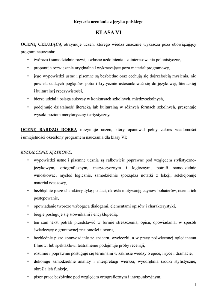 Kryteria oceniania z języka polskiego KLASA VI OCENĘ CELUJĄCĄ otrzymuje uczeń, którego wiedza znacznie wykracza poza obowiązujący program nauczania: • twórczo i samodzielnie rozwija własne uzdolnienia i zainteresowania polonistyczne, • proponuje rozwiązania oryginalne i wykraczające poza materiał programowy, • jego wypowiedzi ustne i pisemne są bezbłędne oraz cechują się dojrzałością myślenia, nie powiela cudzych poglądów, potrafi krytycznie ustosunkować się do językowej, literackiej i kulturalnej rzeczywistości, • bierze udział i osiąga sukcesy w konkursach szkolnych, międzyszkolnych, • podejmuje działalność literacką lub kulturalną w różnych formach szkolnych, prezentuje wysoki poziom merytoryczny i artystyczny. OCENĘ BARDZO DOBRĄ otrzymuje uczeń, który opanował pełny zakres wiadomości i umiejętności określony programem nauczania dla klasy VI: KSZTAŁCENIE JĘZYKOWE: • wypowiedzi ustne i pisemne ucznia są całkowicie poprawne pod względem stylistycznojęzykowym, ortograficznym, merytorycznym i logicznym, potrafi samodzielnie wnioskować, myśleć logicznie, samodzielnie sporządza notatki z lekcji, selekcjonuje materiał rzeczowy, • bezbłędnie pisze charakterystykę postaci, określa motywację czynów bohaterów, ocenia ich postępowanie, • opowiadanie twórcze wzbogaca dialogami, elementami opisów i charakterystyki, • biegle posługuje się słownikami i encyklopedią, • ten sam tekst potrafi przedstawić w formie streszczenia, opisu, opowiadania, w sposób świadczący o gruntownej znajomości utworu, • bezbłednie pisze sprawozdanie ze spaceru, wycieczki, a w pracy poświęconej oglądanemu filmowi lub spektaklowi teatralnemu podejmuje próby recenzji, • rozumie i poprawnie posługuje się terminami w zakresie wiedzy o epice, liryce i dramacie, • dokonuje samodzielnie analizy i interpretacji wiersza, wyodrębnia środki stylistyczne, określa ich funkcje, • pisze prace bezbłędne pod względem ortograficznym i interpunkcyjnym. 1 FLEKSJA I SKŁADNIA: • zna rodzaje zaimków, ich funkcję w zdaniu, uzasadnia zastosowanie skróconych form zaimków, • biegle stopniuje przymiotniki i przysłówki, nazywa rodzaj stopniowania, • pisze poprawnie "nie" z różnymi częściami mowy, • rozpoznaje różne typy liczebników, potrafi uzasadnić użycie danego liczebnika, odmienia trudniejsze liczebniki złożone, • stosuje w zdaniu rzeczownik w różnych funkcjach składniowych (podmiotu, orzecznika w orzeczeniu imiennym, przydawki, dopełnienia), • rozpoznaje zdanie z orzeczeniem imiennym, omawia jego budowę, • podając przykłady, omawia różne sposoby wyrażania orzeczenia oraz podmiotu, przydawki, dopełnienia i okolicznika, • przeprowadza klasyfikację zdań złożonych. SŁOWOTWÓRSTWO: • przeprowadza analizę słowotwórczą wyrazów, • wskazuje przyrostek lub przedrostek jako formant w jednym wyrazie i jako składnik podstawy słowotwórczej w innym, • podaje przykłady z obocznymi tematami słowotwórczymi, daje przykłady wyrazów utworzonych za pomocą różnych formantów. OCENĘ DOBRĄ otrzymuje uczeń, który opanował wiadomości i umiejętności przewidziane podstawą programową oraz wybrane elementy przewidziane programem nauczania w kl. VI: KSZTAŁCENIE LITERACKIE I JĘZYKOWE: • czyta poprawnie, stosując zasady prawidłowej intonacji i akcentowania, • jego wypowiedzi ustne i pisemne mogą zawierać jedynie nieliczne błędy językowe, • potrafi samodzielnie poprawić większość własnych błędów, • dobra znajomość tekstu pozwala mu na odtwórcze opowiadanie losów bohaterów i omówienie elementów świata przedstawionego, • poprawnie pisze plan ramowy i szczegółowy, • wskazuje poznane środki stylistyczne w wierszu i omawia ich funkcje, 2 FLEKSJA I SKŁADNIA: • wymienia rodzaje zaimków, • wyróżnia przysłówki od innych części mowy, wskazuje sposób ich utworzenia, • poprawnie stopniuje przymiotniki i przysłówki, wie, czemu służy stopniowanie, • podaje przykłady różnych typów liczebników, odmienia liczebniki zbiorowe, • na konkretnych przykładach omawia sposób wyrażenia orzeczenia i podmiotu, wyróżnia w zdaniu związki wyrazów, • odróżnia zdania złożone podrzędnie od zdań złożonych współrzędnie. SŁOWOTWÓRSTWO: • od podanych wyrazów podstawowych tworzy kilka wyrazów pochodnych, będących różnymi częsciami mowy, • rozpoznaje wyraz pochodny, który może być podstawowym dla innego wyrazu, • wyjaśnia pisownię podanego wyrazu, odwołując się do wiadomości ze słowotwórstwa. OCENĘ DOSTATECZNĄ otrzymuje uczeń, który opanował wiedzę i umiejętności zawarte w podstawie programowej dla kl. VI w zakresie umożliwiającym postępy w dalszym uczeniu się: KSZTAŁCENIE LITERACKIE I JĘZYKOWE: • w wypowiedziach ustnych i pisemnych na ogół przestrzega zasad poprawnościowych w zakresie budowy zdań, stosowania poznanego słownictwa i ortografii, • w miarę samodzielnie posługuje się następującymi formami wypowiedzi: opowiadanie, opowiadanie z dialogiem, opis (postaci, przedmiotu, krajobrazu), sprawozdanie, list, dziennik, pamiętnik, zaproszenie, telegram, ogłoszenie, przepis, instrukcja, notatka, życzenie, gratulacje, zawiadomienie, • jego technika głośnego i cichego czytania pozwala na zrozumienie tekstu, • zna przewidziane programem gatunki literackie, • odróżnia obrazowanie realistyczne od fantastycznego, • umie wymienić elementy świata przedstawionego (miejsce i czas akcji, bohaterów, wydarzenia), • odróżnia podmiot liryczny od bohatera utworu, • poprawia popełnione błędy językowe przy pomocy nauczyciela, • gromadzi słownictwo na zadany temat. 3 FLEKSJA I SKŁADNIA: • wyróżnia w tekście czasowniki w formie osobowej i nieosobowej, • określa funkcję czasownika w zdaniu, • odmienia podane rzeczowniki przez przypadki, • rozpoznaje w zdaniu zaimk