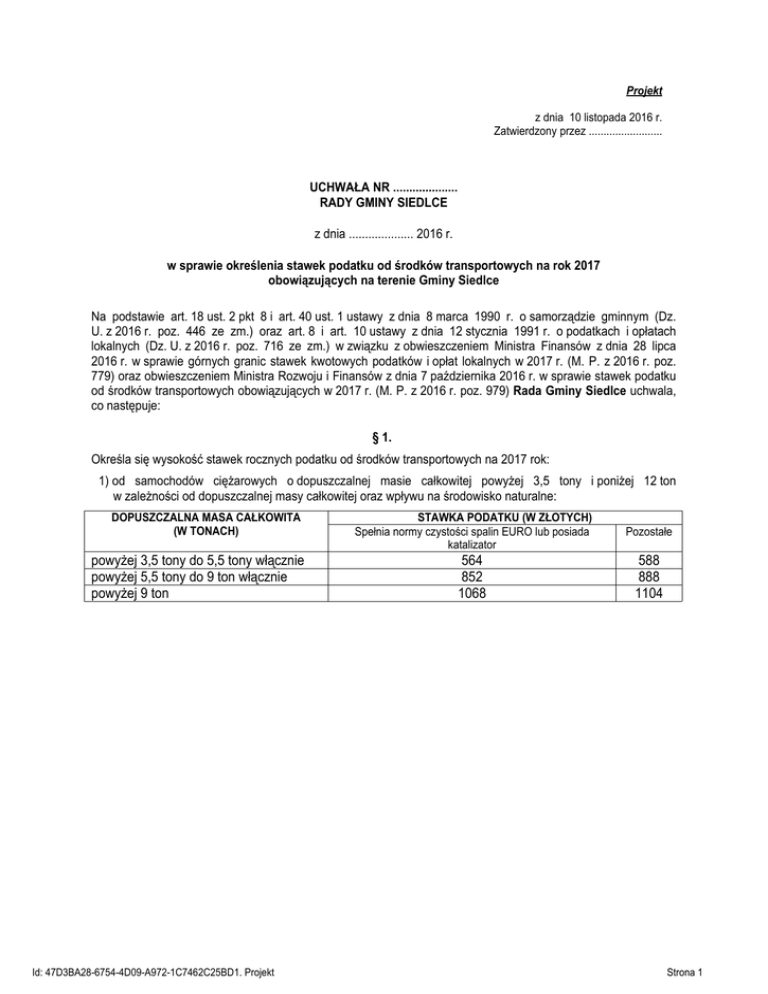 Projekt z dnia 10 listopada 2016 r. Zatwierdzony przez ......................... UCHWAŁA NR .................... RADY GMINY SIEDLCE z dnia .................... 2016 r. w sprawie określenia stawek podatku od środków transportowych na rok 2017 obowiązujących na terenie Gminy Siedlce Na podstawie art. 18 ust. 2 pkt 8 i art. 40 ust. 1 ustawy z dnia 8 marca 1990 r. o samorządzie gminnym (Dz. U. z 2016 r. poz. 446 ze zm.) oraz art. 8 i art. 10 ustawy z dnia 12 stycznia 1991 r. o podatkach i opłatach lokalnych (Dz. U. z 2016 r. poz. 716 ze zm.) w związku z obwieszczeniem Ministra Finansów z dnia 28 lipca 2016 r. w sprawie górnych granic stawek kwotowych podatków i opłat lokalnych w 2017 r. (M. P. z 2016 r. poz. 779) oraz obwieszczeniem Ministra Rozwoju i Finansów z dnia 7 października 2016 r. w sprawie stawek podatku od środków transportowych obowiązujących w 2017 r. (M. P. z 2016 r. poz. 979) Rada Gminy Siedlce uchwala, co następuje: § 1. Określa się wysokość stawek rocznych podatku od środków transportowych na 2017 rok: 1) od samochodów ciężarowych o dopuszczalnej masie całkowitej powyżej 3,5 tony i poniżej 12 ton w zależności od dopuszczalnej masy całkowitej oraz wpływu na środowisko naturalne: DOPUSZCZALNA MASA CAŁKOWITA (W TONACH) powyżej 3,5 tony do 5,5 tony włącznie powyżej 5,5 tony do 9 ton włącznie powyżej 9 ton Id: 47D3BA28-6754-4D09-A972-1C7462C25BD1. Projekt STAWKA PODATKU (W ZŁOTYCH) Spełnia normy czystości spalin EURO lub posiada katalizator Pozostałe 564 852 1068 588 888 1104 Strona 1 2) od samochodów ciężarowych o dopuszczalnej masie całkowitej równej lub wyższej niż 12 ton, w zależności od liczby osi, dopuszczalnej masy całkowitej pojazdu i rodzaju zawieszenia: LICZBA OSI I DOPUSZCZALNA MASACAŁKOWITA (W TONACH) nie mniej niż mniej niż 12 13 14 15 13 14 15 STAWKA PODATKU (W ZŁOTYCH) Oś jezdna (osie jezdne) z zawieszeniem pneumatycznym lub zawieszeniem uznanym za równoważne Inne systemy zawieszenia osi jezdnych Dwie osie 912 972 1164 1212 972 1164 1212 1560 1164 1200 1272 1488 1680 2028 Cztery osie i więcej 1488 1524 1776 2028 2268 1200 1272 1488 1716 2028 2088 Trzy osie 12 17 19 21 23 25 17 19 21 23 25 12 25 27 29 31 25 27 29 31 1548 1776 2028 2496 2496 3) od ciągnika siodłowego i balastowego przystosowanego do używania łącznie z naczepą lub przyczepą o dopuszczalnej masie całkowitej zespołu pojazdów od 3,5 tony i poniżej 12 ton w zależności od wpływu na środowisko: DOPUSZCZALNA MASA CAŁKOWITA (W TONACH) od 3,5 tony i poniżej 12 ton Id: 47D3BA28-6754-4D09-A972-1C7462C25BD1. Projekt STAWKA PODATKU (W ZŁOTYCH) Spełnia normy czystości spalin EURO Nie spełnia norm EURO 1032 1272 Strona 2 4) od ciągnika siodłowego i balastowego przystosowanego do używania łącznie z naczepą lub przyczepą o dopuszczalnej masie całkowitej zespołu pojazdów równej lub wyższej niż 12 ton w zależności od liczby osi, dopuszczalnej masy całkowitej zespołu pojazdów i rodzaju zawieszenia: LICZBA OSI I DOPUSZCZALNA MASA CAŁKOWITA ZESPOŁU POJAZDÓW: CIĄGNIK SIODŁOWY+ NACZEPA, CIĄGNIK BALASTOWY + PRZYCZEPA (W TONACH) nie mniej niż STAWKA PODATKU (W ZŁOTYCH) Oś jezdna (osie jezdne) z zawieszeniem pneumatycznym lub zawieszeniem uznanym za równoważne mniej niż Inne systemy zawieszenia osi jezdnych Dwie osie 12 18 25 31 18 25 31 12 40 40 1248 1452 1488 1560 1440 1560 1560 1932 1728 1848 1932 2496 Trzy osie i więcej 5) od przyczep i naczep, które łącznie z pojazdem silnikowym posiadają dopuszczalną masę całkowitą od 7 ton i poniżej 12 ton, z wyjątkiem związanych wyłącznie z działalnością rolniczą prowadzoną przez podatnika podatku rolnego: DOPUSZCZALNA MASA CAŁKOWITA (W TONACH) od 7 ton i poniżej 12 ton Id: 47D3BA28-6754-4D09-A972-1C7462C25BD1. Projekt STAWKA PODATKU (W ZŁOTYCH) 540 Strona 3 6) od przyczep i naczep, które łącznie z pojazdem silnikowym posiadają dopuszczalną masę całkowitą równą lub wyższą niż 12 ton, z wyjątkiem związanych wyłącznie z działalnością rolniczą prowadzoną przez podatnika podatku rolnego, w zależności od liczby osi, dopuszczalnej masy całkowitej pojazdów i rodzaju zawieszenia: LICZBA OSI I DOPUSZCZALNA MASA CAŁKOWITA ZESPOŁU POJAZDÓW: NACZEPA/PRZYCZEPA + POJAZD SILNIKOWY (W TONACH) nie mniej niż mniej niż STAWKA PODATKU (W ZŁOTYCH) Oś jezdna (osie jezdne) z zawieszeniem pneumatycznym lub zawieszeniem uznanym za równoważne Inne systemy zawieszenia osi jezdnych Jedna oś 12 18 25 18 25 12 28 33 38 28 33 38 24 216 600 36 372 648 264 696 960 1224 372 960 1392 1800 900 1008 1056 1260 Dwie osie Trzy osie i więcej 12 38 Id: 47D3BA28-6754-4D09-A972-1C7462C25BD1. Projekt 38 Strona 4 7) od autobusu, w zależności od liczby miejsc do siedzenia poza miejscem kierowcy: ILOŚĆ MIEJSC DO SIEDZENIA STAWKA PODATKU (W ZŁOTYCH) Spełnia normy czystości spalin EURO Nie spełnia norm EURO mniej niż 22 miejsca równej lub większej niż 22 miejsca 900 1644 1080 1692 § 2. Z dniem 31 grudnia 2016 r. traci moc uchwała Nr XVII/107/2015 Rady Gminy Siedlce z dnia 19 listopada 2015 r. w sprawie określenia stawek podatku od środków transportowych na rok 2016 obowiązujących na terenie Gminy Siedlce. § 3. Wykonanie uchwały powierza się Wójtowi Gminy Siedlce. § 4. Uchwała wchodzi w życie po upływie 14 dni od dnia ogłoszenia w Dzienniku Urzędowym Województwa Mazowieckiego z mocą obowiązującą od dnia 1 stycznia 2017 r. Przewodnicząca Rady Elżbieta Łęczycka Id: 47D3BA28-6754-4D09-A972-1C7462C25BD1. Projekt Strona 5