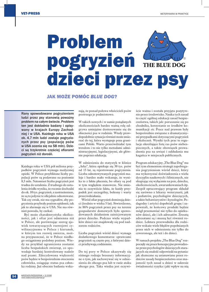 VET-PRESS WETERYNARIA W PRAKTYCE Problem pogryzień dzieci przez psy JAK MOŻE POMÓC BLUE DOG? Rany spowodowane pogryzieniem ludzi przez psy stanowią poważny problem na całym świecie. Problem ten jest dokładnie badany i opisywany w krajach Europy Zachodniej i w USA. Każdego roku w USA ok. 4,7 mln ludzi zostaje pogryzionych przez psy (populację psów w USA ocenia się na 58 mln). Dzieci są trzykrotnie częściej ofiarami pogryzień niż dorośli. Każdego roku w USA pół miliona przypadków pogryzień wymaga medycznej opieki. W Polsce przybliżone liczby populacji psów są podawane na poziomie 8,5 mln. Natomiast liczba pogryzień jest trudna do ustalenia. Z trudnego do ustalenia źródła wynika, że rocznie dochodzi do ok. 10 tys. pogryzień, z zastrzeżeniem, że są to jedynie te oficjalnie odnotowane. Tak czy owak, nie ma sygnałów, aby pogryzienia przybrały poziom epidemii, tak jak to alarmuje się w USA. Nie ma również powodu, by czekać. Być może charakterystyka okoliczności, jak i ofiar jest odmienna niż w Polsce, ale porównując szereg zjawisk towarzyszących rozwojowi cywilizacyjnemu w Polsce i kierunek, w którym ten rozwój zmierza, można przypuszczać, że w Polsce niedługo osiągniemy podobny poziom. Wtedy na przykład ograniczona zostanie liczba bezpańskich zwierząt, co spowoduje bardziej kontrolowany nadzór nad psami. Zdecydowana większość psów będzie w bezpośrednim otoczeniu człowieka, osiągając status psa członka rodziny. Już obecnie badania wska- 94 WRZESIEŃ-PAŹDZIERNIK • 5/2008 www.weterynaria.elamed.pl zują, że ponad połowa właścicieli psów postrzega je podmiotowo. W takich nowych i w sumie pożądanych okolicznościach bardzo ważną rolę odgrywa umiejętne dostosowanie się do obecności psa w rodzinie. Wtedy prawdopodobnie sytuacja również może zmierzać do tej, która występuje poza granicami Polski. Warto przeciwdziałać tym trendom i to nie tylko metodami administracyjnymi, legislacyjnymi, ale głównie poprzez edukację. W odniesieniu do statystyk w klinice „Arka”, która opiekuje się 30 tys. psów od 15 lat, są rejestrowane pogryzienia. Liczba odnotowywanych pogryzień maleje i bardzo mało wskazuje, że wynika to z faktu płacenia, bo ofiary są pod w tym względem stanowcze. Nie zmienia to oczywiście faktu, że każdy przypadek jest szczególny, bolesny i warty przeciwdziałania. Wśród ofiar pogryzień dominują dzieci (średnio w wieku 5 lat). Stwierdzono, że 86% pogryzień przez psy na terenie gospodarstw domowych było spowodowanych działaniem zainicjowanym przez dziecko. Podczas wielu wypadków dzieci nie znajdowały się pod nadzorem rodziców. Liczba pogryzień wśród dzieci wymaga dodatkowego komentarza: sprawcami pogryzień są często psy, z którymi dzieci przebywają codziennie. Do tej pory w Polsce ukazywały się różnego rodzaju broszury informacyjne o tym, jak zachowywać się w odniesieniu do obcego psa lub w razie ataku obcego psa. Taka wiedza jest oczywi- ście ważna i została przyjęta pozytywnie przez środowisko. Nauka tych zasad to część ogólnej edukacji zasad bezpieczeństwa, takich jak: poruszanie się po chodniku, korzystanie ze środków komunikacji etc. Prace nad prawem były bezpośrednio związane z dramatycznymi przypadkami dotyczącymi pogryzień i okaleczeń. Wyniki tych prac to regulacje określające listę ras psów niebezpiecznych, a także obowiązek prowadzenia psa na uwięzi i zakładania mu kagańca w miejscach publicznych. Program edukacyjny „The Blue Dog” ma być tym elementem strategii zapobiegania pogryzieniom wśród dzieci, który ma wykorzystać doświadczenia z wielu dyscyplin naukowych i klinicznych, nie skupiając się wyłącznie na psie, dziecku, okolicznościach, uwarunkowaniach itp. Zespół opracowujący program składał się zarówno z lekarzy weterynarii, jak i pediatrów, psychologów dziecięcych, a także behawiorystów i kynologów. Pedagodzy i artyści dopełniali grupę i zapewniali, że końcowy produkt będzie mógł przemawiać nie tylko do opiekunów dzieci, ale i ich adresatów. Zresztą adresatami są i muszą być również rodzice. Lektura przewodnika dla rodziców wskaże wiele błędów popełnianych przez nich w odniesieniu nie tylko do czworonoga, ale też i do dzieci. W ramach projektu „The Blue Dog” rozpoczęły się prace koncepcyjne prowadzone przez psychologów dziecięcych starających się znaleźć odpowiedź na pytania: jak skuteczne są ustanawiane przez rodziców zasady bezpieczeństwa oraz znajomość tych zasad u dzieci w zakresie świadomości ryzyka i jaki wpływ na nią VET-PRESS WETERYNARIA W PRAKTYCE Jestem jednym z twórców polskiej wersji pakietu edukacyjnego „The Blue Dog”. Bardzo dziękuję Katarzynie Stachniak za pomoc, redakcji „Magazynu Weterynaryjnego” i Monice Pączkowskiej za edycję tesktu, Krajowej Radzie Lekarsko-Weterynaryjnej za wsparcie finansowe projektu. Polska wersja „The Blue Dog” to wkład Polskiego Stowarzyszenia Lekarzy Weterynarii Małych Zwierząt w wysiłek edukacyjny zmierzający do zmniejszenia liczby pogryzień. dr n. wet. Jerzy Gawor prezes Polskiego Stowarzyszenia Lekarzy Weterynarii Małych Zwierząt mają wskazówki rodziców? Jak pokonać istniejące przeszkody? Czy można uczyć się z innych źródeł? Następnie rozpoczęto ocenę modelu edukacyjnego przez Departament Psychologii Klinicznej Uniwersytetu Lincoln w Wielkiej Brytanii. W międzyczasie powstała integracyjna część pakietu, czyli „Przewodnik dla Rodziców”. Projekt oficjalnie zakończono w 2006 roku w czasie Światowego Kongresu Lekarzy Weterynarii Małych Zwierząt w Pradze. 74 WŁASNE DOŚWIADCZENIA Sam jestem rodzicem (dzieci w wieku 17, 8 oraz 7 lat), a także mam psa w rodzinie. Nigdy nie przyszło mi do głowy, aby rewidować pozycję psa względem dzieci. Zawsze miałem pewność, że pozycja dzieci jest i musi być niepodważalna, również dla psa. Studia weteryn