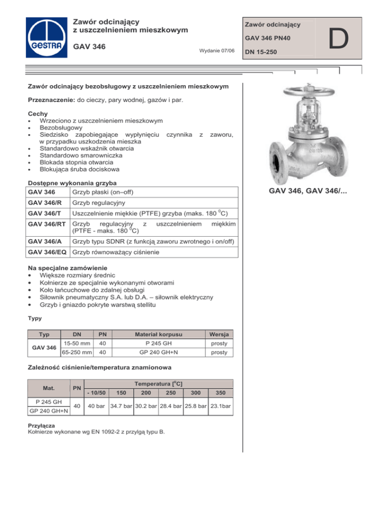 Zawór odcinaj cy z uszczelnieniem mieszkowym Zawór odcinaj cy GAV 346 PN40 GAV 346 Wydanie 07/06 DN 15-250 D Zawór odcinaj cy bezobsługowy z uszczelnieniem mieszkowym Przeznaczenie: do cieczy, pary wodnej, gazów i par. Cechy • Wrzeciono z uszczelnieniem mieszkowym • Bezobsługowy • Siedzisko zapobiegaj ce wypłyni ciu czynnika w przypadku uszkodzenia mieszka • Standardowo wska nik otwarcia • Standardowo smarowniczka • Blokada stopnia otwarcia • Blokuj ca ruba dociskowa z zaworu, Dost pne wykonania grzyba Grzyb płaski (on–off) GAV 346 GAV 346, GAV 346/... GAV 346/R Grzyb regulacyjny GAV 346/T Uszczelnienie mi kkie (PTFE) grzyba (maks. 180 0C) regulacyjny z GAV 346/RT Grzyb (PTFE - maks. 180 0C) uszczelnieniem mi kkim Grzyb typu SDNR (z funkcj zaworu zwrotnego i on/off) GAV 346/A GAV 346/EQ Grzyb równowa cy ci nienie Na specjalne zamówienie • Wi ksze rozmiary rednic • Kołnierze ze specjalnie wykonanymi otworami • Koło ła cuchowe do zdalnej obsługi • Siłownik pneumatyczny S.A. lub D.A. – siłownik elektryczny • Grzyb i gniazdo pokryte warstw stellitu Typy Typ GAV 346 Zale no DN PN Materiał korpusu Wersja 15-50 mm 40 P 245 GH prosty 65-250 mm 40 GP 240 GH+N prosty ci nienie/temperatura znamionowa Mat. P 245 GH GP 240 GH+N PN 40 Temperatura [0C] - 10/50 150 200 250 300 350 40 bar 34.7 bar 30.2 bar 28.4 bar 25.8 bar 23.1bar Przył cza Kołnierze wykonane wg EN 1092-2 z przylg typu B. POZNAŃ Zawór odcinaj cy D www.armaterm.pl tel. +48 (61) 8488 431 fax +48 (61) 8488 431 e-mail: [email protected] GAV 346 PN40 DN 15-250 © GESTRA Polonia - Gda sk V 10 5 Materiały Poz. Opis Materiał/nr mat. (wg DIN, EN) 9 2 1 Korpus H 11 12 P 245 GH DN65-DN100 GP 240 GH+N DN15-DN50 P 245 GH DN65-DN100 GP 240 GH+N 2 Jarzmo 6 3 Gniazdo 1.4370 4 4 Grzyb 1.4021 8 D DN DN15-DN50 7 5 Trzpie 1.4021 3 6 Mieszek 1.4541 1 7 Płytka przeciwcierna 8 Uszczelka 9 Uszczelnienie dławnicy 10 Koło r czne L GAV 346, GAV 346/... 11 12 1.4021 grafit + st. nierdzewna grafit stal tłoczona ruba dwustronna stal w glowa Nakr tka stal w glowa Wymiary, współczynnik kvs i masa DN D [mm] L [mm] H [mm] V [mm] kvs 3 [m /h] Masa [kg] 15 95 130 230 125 4.8 4.8 20 105 150 233 125 7.6 5.4 25 115 160 240 125 12.2 6.8 32 140 180 248 125 17.5 9.3 40 150 200 277 150 27.8 12.9 50 165 230 287 150 44.3 15.6 65 185 290 373 200 81 27 80 200 310 377 200 115.4 31 100 235 350 410 250 184.1 45 300 272.5 70 125 270 400 458 150 300 480 516 350 382.7 99 200 375 600 633 400 690.6 188 250 450 730 785 500 1086 275 Specyfikacja zamówienia Gestra zawór odcinaj cy Typ GAV 346 lub GAV 346/... DN... PN40 Dodatkowe informacje Dostawa według naszych ogólnych warunków dostawy Zastrzega si prawo do wprowadzenia zmian konstrukcji i danych technicznych