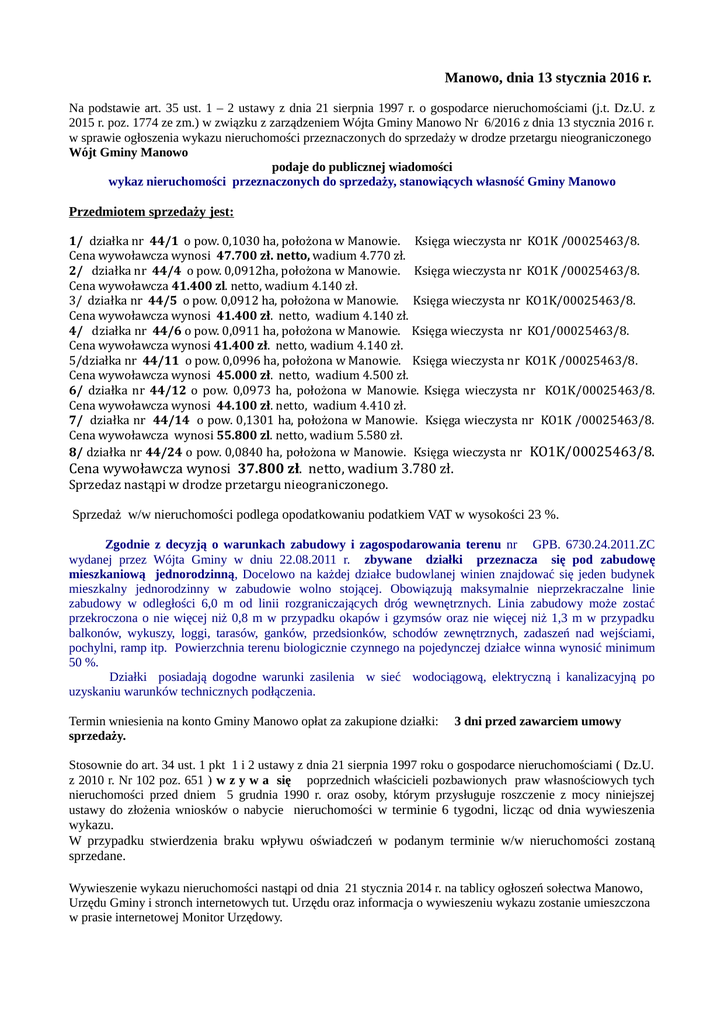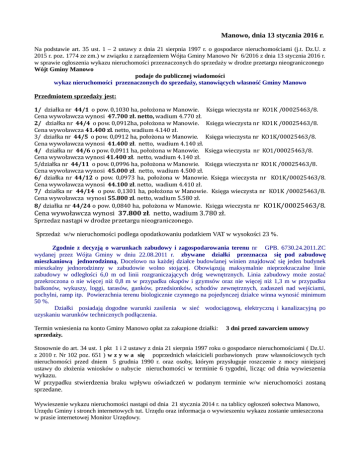Manowo, dnia 13 stycznia 2016 r. Na podstawie art. 35 ust. 1 – 2 ustawy z dnia 21 sierpnia 1997 r. o gospodarce nieruchomościami (j.t. Dz.U. z 2015 r. poz. 1774 ze zm.) w związku z zarządzeniem Wójta Gminy Manowo Nr 6/2016 z dnia 13 stycznia 2016 r. w sprawie ogłoszenia wykazu nieruchomości przeznaczonych do sprzedaży w drodze przetargu nieograniczonego Wójt Gminy Manowo podaje do publicznej wiadomości wykaz nieruchomości przeznaczonych do sprzedaży, stanowiących własność Gminy Manowo Przedmiotem sprzedaży jest: 1/ działkanr44/1opow.0,1030ha,położ onawManowie.KsięgawieczystanrKO1K/00025463/8. Cenawywoławczawynosi47.700zł.netto,wadium4.770zł. 2/ działkanr44/4opow.0,0912ha,położ onawManowie.KsięgawieczystanrKO1K/00025463/8. Cenawywoławcza41.400zl.netto,wadium4.140zł. 3/działkanr44/5opow.0,0912ha,położ onawManowie.KsięgawieczystanrKO1K/00025463/8. Cenawywoławczawynosi41.400zł.netto,wadium4.140zł. 4/ działkanr44/6opow.0,0911ha,położ onawManowie.KsięgawieczystanrKO1/00025463/8. Cenawywoławczawynosi41.400zł.netto,wadium4.140zł. 5/działkanr44/11opow.0,0996ha,położ onawManowie.KsięgawieczystanrKO1K/00025463/8. Cenawywoławczawynosi45.000zł.netto,wadium4.500zł. 6/ działkanr 44/12 opow.0,0973ha,położ onawManowie.Księgawieczystanr KO1K/00025463/8. Cenawywoławczawynosi44.100zł.netto,wadium4.410zł. 7/działkanr44/14opow.0,1301ha,położ onawManowie.KsięgawieczystanrKO1K/00025463/8. Cenawywoławczawynosi55.800zl.netto,wadium5.580zł. 8/działkanr44/24opow.0,0840ha,położ onawManowie.Księgawieczystanr KO1K/00025463/8. Cenawywoławczawynosi37.800zł.netto,wadium3.780zł. Sprzedaznastąpiwdrodzeprzetargunieograniczonego. Sprzedaż w/w nieruchomości podlega opodatkowaniu podatkiem VAT w wysokości 23 %. Zgodnie z decyzją o warunkach zabudowy i zagospodarowania terenu nr GPB. 6730.24.2011.ZC wydanej przez Wójta Gminy w dniu 22.08.2011 r. zbywane działki przeznacza się pod zabudowę mieszkaniową jednorodzinną, Docelowo na każdej działce budowlanej winien znajdować się jeden budynek mieszkalny jednorodzinny w zabudowie wolno stojącej. Obowiązują maksymalnie nieprzekraczalne linie zabudowy w odległości 6,0 m od linii rozgraniczających dróg wewnętrznych. Linia zabudowy może zostać przekroczona o nie więcej niż 0,8 m w przypadku okapów i gzymsów oraz nie więcej niż 1,3 m w przypadku balkonów, wykuszy, loggi, tarasów, ganków, przedsionków, schodów zewnętrznych, zadaszeń nad wejściami, pochylni, ramp itp. Powierzchnia terenu biologicznie czynnego na pojedynczej działce winna wynosić minimum 50 %. Działki posiadają dogodne warunki zasilenia w sieć wodociągową, elektryczną i kanalizacyjną po uzyskaniu warunków technicznych podłączenia. Termin wniesienia na konto Gminy Manowo opłat za zakupione działki: sprzedaży. 3 dni przed zawarciem umowy Stosownie do art. 34 ust. 1 pkt 1 i 2 ustawy z dnia 21 sierpnia 1997 roku o gospodarce nieruchomościami ( Dz.U. z 2010 r. Nr 102 poz. 651 ) w z y w a się poprzednich właścicieli pozbawionych praw własnościowych tych nieruchomości przed dniem 5 grudnia 1990 r. oraz osoby, którym przysługuje roszczenie z mocy niniejszej ustawy do złożenia wniosków o nabycie nieruchomości w terminie 6 tygodni, licząc od dnia wywieszenia wykazu. W przypadku stwierdzenia braku wpływu oświadczeń w podanym terminie w/w nieruchomości zostaną sprzedane. Wywieszenie wykazu nieruchomości nastąpi od dnia 21 stycznia 2014 r. na tablicy ogłoszeń sołectwa Manowo, Urzędu Gminy i stronch internetowych tut. Urzędu oraz informacja o wywieszeniu wykazu zostanie umieszczona w prasie internetowej Monitor Urzędowy. Dodatkowych informacji o przedmiotowych nieruchomościach można uzyskać w Urzędzie Gminy p. nr 17 – I piętro, tel. kontaktowy (94) 318 32 70. Do wiadomości : 1. Tablica ogłoszeń U.Gm. 2. Tablice ogłoszeń sołectwa Manowo 3. Strony internetowe Urzędu Gminy Manowo 4. a/akta
