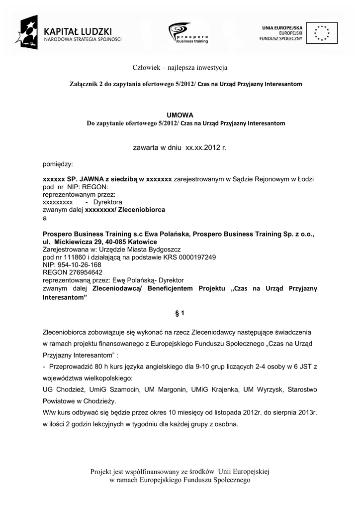 Człowiek – najlepsza inwestycja Załącznik 2 do zapytania ofertowego 5/2012/ Czas na Urząd Przyjazny Interesantom UMOWA Do zapytanie ofertowego 5/2012/ Czas na Urząd Przyjazny Interesantom zawarta w dniu xx.xx.2012 r. pomiędzy: xxxxxx SP. JAWNA z siedzibą w xxxxxxx zarejestrowanym w Sądzie Rejonowym w Łodzi pod nr NIP: REGON: reprezentowanym przez: xxxxxxxxx - Dyrektora zwanym dalej xxxxxxxx/ Zleceniobiorca a Prospero Business Training s.c Ewa Polańska, Prospero Business Training Sp. z o.o., ul. Mickiewicza 29, 40-085 Katowice Zarejestrowana w: Urzędzie Miasta Bydgoszcz pod nr 111860 i działającą na podstawie KRS 0000197249 NIP: 954-10-26-168 REGON 276954642 reprezentowaną przez: Ewę Polańską- Dyrektor zwanym dalej Zleceniodawcą/ Beneficjentem Projektu „Czas na Urząd Przyjazny Interesantom” §1 Zleceniobiorca zobowiązuje się wykonać na rzecz Zleceniodawcy następujące świadczenia w ramach projektu finansowanego z Europejskiego Funduszu Społecznego „Czas na Urząd Przyjazny Interesantom” : - Przeprowadzić 80 h kurs języka angielskiego dla 9-10 grup liczących 2-4 osoby w 6 JST z województwa wielkopolskiego: UG ChodzieŜ, UmiG Szamocin, UM Margonin, UMiG Krajenka, UM Wyrzysk, Starostwo Powiatowe w ChodzieŜy. W/w kurs odbywać się będzie przez okres 10 miesięcy od listopada 2012r. do sierpnia 2013r. w ilości 2 godzin lekcyjnych w tygodniu dla kaŜdej grupy z osobna. Projekt jest współfinansowany ze środków Unii Europejskiej w ramach Europejskiego Funduszu Społecznego Człowiek – najlepsza inwestycja §2 1. Wynagrodzenie za usługę określoną w § 1 wynosi……………………. brutto PLN za godzinę lekcyjną dla grupy 2. Wynagrodzenie za usługę określoną w § 1 Zleceniodawca zapłaci na podstawie faktury VAT wystawionej przez Zleceniobiorcę do 30 dni po podpisaniu umowy. Płatność nastąpi w terminie 90 dni od wystawienia faktury lub w przypadku braku środków na koncie projektu niezwłocznie po ich otrzymaniu. 3. Zleceniodawca upowaŜnia Zleceniobiorcę do wystawiania faktury VAT bez podpisu odbiorcy oraz jednocześnie zastrzega sobie prawo do osobistego odbioru faktury VAT przez osobę upowaŜnioną. 4. Zapłatę traktuje się za dokonaną w dniu uznania rachunku bankowego Zleceniobiorcy. 5. Zleceniobiorca zgadza się poddać kontroli Instytucji Państwowej powołanej do kontroli projektów dofinansowanych ze środków EFS, na jej Ŝyczenie. §3 1. Zleceniodawca ma prawo anulować zlecenie bez konsekwencji finansowych na warunkach określonych w niniejszej umowie. 2. Za anulowanie zlecenia nie uznaje się zmiany daty realizacji zlecenia za zgodą obu stron. 3. Zleceniodawca ma prawo anulować zlecenie w zakresie całości usług w przypadku nie wywiązania się przez zleceniobiorcę z umowy w trakcie jej trwania. §4 1. Zleceniobiorca zapewni do realizacji kursu wykwalifikowaną kadrę lektorów ( minimum 5 letnie doświadczenie w nauczaniu języka angielskiego, potwierdzone stosownymi dyplomami, certyfikatami). 2. Zleceniobiorca przygotuje test początkowy dla uczestników, kwalifikujący do grupy początkującej lub średniozaawansowanej. 3. Zleceniobiorca zapewni dostęp uczestnikom do platformy e- learningowej. 4. Zleceniobiorca dopilnuje aby uczestnicy kursu podpisywali na zajęciach listy obecności dostarczone przez organizatora. 5. Zleceniobiorca poinformuje ( mailowo) organizatora o nieobecności kaŜdego uczestnika na zajęciach. Projekt jest współfinansowany ze środków Unii Europejskiej w ramach Europejskiego Funduszu Społecznego Człowiek – najlepsza inwestycja 6. Zleceniobiorca zobowiązuje się do przeprowadzenie testu końcowego, sprawdzającego poziom wiedzy. 7. Zleceniobiorca zobowiązuje się do wydania certyfikatów potwierdzających udział w kursie. §5 Odpowiedzialność stron z tytułu niewykonania bądź nienaleŜytego wykonania niniejszej umowy wyłączają zdarzenia siły wyŜszej, których nie moŜna było przewidzieć w rozsądnym czasie oraz którym nie moŜna było zapobiec, takie jak: klęski Ŝywiołowe, działania związane z siłami przyrody, stan wojny, strajki, nie dotyczy to strajków pracowników Stron. §6 Wszystkie zmiany i uzupełnienia niniejszej umowy wymagają formy pisemnej pod rygorem niewaŜności. §7 Do wszystkich spraw nieuregulowanych niniejszą umową stosuje się przepisy Kodeksu Cywilnego. Sprawy sporne rozstrzygać będzie Sąd właściwy dla Zleceniobiorcy. §8 Umowę sporządzono w dwóch jednobrzmiących egzemplarzach, po jednym dla kaŜdej ze Stron. Podpis i pieczęć Zleceniodawcy Podpis i pieczęć Zleceniobiorcy Prospero Business Training s.c Projekt jest współfinansowany ze środków Unii Europejskiej w ramach Europejskiego Funduszu Społecznego