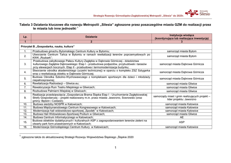 Strategia Rozwoju Górnośląsko-Zagłębiowskiej Metropolii „Silesia” do 2025r. Tabela 3 Działania kluczowe dla rozwoju Metropolii „Silesia” zgłoszone przez poszczególne miasta GZM do realizacji przez te miasta lub inne jednostki 1 Lp. Działanie 1 2 Instytucja wiodąca (koordynująca lub realizująca inwestycję) 3 Priorytet B „Gospodarka, nauka, kultura” 1. 2. 3. 4. 5. 6. 7. 8. 9. 10. 11. 12. 13. 14. 15. 16. 1 Przebudowa gmachu Bytomskiego Centrum Kultury w Bytomiu; Utworzenie Centrum Tańca w Bytomiu w ramach rewitalizacji terenów poprzemysłowych po KWK „Rozbark”; Przebudowa zabytkowego Pałacu Kultury Zagłębia w Dąbrowie Górniczej - dziedzictwa kulturowego Zagłębia Dąbrowskiego: Etap I - przebudowa podjazdów, przybudówek i tarasów przy elewacjach bocznych. Etap II - przebudowa i termomodernizacja budynku; Stworzenie ośrodka akademickiego (uczelni technicznej) w oparciu o kompleks ZSZ Sztygarka wraz z rewitalizacją obiektu w Dąbrowie Górniczej; Budowa Ośrodka Szkolno-Wychowawczego z kompleksem sportowym dla dzieci i młodzieży niepełnosprawnej; Rewitalizacja Radiostacji – Gliwice.eu; Rewaloryzacja Ruin Teatru Miejskiego w Gliwicach; Rozbudowa Palmiarni Miejskiej w Gliwicach; Realizacja przedsięwzięcia „Gospodarcza Brama Śląska Etap I - Uruchomienie Zagłębiowskiej Strefy Gospodarczej – projekt realizowany m.in. przez miasta: Jaworzno, Sosnowiec (oraz gminy: Będzin i Czeladź); Budowa siedziby NOSPR w Katowicach; Budowa Międzynarodowego Centrum Kongresowego w Katowicach; Modernizacja hali widowiskowo-sportowej „Spodek” w Katowicach; Budowa Hali Widowiskowo-Sportowej Podium w Gliwicach; Budowa Centrum Informatycznego w Katowicach; Budowa obiektów dydaktycznych i kulturalnych ASP z zagospodarowaniem terenów zieleni na otwarty park form przestrzennych w Katowicach; Modernizacja Górnośląskiego Centrum Kultury w Katowicach; zgłoszone także do aktualizowanej Strategii Rozwoju Województwa Śląskiego „Śląskie 2020 1 samorząd miasta Bytom samorząd miasta Bytom samorząd miasta Dąbrowa Górnicza samorząd miasta Dąbrowa Górnicza samorząd miasta Dąbrowa Górnicza samorząd miasta Gliwice samorząd miasta Gliwice samorząd miasta Gliwice samorządy miast i gmin realizujących projekt – lider projektu: Jaworzno samorząd miasta Katowice samorząd miasta Katowice samorząd miasta Katowice samorząd miasta Gliwice AE ASP samorząd miasta Katowice Strategia Rozwoju Górnośląsko-Zagłębiowskiej Metropolii „Silesia” do 2025r. Działanie Lp. 1 17. 2 „Kopiec Wyzwolenia” – miejsce rekreacji i tradycji w Piekarach Śląskich; 18. Budowa Biblioteki Akademickiej UŚ i AE w Katowicach; 19. 20. Budowa Wydziału Radia i Telewizji UŚ w Katowicach; Rozbudowa Expo Silesia; Instytucja wiodąca (koordynująca lub realizująca inwestycję) 3 samorząd miasta Piekary Śląskie UŚ AE UŚ Inwestor prywatny Priorytet C „Transport i komunikacja” 21. 22. 23. 24. 25. 26. 27. 28. 29. 30. 31. 32. 33. Reaktywacja Górnośląskiej Kolei Wąskotorowej wraz z rewitalizacją przyległych terenów na cele sportowo-rekreacyjne na terenie miast: Bytomia, Tarnowskich Gór i Miasteczka Śląskiego; Budowa „Bytomskiej Centralnej Trasy Północ-Południe”; Wydłużenie drogi ekspresowej S11 od węzła z autostradą A1 przy lotnisku w Pyrzowicach do Autostrady A4 w Katowicach; Przebudowa drogi DK-94 na odcinku Sosnowiec (przy centrum wystawienniczym EXPOSILESIA) – Dąbrowa Górnicza – Będzin – Czeladź – Siemianowice Śląskie – Piekary Śląskie – Bytom (do drogi DK 79 – ul. Jana Pawła II w Bytomiu) oraz zaliczenie tej drogi do dróg ekspresowych w granicach wymienionych miast; Modernizacja i rozbudowa centrum logistycznego w Gliwicach Porcie; Budowa węzła jeleńskiego na autostradzie A4 na kierunkach Jaworzno–Kraków, Kraków– Jaworzno; Budowa drogi łączącej KSSE Podstrefę Sosnowiecko-Dąbrowską z S-1, Euroterminalem w Sławkowie i DK-94; Budowa zintegrowanego Węzła Przesiadkowego Komunikacji Międzynarodowej: dworzec główny PKP Katowice + dworzec międzynarodowej komunikacji dalekobieżnej w Katowicach; Modernizacja Drogi Krajowej nr 79 (DTŚ Katowice – Dąbrowa Górnicza); Budowa zachodniej obwodnicy Katowic; Zmiana przebiegu Drogi Krajowej nr 81 na odcinku od. ul. Kościuszki do ul. Murckowskiej; Przebudowa ulic: Świętochłowickiej i Łagiewnickiej w Bytomiu – usprawnienie komunikacji miasta z Drogową Trasą Średnicową; Budowa drogi powiatowej (tranzytowej) na terenie miasta Świętochłowice łączącej miasta Bytom i Ruda Śląska; 2 samorząd miasta Bytom samorząd miasta Bytom samorządy miast: Bytom, Chorzów, Katowice GDDKiA samorząd województwa, GDDKiA, samorządy miast: Będzin, Czeladź, Dąbrowa Górnicza, Piekary Śląskie, Siemianowice Śląskie, Sosnowiec, samorząd miasta Gliwice samorząd miasta Jaworzno, GDDKiA samorząd miasta Sosnowiec, GDDKiA samorząd województwa PKP PLK S.A. samorząd miasta Katowice + inwestor prywatny samorząd miasta Katowice samorząd miasta Katowice samorząd miasta Katowice samorząd miasta Bytomia samorząd miasta Świętochłowice Strategia Rozwoju Górnośląsko-Zagłębiowskiej Metropolii „Silesia” do 2025r. Lp. Działanie 1 34. 35. 2 Wdrożenie Śląskiej Karty Usług Publicznych; Odtworzenie funkcji transportowych na Kanale Gliwickim i rzece Odrze; Budowa lądowiska dla helikopterów na potrzeby Centrum Leczenia Oparzeń w Siemianowicach Śląskich; 36. Instytucja wiodąca (koordynująca lub realizująca inwestycję) 3 KZK GOP samorząd województwa, samorząd miasta Siemianowice Śląskie Priorytet D „Środowisko” 37. Rozbudowa Miejskiego Zakładu Przetwarzania Odpadów Komunalnych „Lipówka II” w Dąbrowie Górniczej polegająca na budowie instalacji do produkcji paliwa alternatywnego; samorząd miasta Dąbrowa Górnicza Priorytet E „Warunki zamieszkania i usługi społeczne” 38. 39. 40. 41. 42. 43. 44. 45. Rewitalizacja teren