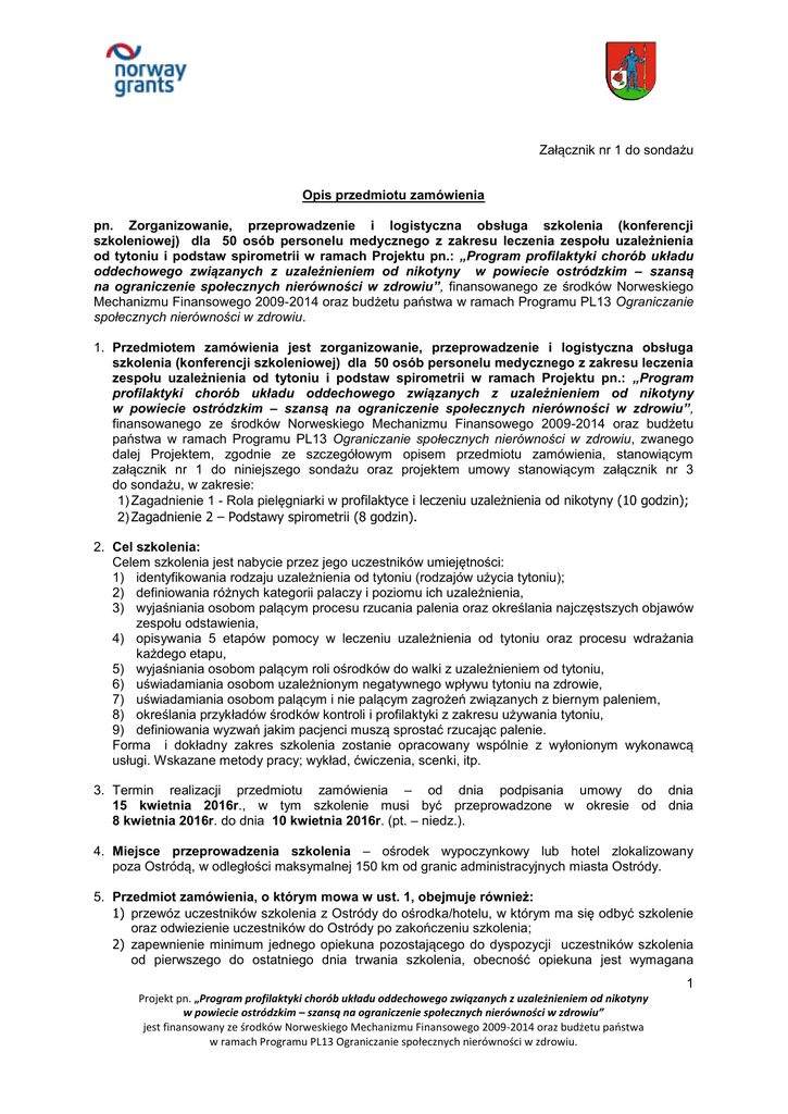 Załącznik nr 1 do sondażu Opis przedmiotu zamówienia pn. Zorganizowanie, przeprowadzenie i logistyczna obsługa szkolenia (konferencji szkoleniowej) dla 50 osób personelu medycznego z zakresu leczenia zespołu uzależnienia od tytoniu i podstaw spirometrii w ramach Projektu pn.: „Program profilaktyki chorób układu oddechowego związanych z uzależnieniem od nikotyny w powiecie ostródzkim – szansą na ograniczenie społecznych nierówności w zdrowiu”, finansowanego ze środków Norweskiego Mechanizmu Finansowego 2009-2014 oraz budżetu państwa w ramach Programu PL13 Ograniczanie społecznych nierówności w zdrowiu. 1. Przedmiotem zamówienia jest zorganizowanie, przeprowadzenie i logistyczna obsługa szkolenia (konferencji szkoleniowej) dla 50 osób personelu medycznego z zakresu leczenia zespołu uzależnienia od tytoniu i podstaw spirometrii w ramach Projektu pn.: „Program profilaktyki chorób układu oddechowego związanych z uzależnieniem od nikotyny w powiecie ostródzkim – szansą na ograniczenie społecznych nierówności w zdrowiu”, finansowanego ze środków Norweskiego Mechanizmu Finansowego 2009-2014 oraz budżetu państwa w ramach Programu PL13 Ograniczanie społecznych nierówności w zdrowiu, zwanego dalej Projektem, zgodnie ze szczegółowym opisem przedmiotu zamówienia, stanowiącym załącznik nr 1 do niniejszego sondażu oraz projektem umowy stanowiącym załącznik nr 3 do sondażu, w zakresie: 1) Zagadnienie 1 - Rola pielęgniarki w profilaktyce i leczeniu uzależnienia od nikotyny (10 godzin); 2) Zagadnienie 2 – Podstawy spirometrii (8 godzin). 2. Cel szkolenia: Celem szkolenia jest nabycie przez jego uczestników umiejętności: 1) identyfikowania rodzaju uzależnienia od tytoniu (rodzajów użycia tytoniu); 2) definiowania różnych kategorii palaczy i poziomu ich uzależnienia, 3) wyjaśniania osobom palącym procesu rzucania palenia oraz określania najczęstszych objawów zespołu odstawienia, 4) opisywania 5 etapów pomocy w leczeniu uzależnienia od tytoniu oraz procesu wdrażania każdego etapu, 5) wyjaśniania osobom palącym roli ośrodków do walki z uzależnieniem od tytoniu, 6) uświadamiania osobom uzależnionym negatywnego wpływu tytoniu na zdrowie, 7) uświadamiania osobom palącym i nie palącym zagrożeń związanych z biernym paleniem, 8) określania przykładów środków kontroli i profilaktyki z zakresu używania tytoniu, 9) definiowania wyzwań jakim pacjenci muszą sprostać rzucając palenie. Forma i dokładny zakres szkolenia zostanie opracowany wspólnie z wyłonionym wykonawcą usługi. Wskazane metody pracy; wykład, ćwiczenia, scenki, itp. 3. Termin realizacji przedmiotu zamówienia – od dnia podpisania umowy do dnia 15 kwietnia 2016r., w tym szkolenie musi być przeprowadzone w okresie od dnia 8 kwietnia 2016r. do dnia 10 kwietnia 2016r. (pt. – niedz.). 4. Miejsce przeprowadzenia szkolenia – ośrodek wypoczynkowy lub hotel zlokalizowany poza Ostródą, w odległości maksymalnej 150 km od granic administracyjnych miasta Ostródy. 5. Przedmiot zamówienia, o którym mowa w ust. 1, obejmuje również: 1) przewóz uczestników szkolenia z Ostródy do ośrodka/hotelu, w którym ma się odbyć szkolenie oraz odwiezienie uczestników do Ostródy po zakończeniu szkolenia; 2) zapewnienie minimum jednego opiekuna pozostającego do dyspozycji uczestników szkolenia od pierwszego do ostatniego dnia trwania szkolenia, obecność opiekuna jest wymagana 1 Projekt pn. „Program profilaktyki chorób układu oddechowego związanych z uzależnieniem od nikotyny w powiecie ostródzkim – szansą na ograniczenie społecznych nierówności w zdrowiu” jest finansowany ze środków Norweskiego Mechanizmu Finansowego 2009-2014 oraz budżetu państwa w ramach Programu PL13 Ograniczanie społecznych nierówności w zdrowiu. również w trakcie przewozu osób na i ze szkolenia; 3) uiszczenie opłaty uzdrowiskowej / klimatycznej za wszystkich uczestników szkolenia (jeśli jest wymagana); 4) wykupienie ubezpieczenia dla każdego uczestnika szkolenia, obejmującego przewóz uczestników na i ze szkolenia oraz całodobowy 3-dniowy pobyt uczestników na szkoleniu w kwocie: minimum 10.000,- zł / 1 uczestnika z tytułu nieszczęśliwych wypadków i ich następstw, minimum 20.000,- zł / 1 uczestnika z tytułu odpowiedzialności cywilnej. 6. W ramach szkolenia Wykonawca zapewni uczestnikom: 1) materiały dydaktyczne dla uczestników szkolenia; 2) minimum dwie publikacje naukowe związane z tematyką szkoleń, typu „Badanie spirometryczne. Zasady wykonywania i interpretacji” W. Lubiński, T. Zielonka, P. Gutkowski, Wydawnictwo Medyczne Górnicki oraz „Relacje i komunikacja w świecie medycznym”, M. Kęsy, Wydawnictwo Uniwersytetu Jagiellońskiego; 3) całodzienne wyżywienie, w skład którego wchodzą: pt.: obiad i kolacja; sob.: śniadanie, obiad i kolacja; niedz.: śniadanie, obiad; pt., sob., niedz.: serwis kawowy podczas zajęć szkoleniowych; 4) zakwaterowanie wszystkich uczestników szkolenia na terenie jednego ośrodka/hotelu, w pokojach maksymalnie : 2, 3 i/lub 4 osobowych, wyposażonych w pełen węzeł sanitarny, tj. minimum w umywalkę, prysznic, wc w każdym pokoju (z całodobowym dostępem do ciepłej wody). Każdy pokój musi być wyposażony w jednoosobowe łóżka z czystą pościelą (wyklucza się łóżka piętrowe), szafy ubraniowe, krzesła i stoliki, TV oraz czajnik bezprzewodowy i szklanki. Wykonawca zapewni uczestnikom szkolenia dostęp do sieci Wi-Fi na terenie ośrodka/hotelu. 7. Wymagania dotyczące ośrodka/hotelu, w którym zostanie zorganizowane i przeprowadzone szkolenie będące przedmiotem zamówienia: Ośrodek/hotel, w którym ma być przeprowadzone szkolenie objęte przedmiotem zamówienia, musi spełniać standardy odpowiadające hotelom minimum **(2 gwiazdkowym), tj. posiadać odpowiednią bazę noclegową i żywieniową (w tym stołówkę) oraz salę wykładową: a) wyposażoną w mów