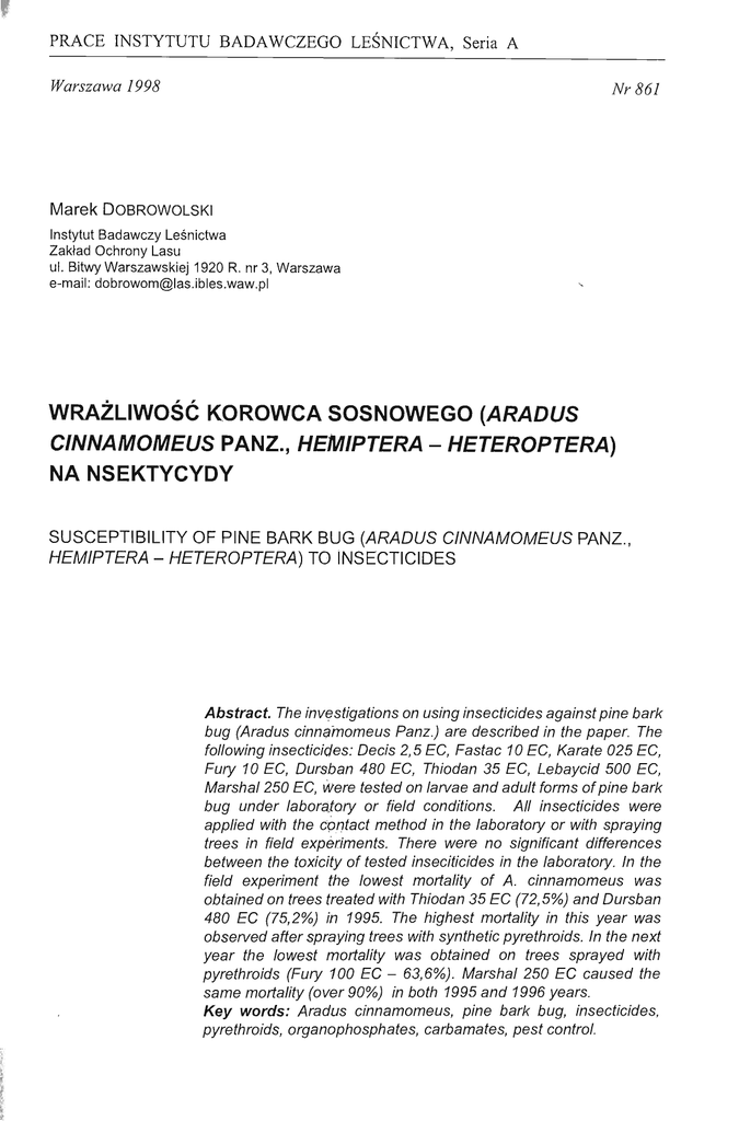 PRACE INSTYTUTU BADAWCZEGO LEŚNICTWA , Seria A Warszawa 1998 Nr 861 Marek DOBROWOLSKI Instytut Badawczy Leśnictwa Ochrony Lasu ul. Bitwy Warszawskiej 1920 R. nr 3, WarszaWa e-mail : [email protected] Zakład WRAŻLIWOŚĆ KOROWCA "~OSNOWEGO (ARADUS CINNA.M OMEUS PANZ., HEMIPTERA - HETEROPTERA) NA NSEKTYCYDY ", SUSCEPTI'BILlTY OF PINE BARK BUG (ARADUS C/NNAMOMEUS PANZ. , HEM/PTERA - HETEROPTERA) TO INSECTICIOES Abstraet. The invęstigations on using insecticides against pine bark bug (Aradus cinnc=/n1OmeUS Panz.) are described in the paper. The following insecticii;tes: Oecis 2,5 EC, Fastac 10 EC, Karate 025 EC, Fury 10 EC, Oursban 480 EC, Thiodan 35 EC, Lebaycid 500 EC, Marshal 250 EC, were tested on larvae and adult forms of pine bark bug under laborei tory or field conditions. Ali insecticides were applied with the cpntact method in the laboratory or with spraying trees in field experiments. There were no significant differences between the toxicity of tested inseciticides in the laboratory. In the field experiment fhe lowest mortality of A cinnamomeus was obtained on trees treated with Thiodan 35 EC (72,5%) and Oursban 480 EC (75,2%) in 1995. The highest mortality in this year was observed after spraying trees with synthetic pyrethroids. In the next year the lowest mortality was obtained on trees sprayed with pyrethroids (Fury 100 EC - 63,6%). Marshal 250 EC caused the same mortality (over 90%) in both 1995 and 1996 years. Key words: Aradus cinnamomeus, pine bark bug, insecticides, pyrethroids, organophosphates, carbamates, pest control. 1. WSTĘP Duże zagęszczenie korowca sosnowego w młodych drzewostanach sosnowych llloże prowadzić do silnych uszkodzeń drzew, a nawet do ich zamierania. Zwykle liczebność tego szkodnika jest w zadowalający sposób redukowana przez zespół różnych drapieżnych pająków i owadów oraz pasożytów jaj, ale w przypadku zaistnienia silniejszych zaburzeń w mechanizmach regulacyjnych biocenoz suchych borów sosnowych występuje konieczność ingerencji ze strony człowieka. Obecnie, spośród wielu metod ochrony lasu przed,szkodliwymi owadami, jedynie zabiegi z użyciem insektycydów wydają się skuteczne w zwalczaniu korowca sosnowego. W literaturze przedmiotu niewiele jest prac poświęconych oddziaływaniu współczesnych insektycydów na tego szkodnika. Prace ANICKOVEJ (1957), MACTET i in. (1955), SCHNAIDERA (1968), BRAMMANIS (1975) zawierały wyniki badań nad insektycydami wycofanymi obecnie z użycia, a opartymi na HCH i DDT. KUTEEV i in. (1977) badali preparat Anthio (formothion), uzyskując wysoką śmiertelność korowca zarówno po opryskach aparaturą naziemną, jak i lotniczą. Nowsze badania HELIOVAARY i in. (1983) obejmowały użycie do ograniczania liczebności korowca lindanu oraz preparatu systemicznego, którego składnikiem aktywnym jest dimethoat (Bi-58), należący do glUpy insektycydów fosforoorganicznych. Ten sam związek stosował również SPEKTOR (1989). Aplikowano go w postaci oprysków lotniczych oraz naziemnych. Uzyskano dużą skuteczność zwalczania sięgającą 90%. VLASENKO (1985, 1986) porównał działanie preparatu Decis (deltametryna) i Bi-58 na korowca sosnowego oraz na inne owady w młodnikach sosnowych na Ukrainie. We wszystkich opisanych badaniach nie przeprowadzano testów mających na celu określenie wartości LDso bądź LC so . Zabiegi wykonywano stosując wysokie dawki preparatów i oplyskiwano przy tym całe drzewa, co zapewne wywoływało znaczne negatywne skutki w objętych zwalczaniem drzewostanach. W niniejszych badaniach podjęto próbę określenia w stosunku do korowca sosnowego wartości LC so dla różnych insektycydów, a także sprawdzono efektywność tych preparatów w walunkach polowych. 2. MATERIAŁY I METODY Badania, prowadzone w latach 1994-1996, obejmowały testy insektycydów na larwach lub imago korowca sosnowego wykonywane w laboratorium i w warunkach terenowych. Materiał biologiczny (larwy różnych stadiów oraz imago korowca sosnowego) do testów laboratoryjnych pozyskano na terenie Nadleśnictwa Skierniewice. Doświadczenia terenowe wykonano w młodniku sosnowym w oddziale 161 leśnictwa Kaczew w Nadleśnictwie Skierniewice. Wrażliwość 131 korowca sosnowego na insektycydy W laboratorimTI testowano insektycydy chemiczne zamIeszczone w poniższym zestawieniu: Insektycydy Składnik czynny Zawartość składnika czynnego % z grupy pyretroidów: Decis 2,5 EC deltametryna 2,5 Fastac 10 EC alfametryna 10 Karate 025 EC cyhalotryna 2,5 Fury 10 EC zetacypermetryna 10 chlorpiryfos 48 endosulfan 35 fention 50 karbosulfan 25 "- z grupy związków fosforoorganicznych : Dursban 480 EC Thiodan płynny Lebaycid 500 EC z grupy karbaminianów: Marshal 250 EC Testy laboratoryjne wykonano metodą kontaktową. Preparaty rozcieńczano za pomocą acetonu uzyskując 5-6 stężeń roztworów. RoztwOly nanoszono na krążki bibuły wyściełającej dno szalek Petri' ego o średnicy 9 cm. Preparat w każdym stężeniu naniesiono na dwa krążki . Po odparowaniu rozpuszczalnika do szalek włożono laIwy LJLs (1994 rok) lub imago i larwy L2/L3 korowca sosnowego (1995 rok), testując je w dwóch powtórzeniach po 15 sztuk na stężenie . W identyczny sposób testowano imagines korowca, przy czym badano działanie dwóch preparatów: Marshal 250 EC i Decis 2,5 EC. Kontrolę stanowiły owady umieszczone na bibule suchej (kontrola sucha) i na bibule zmoczonej czystym acetonem (kontrola acetonowa). Obie kontrole wykonano w dwóch powtórzeniach po 15 sztuk. Śmiertelność owadów zaczęto określać po 24 h od aplikacji powtarzając odczyty przez 3 dni co 24 h. Wyniki opracowano metodą Finney'a (FINNEY 1971) przy użyciu programu POLO-PC firmy LeOra SysteITIS, obliczając WaIiość LC so dla każdego preparatu i dla każdej grupy owadów oddzielnie. Do doświadczeń w czasie badań terenowych użyto wodnych roztworów następuj ących preparatów: - Karate 025 EC, w stężeniu 0,25%, w dawce 100 