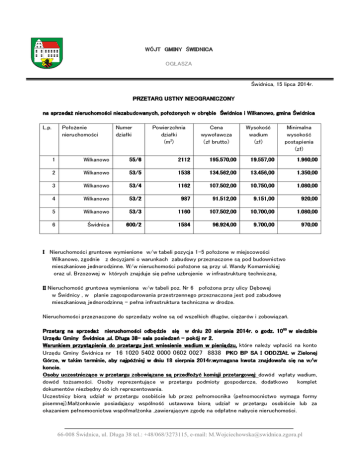 WÓJT GMINY ŚWIDNICA OGŁASZA Świdnica, 15 lipca 2014r. PRZETARG USTNY NIEOGRANICZONY na sprzedaż nieruchomości niezabudowanych, położonych położonych w obrębie Świdnica i Wilkanowo, Wilkanowo, gmina Świdnica L.p. Położenie nieruchomości Numer działki Powierzchnia działki (m2) Cena wywoławcza (zł brutto) Wysokość wadium (zł) Minimalna wysokość postąpienia (zł) 1 Wilkanowo 55/6 2112 195.570,00 19.557,00 19.557,00 1.960,00 2 Wilkanowo 53/5 1538 134.562,00 13.456,00 1.350,00 3 Wilkanowo 53/4 1162 107.502,00 10.750,00 1.080,00 4 Wilkanowo 53/2 987 91.512,00 9.151,00 920,00 5 Wilkanowo 53/3 1160 107.502,00 10.700,00 1.080,00 6 Świdnica 600/2 1584 96.924,00 9.700,00 9.700,00 970,00 I Nieruchomości gruntowe wymienione w/w tabeli pozycja 1-5 położone w miejscowości Wilkanowo, zgodnie z decyzjami o warunkach zabudowy przeznaczone są pod budownictwo mieszkaniowe jednorodzinne. W/w nieruchomości położone są przy ul. Wandy Komarnickiej oraz ul. Brzozowej w których znajduje się pełne uzbrojenie w infrastrukturę techniczną. II Nieruchomość gruntowa wymieniona w/w tabeli poz. Nr 6 położona przy ulicy Dębowej w Świdnicy , w planie zagospodarowania przestrzennego przeznaczona jest pod zabudowę mieszkaniową jednorodzinną – pełna infrastruktura techniczna w drodze. Nieruchomości przeznaczone do sprzedaży wolne są od wszelkich długów, ciężarów i zobowiązań. Przetarg na sprzedaż nieruc nieruchomości uchomości odbędzie się w dniu 20 sierpnia 2014r. o godz. 1000 w siedzibie Urzędu Gminy Świdnica ,ul. Długa 3838- sala posiedzeń – pokój nr 2. Warunkiem przystąpienia do przetargu jest wniesienie wadium w pieniądzu, które należy wpłacić na konto Urzędu Gminy Świdnica nr 16 1020 5402 0000 0602 0027 8838 PKO BP SA I ODDZIAŁ w Zielonej Górze, w takim terminie, terminie, aby najpóźniej w dniu 18 sierpnia 2014r.wymagana kwota znajdowała się na w/w koncie. Osoby uczestniczące w przetargu zobowiązane są przedłożyć komisji komisji przetargowej: przetargowej dowód wpłaty wadium, dowód tożsamości. Osoby reprezentujące w przetargu podmioty gospodarcze, dodatkowo komplet dokumentów niezbędny do ich reprezentowania. Uczestnicy biorą udział w przetargu osobiście lub przez pełnomocnika (pełnomocnictwo wymaga formy pisemnej).Małżonkowie posiadający wspólność ustawowa biorą udział w przetargu osobiście lub za okazaniem pełnomocnictwa współmałżonka ,zawierającym zgodę na odpłatne nabycie nieruchomości. 66-008 Świdnica, ul. Długa 38 tel.: +48/068/3273115, e-mail: [email protected] Przetarg jest ważny bez względu na liczbę uczestników przetargu, jeżeli przynajmniej jeden uczestnik zaoferuje co najmniej jedno postąpienie minimalne powyżej ceny wywoławczej. Wadium wpłacone przez uczestnika przetargu, który przetarg wygra zostanie zaliczone na poczet ceny nabycia nieruchomości. Pozostałym uczestnikom przetargu wadium zostanie zwrócone niezwłocznie po rozstrzygnięciu przetargu przelewem na podane konto bankowe. Wylicytowana cena sprzedaży nieruchomości podlega zapłacie do czasu zawarcia aktu notarialnego, którego termin zostanie ustalony najpóźniej w ciągu 21 dni od rozstrzygnięcia przetargu. Zgodnie z ustawą z dnia 11 marca 2004r.o podatku od towarów i usług (Dz. U. 2011r.Nr 177,poz.1054) cena sprzedaży zawiera podatek od towarów i usług w stawce 23%. Uchylenie się kandydata na nabywcę wyłonionego w drodze przetargu od podpisania aktu notarialnego w wyznaczonym terminie spowoduje przepadek wpłaconego wadium na rzecz Gminy Świdnica. Koszty sporządzenia aktu notarialnego oraz opłaty sądowe w całości ponosi nabywca. Ewentualne okazanie granic nieruchomości następuje staraniem i na koszt nabywcy. Przetarg zostanie przeprowadzony zgodnie z rozporządzeniem Rady Ministrów z dnia 14 września 2004r.w sprawie sposobu i trybu przeprowadzania przetargów oraz rokowań na zbycie nieruchomości (Dz. U. Nr 207, poz.2108 z późn.zm.). Ogłaszający ma prawo z uzasadnionej przyczyny do odwołania ogłoszonego przetargu w formie właściwej dla jego ogłoszenia. Ogłoszenie o przetargu zostaje zamieszczone na tablicy ogłoszeń w siedzibie Urzędu gminy Świdnica ,na tablicy ogłoszeń w miejscowościach Wilkanowo i Świdnica oraz na stronie internetowej www.bip.swidnica.zgora.pl .Wyciąg z ogłoszenia o przetargu został umieszczony w prasie lokalnej. Dodatkowe informacje można uzyskać pod numerami telefonów: 683273115, 683273118 wew. 145 codziennie w godzinach od 800 do 1500. 66-008 Świdnica, ul. Długa 38 tel.: +48/068/3273115, e-mail: [email protected]