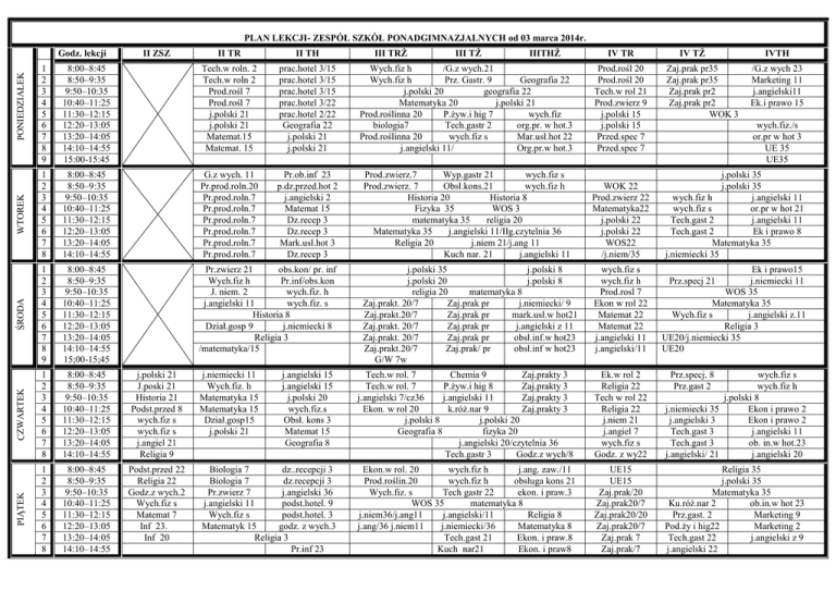 PLAN LEKCJI- ZESPÓŁ SZKÓŁ PONADGIMNAZJALNYCH od 03 marca 2014r. III TRŻ III TŻ IIITHŻ IV TR IV TŻ IVTH 8:00–8:45 8:50–9:35 9:50–10:35 10:40–11:25 11:30–12:15 12:20–13:05 13:20–14:05 14:10–14:55 15:00-15:45 Tech.w roln. 2 Tech.w roln 2 Prod.rośl 7 Prod.rośl 7 j.polski 21 j.polski 21 Matemat.15 Matemat. 15 prac.hotel 3/15 prac.hotel 3/15 prac.hotel 3/15 prac.hotel 3/22 prac.hotel 2/22 Geografia 22 j.polski 21 j.polski 21 Wych.fiz h /G.z wych.21 Wych.fiz h Prz. Gastr. 9 Geografia 22 j.polski 20 geografia 22 Matematyka 20 j.polski 21 Prod.roślinna 20 P.żyw.i hig 7 wych.fiz biologia7 Tech.gastr 2 org.pr. w hot.3 Prod.roślinna 20 wych.fiz s Mar.usł.hot 22 j.angielski 11/ Org.pr.w hot.3 Prod.rośl 20 Prod.rośl 20 Tech.w rol 21 Prod.zwierz 9 j.polski 15 j.polski 15 Przed.spec 7 Przed.spec 7 1 2 3 4 5 6 7 8 8:00–8:45 8:50–9:35 9:50–10:35 10:40–11:25 11:30–12:15 12:20–13:05 13:20–14:05 14:10–14:55 G.z wych. 11 Pr.prod.roln.20 Pr.prod.roln.7 Pr.prod.roln.7 Pr.prod.roln.7 Pr.prod.roln.7 Pr.prod.roln.7 Pr.prod.roln.7 Pr.ob.inf 23 p.dz.przed.hot 2 j.angielski 2 Matemat 15 Dz.recep 3 Dz.recep 3 Mark.usł.hot 3 Dz.recep 3 Prod.zwierz.7 Wyp.gastr 21 wych.fiz s Prod.zwierz. 7 Obsł.kons.21 wych.fiz h Historia 20 Historia 8 Fizyka 35 WOS 3 matematyka 35 religia 20 Matematyka 35 j.angielski 11/IIg.czytelnia 36 Religia 20 j.niem 21/j.ang 11 Kuch nar. 21 j.angielski 11 WOK 22 Prod.zwierz 22 Matematyka22 j.polski 22 j.polski 22 WOS22 /j.niem/35 j.polski 35 j.polski 35 wych.fiz h j.angielski 11 wych.fiz s or.pr w hot 21 Tech.gast 2 j.angielski 11 Tech.gast 2 Ek i prawo 8 Matematyka 35 j.niemiecki 35 1 2 3 4 5 6 7 8 9 8:00–8:45 8:50–9:35 9:50–10:35 10:40–11:25 11:30–12:15 12:20–13:05 13:20–14:05 14:10–14:55 15;00-15;45 Pr.zwierz 21 obs.kon/ pr. inf Wych.fiz h Pr.inf/obs.kon J. niem. 2 wych.fiz. h j.angielski 11 wych.fiz. s Historia 8 Dział.gosp 9 j.niemiecki 8 Religia 3 /matematyka/15 wych.fiz s wych.fiz h Prod.rosl 7 Ekon w rol 22 Matemat 22 Matemat 22 j.angielski 11 j.angielski/11 Ek i prawo15 j.niemiecki 11 WOS 35 Matematyka 35 Wych.fiz s j.angielski z.11 Religia 3 UE20/j.niemiecki 35 UE20 1 2 3 4 5 6 7 8 8:00–8:45 8:50–9:35 9:50–10:35 10:40–11:25 11:30–12:15 12:20–13:05 13:20–14:05 14:10–14:55 j.polski 21 J.poski 21 Historia 21 Podst.przed 8 wych.fiz s wych.fiz s j.angiel 21 Religia 9 j.niemiecki 11 Wych.fiz. h Matematyka 15 Matematyka 15 Dział.gosp15 j.polski 21 1 2 3 4 5 6 7 8 8:00–8:45 8:50–9:35 9:50–10:35 10:40–11:25 11:30–12:15 12:20–13:05 13:20–14:05 14:10–14:55 Podst.przed 22 Religia 22 Godz.z wych.2 Wych.fiz s Matemat 7 Inf 23. Inf 20 Biologia 7 dz..recepcji 3 Biologia 7 dz.recepcji 3 Pr.zwierz 7 j.angielski 36 j.angielski 11 podst.hotel. 9 Wych.fiz s podst.hotel. 3 Matematyk 15 godz. z wych.3 Religia 3 Pr.inf 23 PONIEDZIAŁEK 1 2 3 4 5 6 7 8 9 WTOREK II TH ŚRODA II TR CZWARTEK II ZSZ PIĄTEK Godz. lekcji j.angielski 15 j.angielski 15 j.polski 20 wych.fiz.s Obsł. kons 3 Matemat 15 Geografia 8 j.polski 35 j.polski 8 j.polski 20 j.polski 8 religia 20 matematyka 8 Zaj.prakt. 20/7 Zaj.prak pr j.niemiecki/ 9 Zaj.prakt.20/7 Zaj.prak pr mark.usł.w hot21 Zaj.prakt. 20/7 Zaj.prak pr j.angielski z 11 Zaj.prakt. 20/7 Zaj.prak pr obsł.inf.w hot23 Zaj.prakt.20/7 Zaj.prak/ pr obsł.inf w hot23 G/W 7w Zaj.prak pr35 Zaj.prak pr35 Zaj.prak pr2 Zaj.prak pr2 WOK 3 /G.z wych 23 Marketing 11 j.angielski11 Ek.i prawo 15 wych.fiz./s or.pr w hot 3 UE 35 UE35 Prz.specj 21 Tech.w rol. 7 Chemia 9 Zaj.prakty 3 Tech.w rol. 7 P.żyw.i hig 8 Zaj.prakty 3 j.angielski 7/cz36 j.angielski 11 Zaj.prakty 3 Ekon. w rol 20 k.róż.nar 9 Zaj.prakty 3 j.polski 8 j.polski 20 Geografia 8 fizyka 20 j.angielski 20/czytelnia 36 Tech.gastr 3 Godz.z wych/8 Ek.w rol 2 Religia 22 Tech w rol 22 Religia 22 j.niem 21 j.angiel 7 wych.fiz s Godz. z wy22 Prz.specj. 8 Prz.gast 2 wych.fiz s wych.fiz h j.polski 8 j.niemiecki 35 Ekon i prawo 2 j.angielski 3 Ekon i prawo 2 Tech.gast 3 j.angielski 11 Tech.gast 3 ob. in.w hot.23 j.angielski/ 21 j.angielski 20 Ekon.w rol. 20 wych.fiz h j.ang. zaw./11 Prod.roślin.20 wych.fiz h obsługa kons 21 Wych.fiz. s Tech gastr 22 ekon. i praw.3 WOS 35 matematyka 8 j.niem36/j.ang11 j.angielski/11 Religia 8 j.ang/36 j.niem11 j.niemiecki/36 Matematyka 8 Tech.gast 21 Ekon. i praw.8 Kuch nar21 Ekon. i praw8 UE15 UE15 Zaj.prak/20 Zaj.prak20/7 Zaj.prak20/20 Zaj.prak20/7 Zaj.prak 7 Zaj.prak/7 Religia 35 j.polski 35 Matematyka 35 Ku.róż.nar 2 ob.in.w hot 23 Prz.gast. 2 Marketing 9 Pod.ży i hig22 Marketing 2 Tech.gast 22 j.angielski z 9 j.angielski 22
