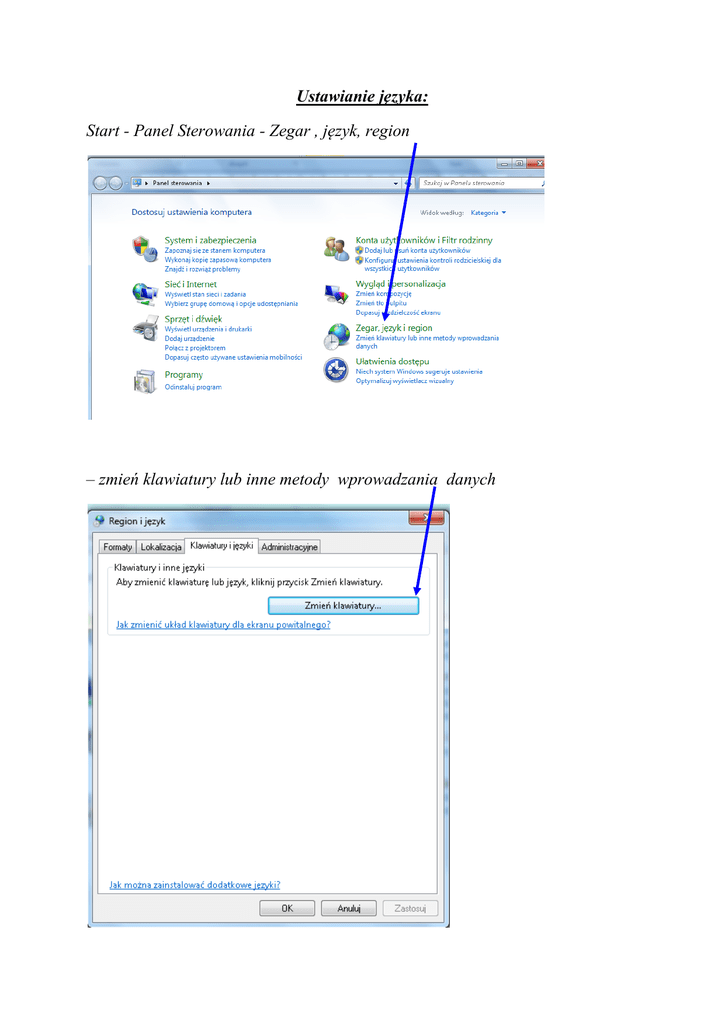 Ustawianie języka: Start - Panel Sterowania - Zegar , język, region – zmień klawiatury lub inne metody wprowadzania danych