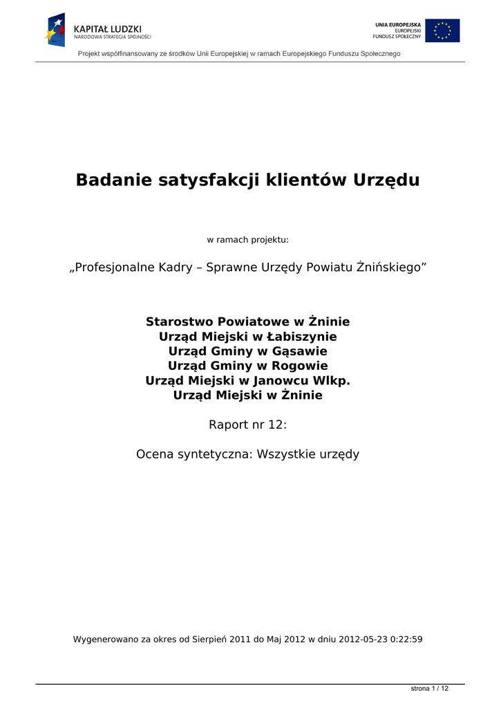 Badanie satysfakcji klientów Urzędu w ramach projektu: „Profesjonalne Kadry – Sprawne Urzędy Powiatu Żnińskiego” Starostwo Powiatowe w Żninie Urząd Miejski w Łabiszynie Urząd Gminy w Gąsawie Urząd Gminy w Rogowie Urząd Miejski w Janowcu Wlkp. Urząd Miejski w Żninie Raport nr 12: Ocena syntetyczna: Wszystkie urzędy Wygenerowano za okres od Sierpień 2011 do Maj 2012 w dniu 2012-05-23 0:22:59 strona 1 / 12 Spis wykresów Część I - OCENA JAKOŚCI OBSŁUGI PODCZAS OSTATNIEJ WIZYTY W 6 URZĘDACH 1. Średnie oceny satysfakcji klientów wg pięciu ocenianych obszarów ........................................ 1.1. Wizerunek urzędu i urzędnika ..................................................................................................................... 1.2. Troska o klienta i indywidualne podejście do klienta ................................................................................... 1.3. Gotowość pomocy i szybkość obsługi .......................................................................................................... 1.4. Kompetencje urzędników - wiedza i umiejętności ........................................................................................ 1.5. Rzetelność obsługi – profesjonalizm i staranność obsługi ............................................................................ 3 3 3 3 4 4 Część II - KOMPLEKSOWA OCENA JAKOŚCI ŚWIADCZONYCH USŁUG W 6 URZĘDACH 2. Średnie oceny uzyskane w badaniu satysfakcji klientów ......................................................... 5 2.1. Średnie oceny ostatnio załatwianej sprawy ................................................................................................ 5 2.2. Średnie oceny (satysfakcji ogólnej, lojalności i urzędu idealnego) ............................................................. 5 Część III – METRYKA KLIENTA 3. Informacje o klientach wypełniających ankietę ...................................................................... 6 3.1. Płeć klientów ................................................................................................................................................6 3.2. Wiek klientów .............................................................................................................................................. 6 3.3. Wykształcenie klientów ............................................................................................................................... 6 3.4. Status zawodowy klientów .......................................................................................................................... 7 3.5. Liczba wypełnionych ankiet według rodzaju ankiety ................................................................................... 7 Część IV – REKOMENDACJE I WNIOSKI Ze względu na metodykę przeliczania ilości zebranych ocen w skali od 1 do 6 na ocenę procentową poszczególnych rekordów, dane na wykresach mogą być obarczone błędem +/- 2,5 %. strona 2 / 12 Część I - OCENA JAKOŚCI OBSŁUGI PODCZAS OSTATNIEJ WIZYTY W 6 URZĘDACH 1. Średnie oceny satysfakcji klientów wg pięciu ocenianych obszarów 1.1. Wizerunek urzędu i urzędnika 1.2. Troska o klienta i indywidualne podejście do klienta 1.3. Gotowość pomocy i szybkość obsługi strona 3 / 12 1.4. Kompetencje urzędników - wiedza i umiejętności 1.5. Rzetelność obsługi – profesjonalizm i staranność obsługi strona 4 / 12 Część II - KOMPLEKSOWA OCENA JAKOŚCI ŚWIADCZONYCH USŁUG W 6 URZĘDACH 2. Średnie oceny uzyskane w badaniu satysfakcji klientów 2.1. Średnie oceny ostatnio załatwianej sprawy 2.2. Średnie oceny (satysfakcji ogólnej, lojalności i urzędu idealnego) strona 5 / 12 Część III – METRYKA KLIENTA 3. Informacje o klientach wypełniających ankietę 3.1. Płeć klientów 3.2. Wiek klientów 3.3. Wykształcenie klientów strona 6 / 12 3.4. Status zawodowy klientów 3.5 Liczba wypełnionych ankiet według rodzaju ankiety strona 7 / 12 Cześć IV – REKOMENDACJE I WNIOSKI Raport nr 12: Ocena syntetyczna: Wszystkie urzędy, stanowi podsumowanie przeprowadzonego w okresie od 1 sierpnia 2011r. do 22 maja 2012r. drugiego badania satysfakcji klientów w 6 Urzędach biorących udział w projekcie „Profesjonalne Kadry – Sprawne Urzędu Powiatu Żnińskiego”: L.P. Jednostka Samorządu Terytorialnego 1. Starostwo Powiatowe Liczba ankiet w wersji papierowej Liczba ankiet w wersji elektronicznej Razem (wykładana) (internetowa) 187 79 266 Liczba ankiet 2. w Żninie Urząd Miejski 177 32 209 3. w Łabiszynie Urząd Gminy 134 21 155 4. w Gąsawie Urząd Gminy 114 18 132 5. w Rogowie Urząd Miejski 170 26 196 6. w Janowcu Wlkp. Urząd Miejski 166 73 239 948 249 1 197 w Żninie Razem Liczba ankiet Poniższe rekomendacje zostały opracowane na podstawie uśrednionych ocen jakości obsługi wśród klientów 6 Urzędów według ostatnio załatwianej sprawy w Urzędzie w okresie 11 miesięcy. 1. Na podstawie analizy wykresów w Części III – METRYKA KLIENTA i powyższej tabeli można stwierdzić, że zebrane opinie od 1 197 respondentów pochodzą z 2 źródeł pomiaru: ankiety papierowej wykładanej w 6 Urzędach (948 sztuk) oraz elektronicznej - umieszczonej na stronach oficjalnych 6 Urzędów w formie baneru odsyłającego do strony www.pokl.znin.pl (249 sztuk). Statystyka strona 8 / 12 wypełnionych ankiet świadczy, że przeważającą drogą wyrażania opinii przez klientów we wszystkich Urzędach była ankieta papierowa (79 %), a w mniejszym stopniu ankieta elektroniczna (21%). W badaniu wzięła udział nieznacznie większa populacja mężczyzn (56 %) niż kobiet (44 %). Zdecydowaną większość wypowiadających się osób stanowiły osoby pracujące (70 %), następnie: emeryci, renciści i osoby nie pracujące (17 %) oraz w mniejszości: grupa uczniów i studentów (13 %). Status zawodowy respondentów ma przełożenie na wiek badanych, tj. najwię