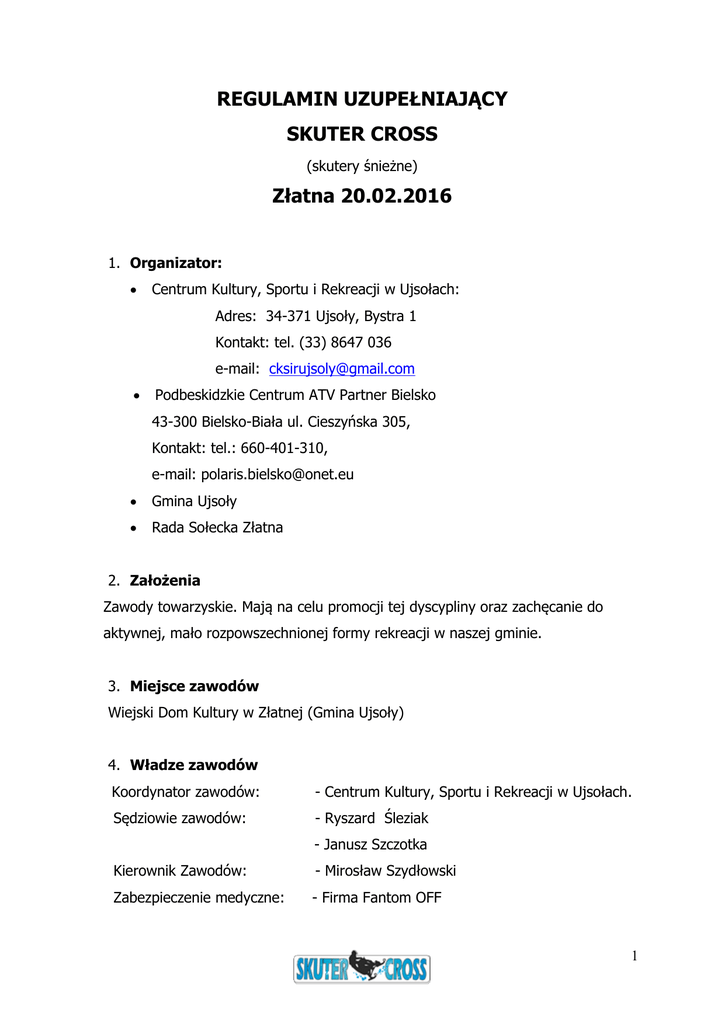 REGULAMIN UZUPEŁNIAJĄCY SKUTER CROSS (skutery śnieżne) Złatna 20.02.2016 1. Organizator: Centrum Kultury, Sportu i Rekreacji w Ujsołach: Adres: 34-371 Ujsoły, Bystra 1 Kontakt: tel. (33) 8647 036 e-mail: [email protected] Podbeskidzkie Centrum ATV Partner Bielsko 43-300 Bielsko-Biała ul. Cieszyńska 305, Kontakt: tel.: 660-401-310, e-mail: [email protected] Gmina Ujsoły Rada Sołecka Złatna 2. Założenia Zawody towarzyskie. Mają na celu promocji tej dyscypliny oraz zachęcanie do aktywnej, mało rozpowszechnionej formy rekreacji w naszej gminie. 3. Miejsce zawodów Wiejski Dom Kultury w Złatnej (Gmina Ujsoły) 4. Władze zawodów Koordynator zawodów: - Centrum Kultury, Sportu i Rekreacji w Ujsołach. Sędziowie zawodów: - Ryszard Śleziak - Janusz Szczotka Kierownik Zawodów: - Mirosław Szydłowski Zabezpieczenie medyczne: - Firma Fantom OFF 1 5. Zasady rozgrywania zawodów Eliminacje: Charakter eliminacji będzie uzależniony od ilości zgłoszeń. Będzie przeprowadzona tzw. czasówka lub wyścig w grupach. Pierwsze miejsce będzie premiowane awansem do biegu finałowego. Finały: (crosscountry) Zawody odbywać się będą w kategorii skuterów śnieżnych. Zawodnicy zaczynają wyścig ze wspólnego startu na wyłączonym silniku. Koniec wyścigu jest sygnalizowany przez sędziego mety po upływie 60 minut. Zawodnik znajdujący się na trasie po upływie limitu czasu ma prawo do dokończenia tego okrążenia i będzie ono mu zaliczone do końcowej klasyfikacji. Zawodnicy są klasyfikowani na podstawie ilości pokonanych okrążeń trasy, przy równej ich ilości liczy się czas pokonania wszystkich okrążeń. 6. Start Sobota 20.02.2016 r. godz. 10.00 Zawodnicy są zobowiązani do stawienia się na miejsce startu 10 min. przed rozpoczęciem biegu i wyłączyć silnik. Zawodnicy ustawieni na jednej linii wyznaczonej przez startera na znak dobiegają do pojazdów. 7. Zgłoszenia udziału w zawodach 7.1. Swój udział można zgłaszać w kategorii skuter śnieżny. 7.2. Przyjmowanie zgłoszeń na adres e-mail: [email protected], telefonicznie pod nr: (33) 8647 036 lub bezpośrednio w Biurze CKSiRu. 7.3. Zgłoszenie musi zawierać imię i nazwisko, nr telefonu, e-mail, kraj pochodzenia. 8. Wpisowe 8.1. Wpisowe umożliwiające udział w zawodach wynosi: 150 zł (płatne do 15 lutego 2016 r.) 200 zł (płatne od 16 lutego do dnia zawodów) 2 Kwota obejmuje m.in.: wyżywienie zawodników, nr. startowe, przygotowanie logistyczne tras, nagrody rzeczowe i puchary, obsługę sędziowską, techniczną i medyczną. 8.2. Wpisowe wymienione w terminie w pkt. 8.1 należy wpłacić na konto Centrum Kultury, Sportu i Rekreacji w Ujsołach: nr rachunku 92 8125 1018 0006 1476 2000 0010 Bank Spółdzielczy w Rajczy, oddz. w Ujsołach, tytuł przelewu: „(imię i nazwisko)” – wpisowe SKUTERCROSS 2016 lub w bezpośrednio w kasie CKSiRu. W przypadku przelewu należy przesłać potwierdzenie wpłaty drogą elektroniczną na e-maila: [email protected] lub faxem pod nr (33) 8647 036 (biuro CKSiR). 8.3. Kartę zgłoszenia zawodnika można pobrać ze strony www.skutercross.com.pl, lub bezpośrednio w biurze Centrum Kultury, Sportu i Rekreacji w Ujsołach. 8.4. Wypełnioną kartę zgłoszenia zawodnika należy złożyć w Gminnym Ośrodku Kultury w Ujsołach lub w dniu zawodów w biurze organizacyjnym albo skanem na adres e-mail [email protected]. 9. Ubezpieczenie Zawody są ubezpieczone od odpowiedzialności cywilnej. Organizator nie odpowiada za ewentualne straty i szkody w stosunku do zawodników i ich sprzętu jak i szkody oraz straty spowodowane bezpośrednio w stosunku do osób trzecich i ich mienia. 10. Nagrody Przewidziane są puchary do trzeciego miejsca oraz nagrody rzeczowe. Pozostali zawodnicy otrzymają okolicznościowy dyplom za udział w zawodach. Dla wszystkich uczestników będzie przygotowany poczęstunek (obiad i napoje). 11. Postanowienia końcowe - Organizator zastrzega sobie prawo dokonywania zmian oraz ostatecznej interpretacji regulaminu. - Organizator nie zwraca wpisowego w przypadku nie stawienia się zawodnika do zawodów. 3 - W przypadku braku możliwości przeprowadzenia zawodów ze względu na niekorzystne warunki atmosferyczne (brak śniegu) zawody mogą zostać przeniesione na inny termin bądź odwołane. - Wpisowe w przypadku odwołania zawodów zostanie zwrócone zawodnikom. - W dniu imprezy zawodnik zobowiązany jest do zgłoszenia się w biurze zawodów celem potwierdzenia udziału oraz złożenia w oryginale własnoręcznym podpisem kartę zawodnika, regulaminu oraz oświadczenia o stanie zdrowia i trzeźwości. - Gąsienica pojazdu musi pozostać czysta. - Zawodnicy muszą być wyposażeni w odpowiedni ubiór (kask, rękawiczki, ochraniacze wszelkiego rodzaju, gogle ochronne). - Zawodnicy muszą posiadać zrywkę bezpieczeństwa – brak tej opcji powoduje automatyczną dyskwalifikację zawodnika. …………………………… Podpis zawodnika 4 REGULAMIN ZAWODÓW Nazwa imprezy: „SKUTER CROSS” (amatorskie zawody skuterów śnieżnych) Miejsce i termin imprezy: ZŁATNA 20.02.2016 r. 20.02.2016 (sobota) 1. Biuro zawodów: od godz. 8.30 do końca zawodów (ok. godz. 17.00) 2. Odprawa zawodników godz.9.30 3. Start: 10.00 – start zawodników na skuterach śnieżnych (eliminacje) 13.00 – zakończenie eliminacji W przypadku jakiejś zmiany zostanie ona ogłoszona na odprawie. 13.00 -14.00 – Przerwa Obiadowa 4. Finały: 14. 15 – Start biegu finałowego 4. Ogłoszenie wyników rozdanie nagród 15.40 – ogłoszenie wyników finałów 5