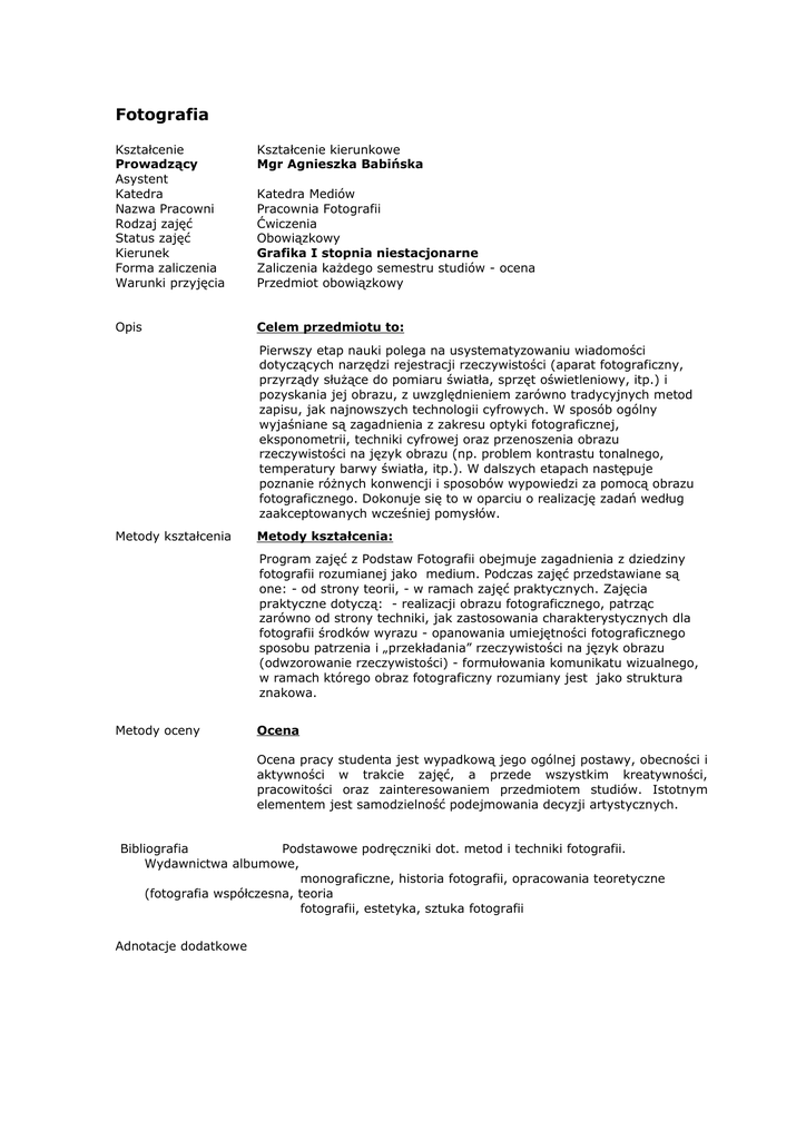 Fotografia Kształcenie Prowadzący Asystent Katedra Nazwa Pracowni Rodzaj zajęć Status zajęć Kierunek Forma zaliczenia Warunki przyjęcia Kształcenie kierunkowe Mgr Agnieszka Babińska Opis Celem przedmiotu to: Katedra Mediów Pracownia Fotografii Ćwiczenia Obowiązkowy Grafika I stopnia niestacjonarne Zaliczenia każdego semestru studiów - ocena Przedmiot obowiązkowy Pierwszy etap nauki polega na usystematyzowaniu wiadomości dotyczących narzędzi rejestracji rzeczywistości (aparat fotograficzny, przyrządy służące do pomiaru światła, sprzęt oświetleniowy, itp.) i pozyskania jej obrazu, z uwzględnieniem zarówno tradycyjnych metod zapisu, jak najnowszych technologii cyfrowych. W sposób ogólny wyjaśniane są zagadnienia z zakresu optyki fotograficznej, eksponometrii, techniki cyfrowej oraz przenoszenia obrazu rzeczywistości na język obrazu (np. problem kontrastu tonalnego, temperatury barwy światła, itp.). W dalszych etapach następuje poznanie różnych konwencji i sposobów wypowiedzi za pomocą obrazu fotograficznego. Dokonuje się to w oparciu o realizację zadań według zaakceptowanych wcześniej pomysłów. Metody kształcenia Metody kształcenia: Program zajęć z Podstaw Fotografii obejmuje zagadnienia z dziedziny fotografii rozumianej jako medium. Podczas zajęć przedstawiane są one: - od strony teorii, - w ramach zajęć praktycznych. Zajęcia praktyczne dotyczą: - realizacji obrazu fotograficznego, patrząc zarówno od strony techniki, jak zastosowania charakterystycznych dla fotografii środków wyrazu - opanowania umiejętności fotograficznego sposobu patrzenia i „przekładania” rzeczywistości na język obrazu (odwzorowanie rzeczywistości) - formułowania komunikatu wizualnego, w ramach którego obraz fotograficzny rozumiany jest jako struktura znakowa. Metody oceny Ocena Ocena pracy studenta jest wypadkową jego ogólnej postawy, obecności i aktywności w trakcie zajęć, a przede wszystkim kreatywności, pracowitości oraz zainteresowaniem przedmiotem studiów. Istotnym elementem jest samodzielność podejmowania decyzji artystycznych. Bibliografia Podstawowe podręczniki dot. metod i techniki fotografii. Wydawnictwa albumowe, monograficzne, historia fotografii, opracowania teoretyczne (fotografia współczesna, teoria fotografii, estetyka, sztuka fotografii Adnotacje dodatkowe